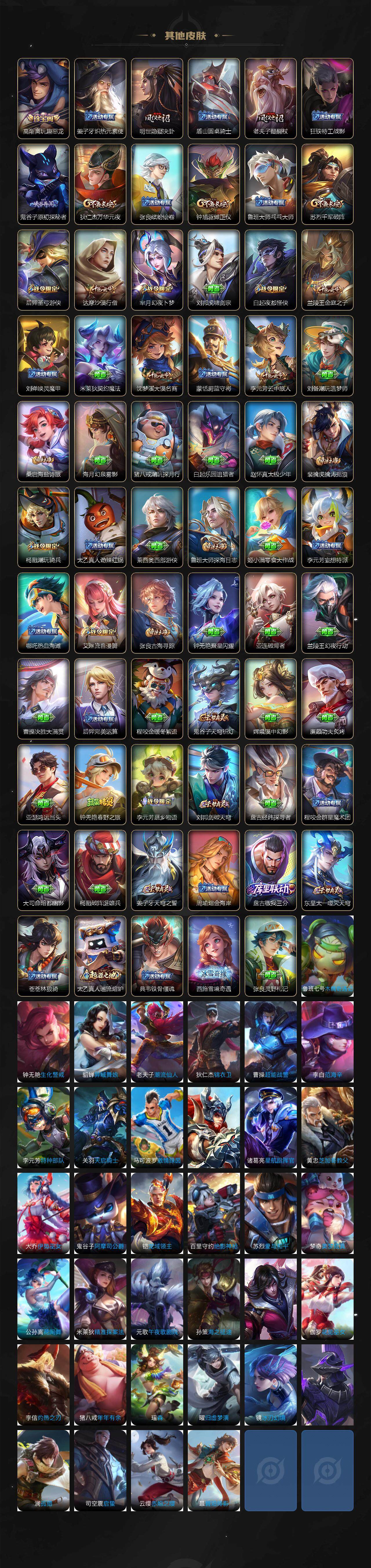 【限定皮肤】:蒙犽顽岩魄,姜子牙天穹之誓,杨戬破阵退雄兵,狄仁杰阴阳师,赵云皇家上将,庄周高山流水,高渐离玩趣恶龙,扁鹊奇幻香踪,白起夜都怪侠,芈月幻夜卜梦,元歌无心,狄仁杰魔术师,狄仁杰万华元夜,达摩沙漠行僧,项羽海滩派对,老夫子醍醐杖,露娜一生所爱,韩信傲雪梅枪,兰陵王金庭之子,孙悟空大圣娶亲,孙悟空孙行者,后羿圣弓游侠,李元芳云中旅人,钟馗驱傩正仪,杨戬潮玩骑兵,女娲朔望之晖,干将莫邪真爱魔法,鬼谷子原初探秘者,鬼谷子五谷丰年,黄忠火炮绅士,铠青龙志,苏烈千军破阵,沈梦溪大漠名商,沈梦溪匿光破解者,明世隐疑决卦,明世隐吟游魔法,裴擒虎李小龙,裴擒虎擒涛扼浪,云中君纤云弄巧,上官婉儿梁祝,嫦娥拒霜思,鲁班大师探海日志,桑启海盐诗旅,艾琳流音漫舞,司空震地狱燃心,阿古朵江河有灵,张良古海寻踪,蒙恬荣光圣徽,鬼谷子天穹祈灯,伽罗琥珀纪元,姬小满妄想食味,鲁班七号蔬乡物语,李元芳蔬乡物语,刘邦剑破天穹,程咬金群星魔术团,芈月浮光幕影,周瑜熔金海岸