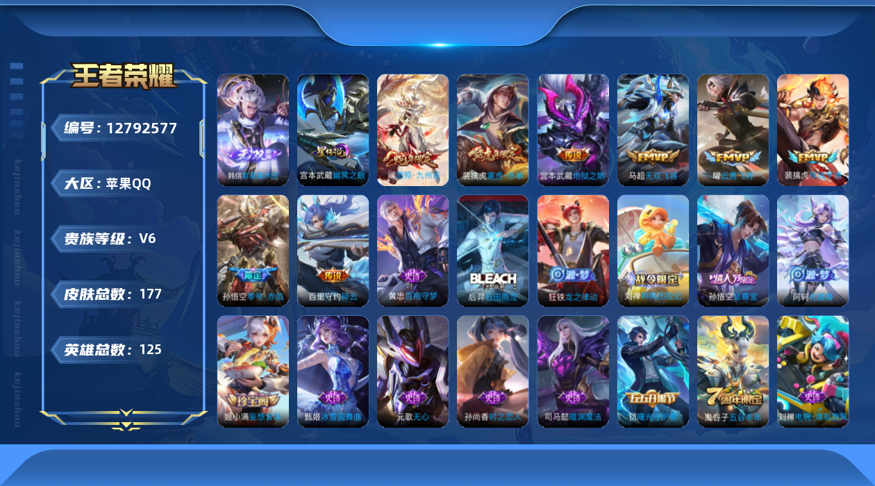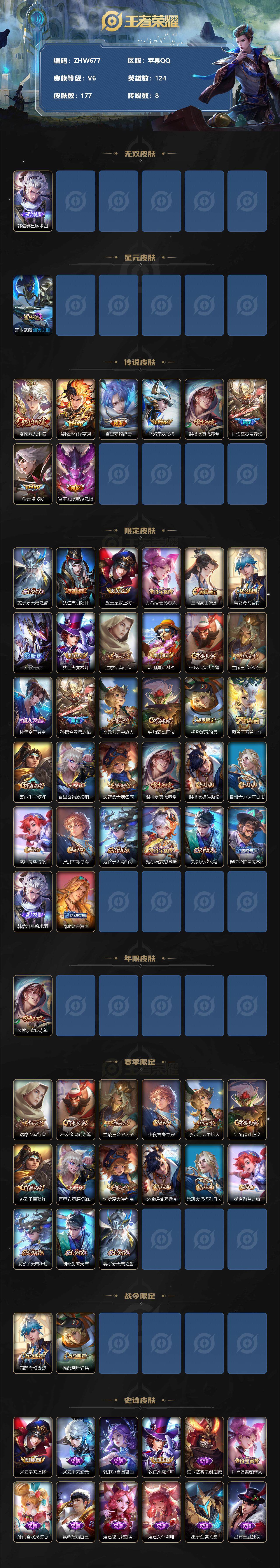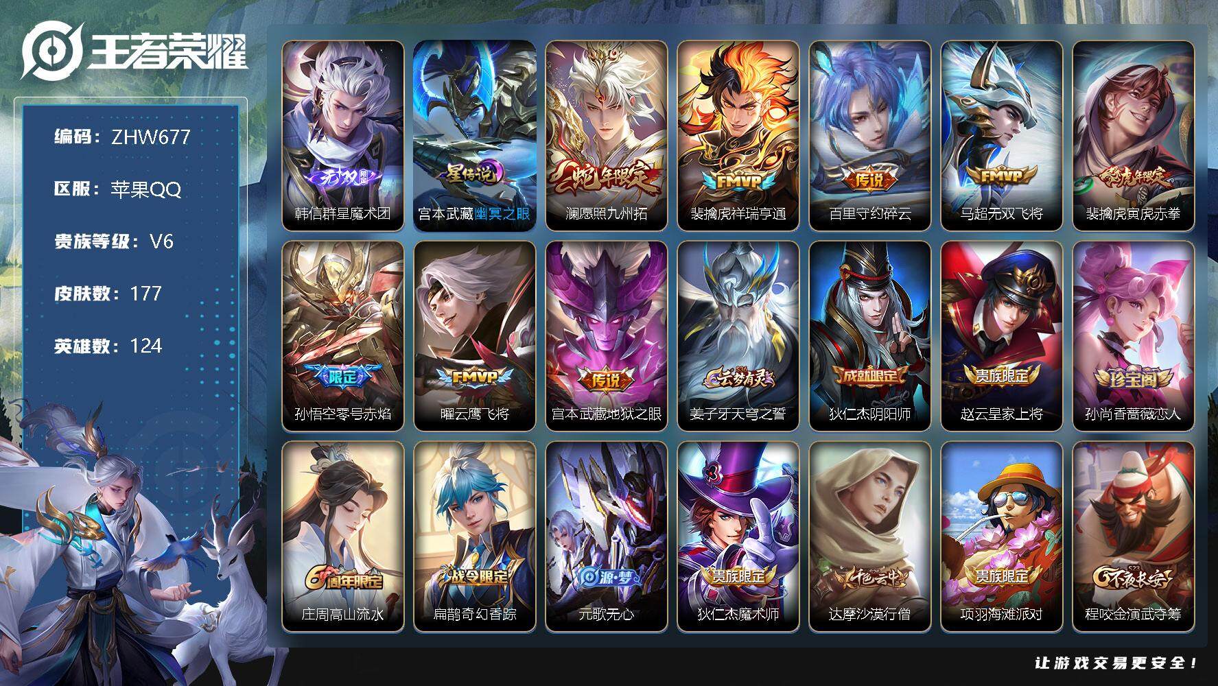 [12792577]【特价急出/详情看图/41段打野】:苹果Q-V6-至尊星耀IV段位-124英雄-177皮肤-1无双-1星元-8传说-37史诗