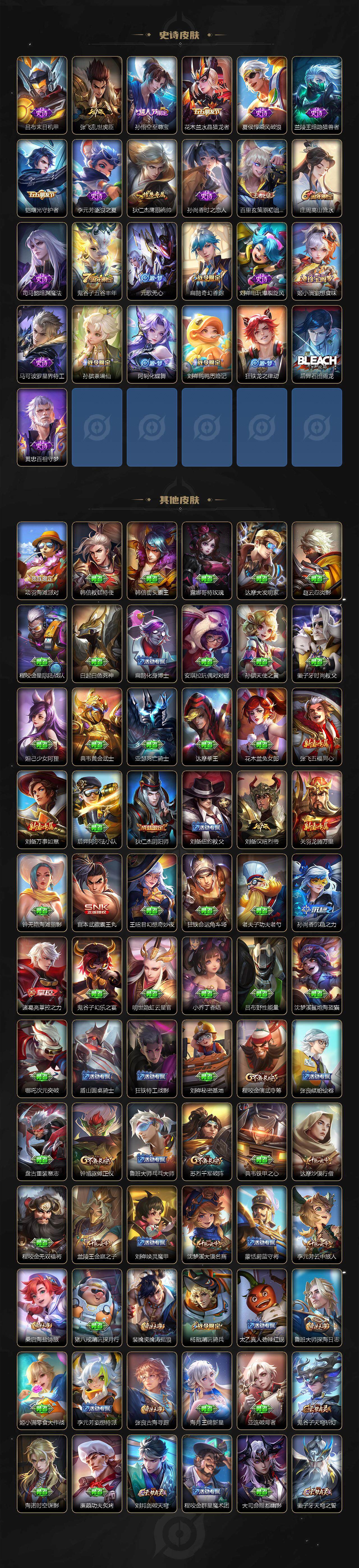 【史诗皮肤】:赵云皇家上将,赵云未来纪元,甄姬冰雪圆舞曲,狄仁杰魔术师,宫本武藏鬼剑武藏,孙尚香蔷薇恋人,孙尚香水果甜心,嬴政摇滚巨星,妲己魅力维加斯,妲己女仆咖啡,墨子金属风暴,吕布圣诞狂欢,吕布末日机甲,张飞乱世虎臣,孙悟空至尊宝,花木兰水晶猎龙者,夏侯惇乘风破浪,兰陵王暗隐猎兽者,铠曙光守护者,李元芳逐浪之夏,狄仁杰鹰眼统帅,孙尚香时之恋人,百里玄策原初追逐者,庄周高山流水,司马懿暗渊魔法,鬼谷子五谷丰年,元歌无心,扁鹊奇幻香踪,刘禅电玩爆裂旋风,姬小满妄想食味,马可波罗星界特工,孙膑茶境仙,阿轲化蝶舞,刘禅鸭鸭历险记,狂铁龙之律动,后羿石田雨龙,黄忠百相守梦