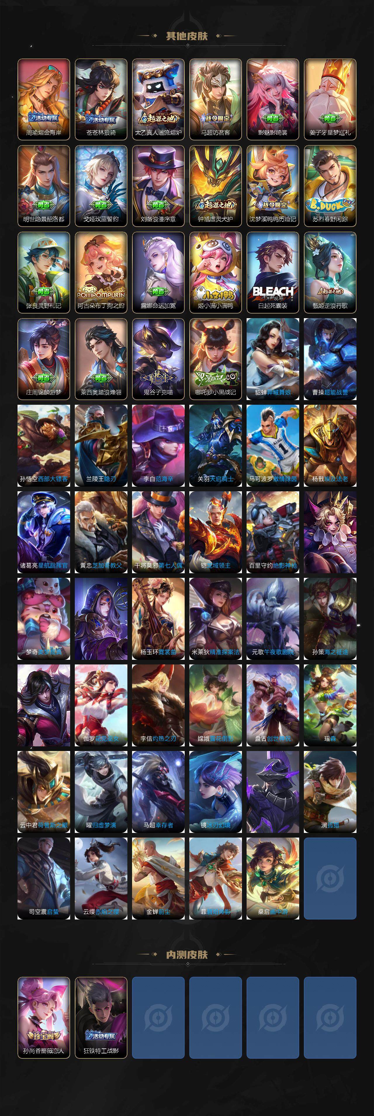 【限定皮肤】:姜子牙天穹之誓,狄仁杰阴阳师,赵云皇家上将,孙尚香蔷薇恋人,庄周高山流水,扁鹊奇幻香踪,元歌无心,狄仁杰魔术师,达摩沙漠行僧,项羽海滩派对,程咬金演武夺筹,兰陵王金庭之子,孙悟空至尊宝,孙悟空零号赤焰,李元芳云中旅人,钟馗驱傩正仪,杨戬潮玩骑兵,鬼谷子五谷丰年,苏烈千军破阵,百里玄策原初追逐者,沈梦溪大漠名商,裴擒虎寅虎赤拳,裴擒虎擒涛扼浪,鲁班大师探海日志,桑启海盐诗旅,张良古海寻踪,鬼谷子天穹祈灯,姬小满妄想食味,刘邦剑破天穹,程咬金群星魔术团,韩信群星魔术团,周瑜熔金海岸
