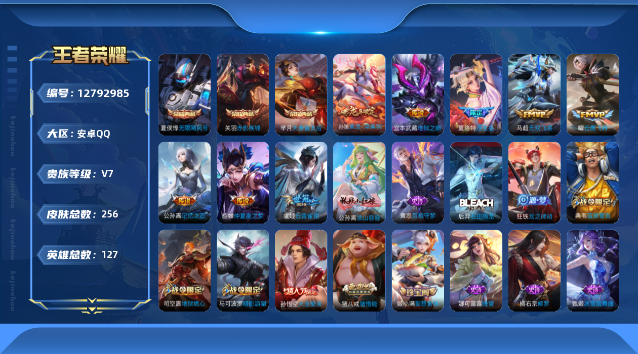 [12792985]安卓Q-V7-至尊星耀IV段位-127英雄-256皮肤-3典藏-0珍品无双-0无双-0珍品传说-8传说-66史诗