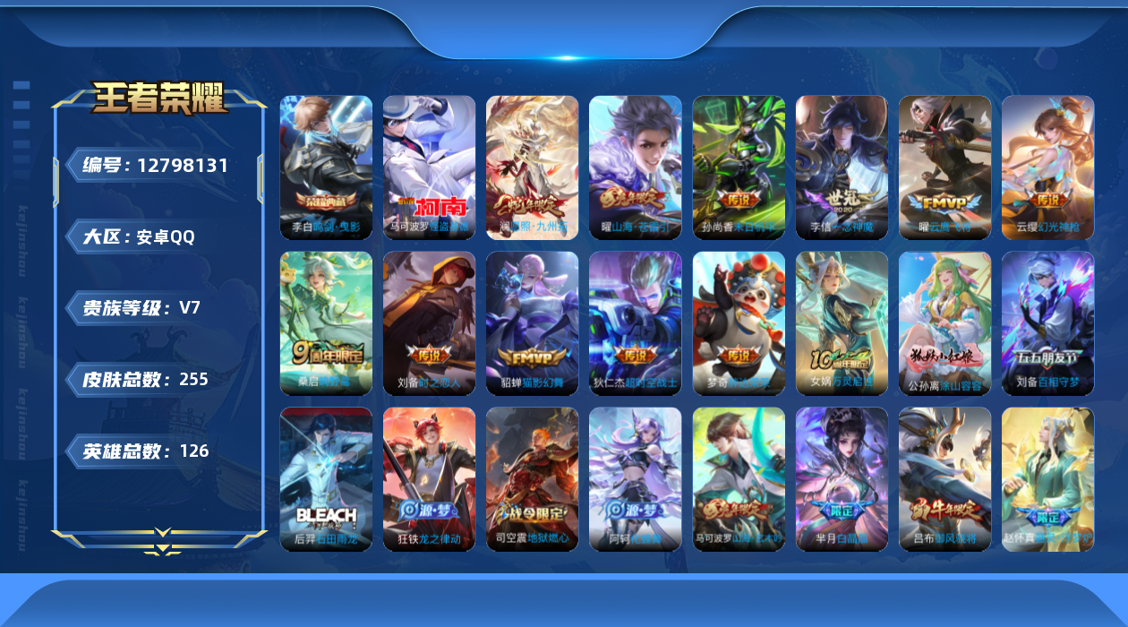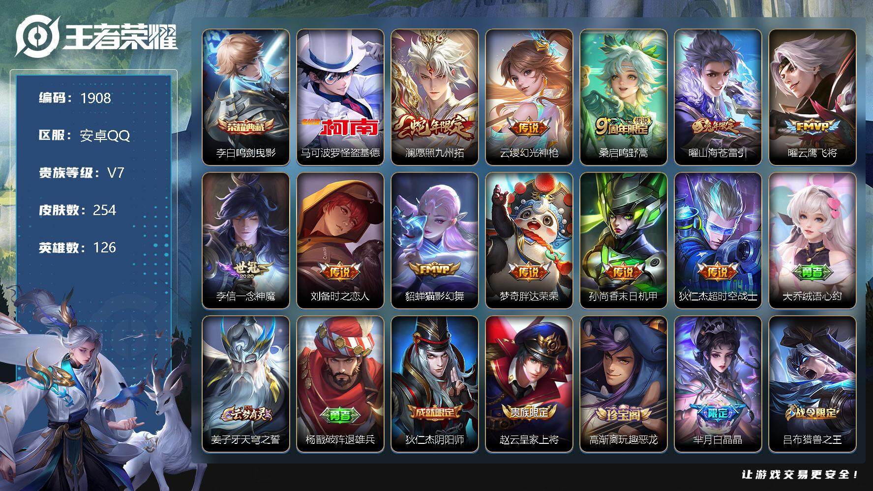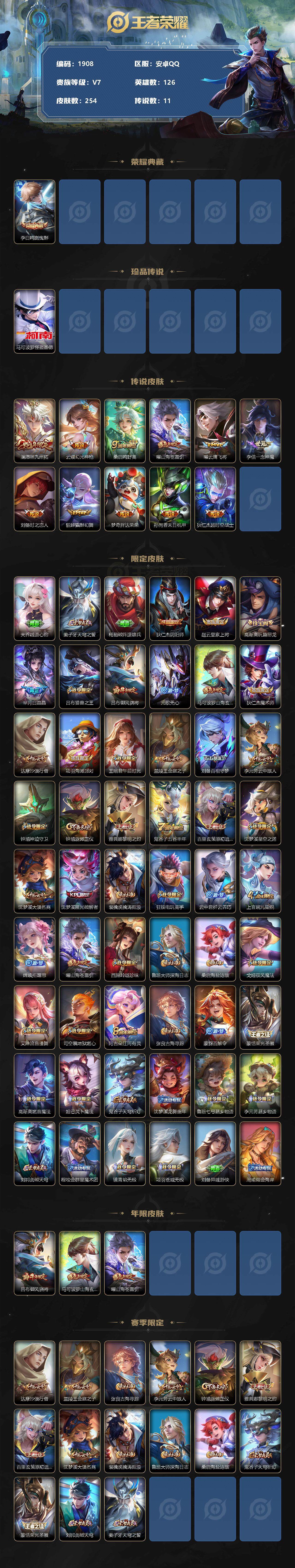 [12798131]安卓Q-V7-至尊星耀II段位-126英雄-254皮肤-1典藏-0珍品无双-0无双-1珍品传说-11传说-67史诗