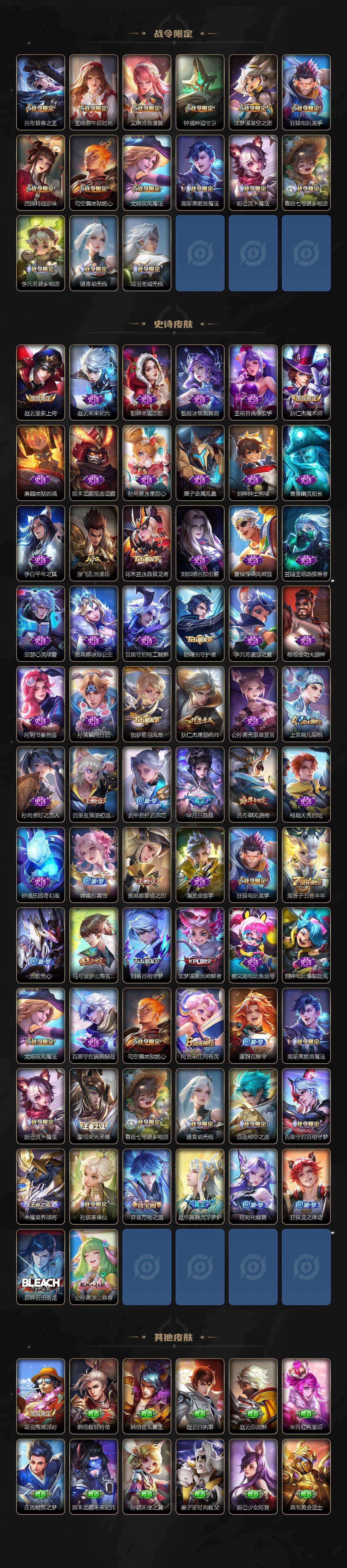 【史诗皮肤】:赵云皇家上将,赵云未来纪元,貂蝉圣诞恋歌,甄姬冰雪圆舞曲,王昭君偶像歌手,狄仁杰魔术师,廉颇地狱岩魂,宫本武藏鬼剑武藏,孙尚香水果甜心,墨子金属风暴,刘禅绅士熊喵,曹操幽灵船长,李白千年之狐,张飞乱世虎臣,花木兰水
