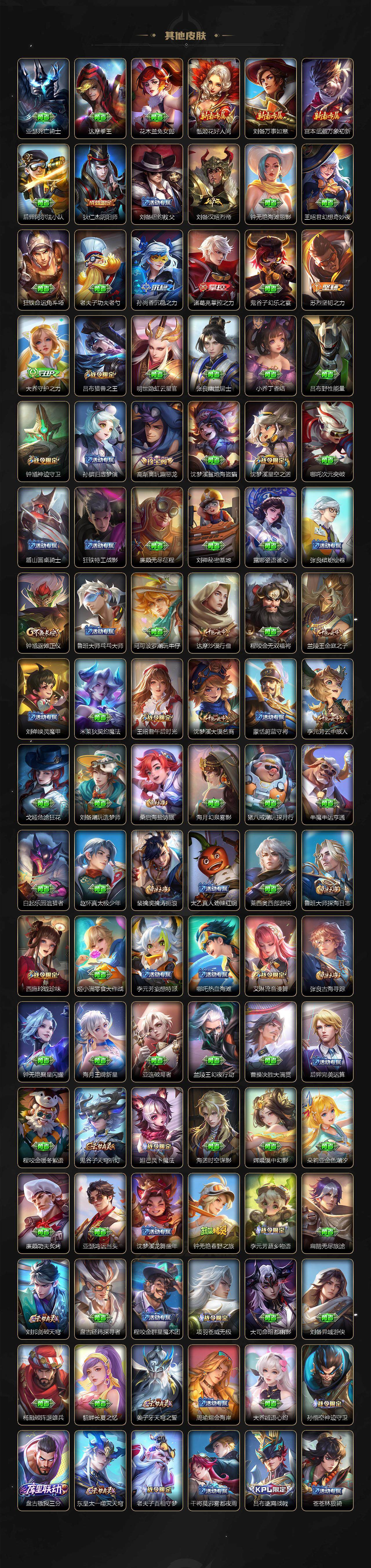 【赛季限定】:达摩沙漠行僧,兰陵王金庭之子,张良古海寻踪,李元芳云中旅人,钟馗驱傩正仪,雅典娜黎明之约,百里玄策原初追逐者,沈梦溪大漠名商,裴擒虎擒涛扼浪,鲁班大师探海日志,桑启海盐诗旅,鬼谷子天穹祈灯,蒙恬荣光圣徽,刘邦剑破天穹,姜子牙天穹之誓
