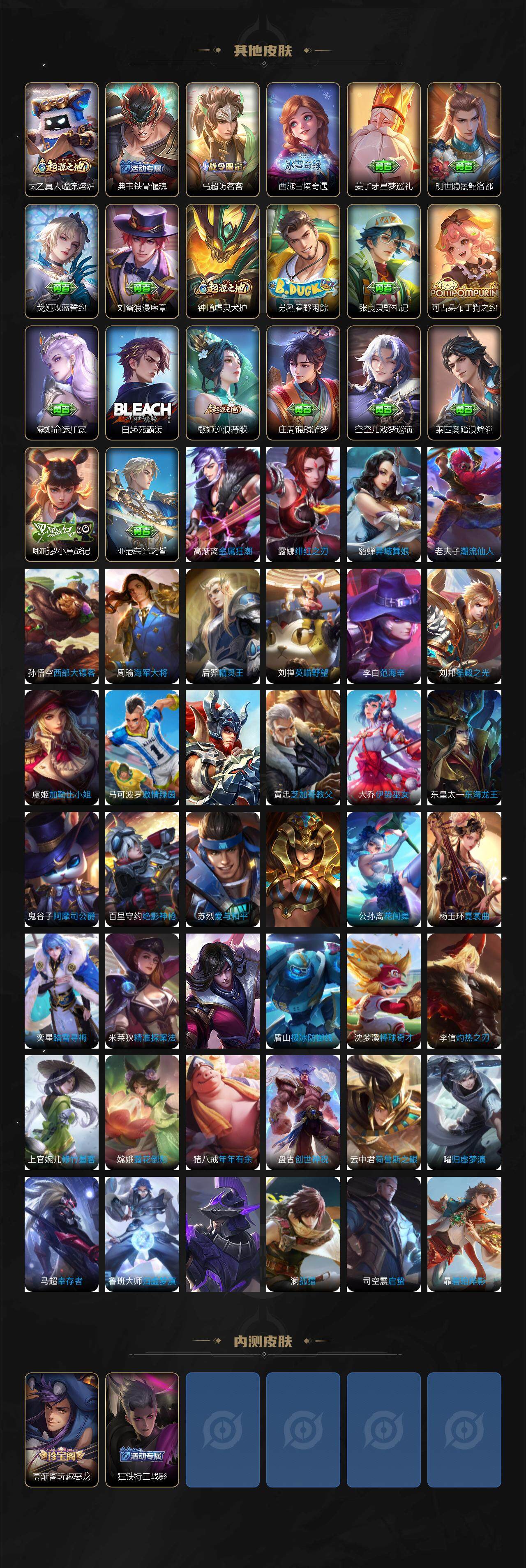 伽罗箭羽风息,李元芳逐浪之夏,公孙离无限星赏官,孙策猫狗日记,阿轲节奏热浪,王昭君偶像歌手,孙尚香时之恋人,雅典娜冰冠公主,刘禅绅士熊喵,程咬金功夫厨神,刘邦德古拉伯爵,兰陵王暗隐猎兽者,曹操幽灵船长,宫本武藏鬼剑武藏,亚瑟心灵战警,钟馗乐园奇幻夜,杨戬天秀·启明,廉颇地狱岩魂,夏侯惇乘风破浪,花木兰水晶猎龙者,铠曙光守护者,墨子金属风暴,百里玄策原初追逐者,貂蝉圣诞恋歌,百里守约特工魅影,嫦娥拒霜思,雅典娜黎明之约,李白千年之狐,澜赏金猎手,刘备百相守梦,沈梦溪匿光破解者,蔡文姬电玩·兔顽号,刘禅电玩·爆裂旋风,百里守约真我赫兹,蒙犽百解令,高渐离燃音魔法,赵怀真器灵·浮梦炉