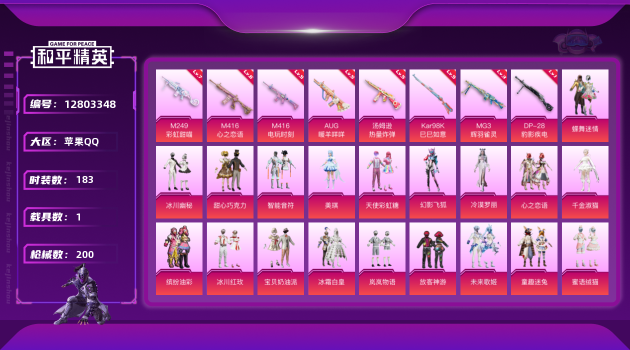 [12803348]素材身法号/地铁满天赋 苹果 手Q-24粉装-9特效枪-1载具-7粉色飞行器-7.5w热力值-10王牌印记-183套装-200枪皮【热门品类】:粉装-童趣迷兔,粉装-缤纷油彩,套装-浪漫天命,套装-都市猎人,套装-派对舞王,套装-胖达团团,套装-胖达圆圆,套装-动感兔斯基人偶服,套装-龟仙人,套装-潮萌小黄鸭,套装-暗影哥特,套装-糯粉咩咩,套装-软软马卡龙,套装-红熊茄茄【粉色载具】:辉羽雀灵自行车【粉色套装】:粉装-甜心巧克力,粉装-宝贝奶油派,粉装-天使彩虹糖,粉装-蝶舞迷情,粉装-智能音符,粉装-缤纷油彩,粉装-放客神游,粉装-心之恋语,粉装-冰霜白皇,粉装-童趣迷兔,粉装-馨动时刻,粉装-岚岚物语,粉装-甜梦小狐,粉装-彩虹甜喵,粉装-冰川幽秘,粉装-冰川红玫,角色-小可学妹,粉装-未来歌姬,角色-圣堂之誓,粉装-蜜语绒猫,角色-美琪,角色-千金淑猫,粉装-幻影飞狐,角色-冷漠罗丽【粉色枪皮等级】:M416-心之恋语(六级),M416-电玩时刻(五级),AUG-暖羊咩咩(五级),汤姆逊-热量炸弹(五级),Kar98K-巳巳如意(五级),Mk14-甜梦熊击(五级),M249-彩虹甜喵(七级),DP-28-豹影疾电(一级),MG3-辉羽雀灵(三级)【粉色飞行器】:春暖花开飞行器,星夜魔法师飞行翼,萌物绒绒飞行器,凤舞九天飞行器,彩虹独角兽飞行器,雀灵庇佑飞行器,灵猫魔法师飞行器