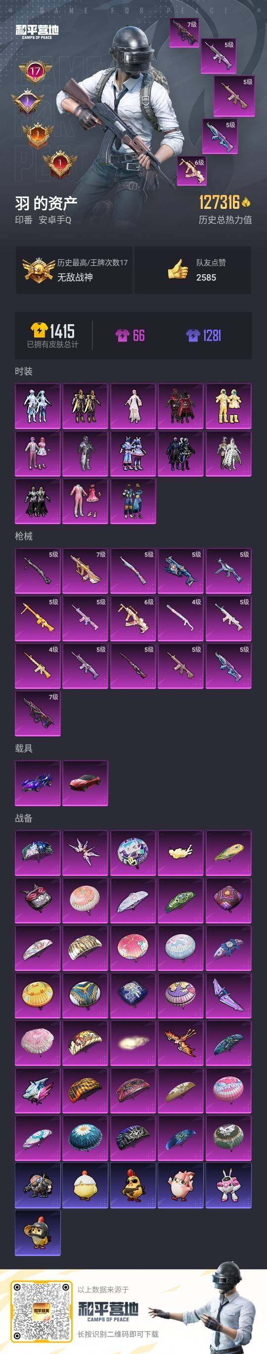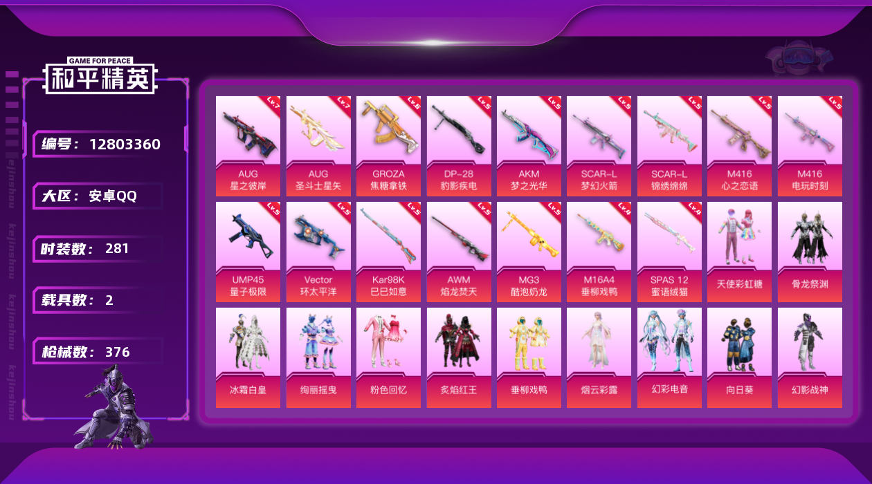 - PX_2088325- 包人脸 苹果手Q-8王牌印记-10粉装-6特效枪-2载具-53816热力值-99套装-169枪皮-1卓越印记-0传奇印记, 【10粉装】,梦幻火箭,玩偶服-猪猪侠,碧影闪光,星云暗核,宙之时溯,圣堂之誓,樱桃泡泡,金风银杏,暗夜鎏金,吟月归客, 【6特效枪】,AKM-绿萝繁花-5级,M416-全功率超战-7级,GROZA-镜光银凌-5级,AUG-暖羊咩咩-3级,Kar98K
