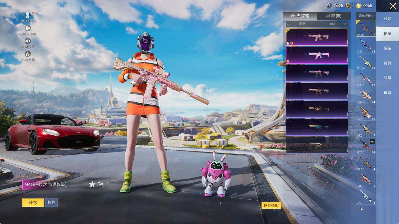 AKM-梦之光华,M16A4-垂柳戏鸭,SCAR-L-梦幻火箭,M416-心之恋语,M416-电玩时刻,GROZA-焦糖拿铁,AUG-星之彼岸,UMP45-量子极限,Vector-环太平洋,Kar98K-巳巳如意,AWM-焰龙焚天,SPAS-12-蜜语绒猫,MG3-酷泡奶龙