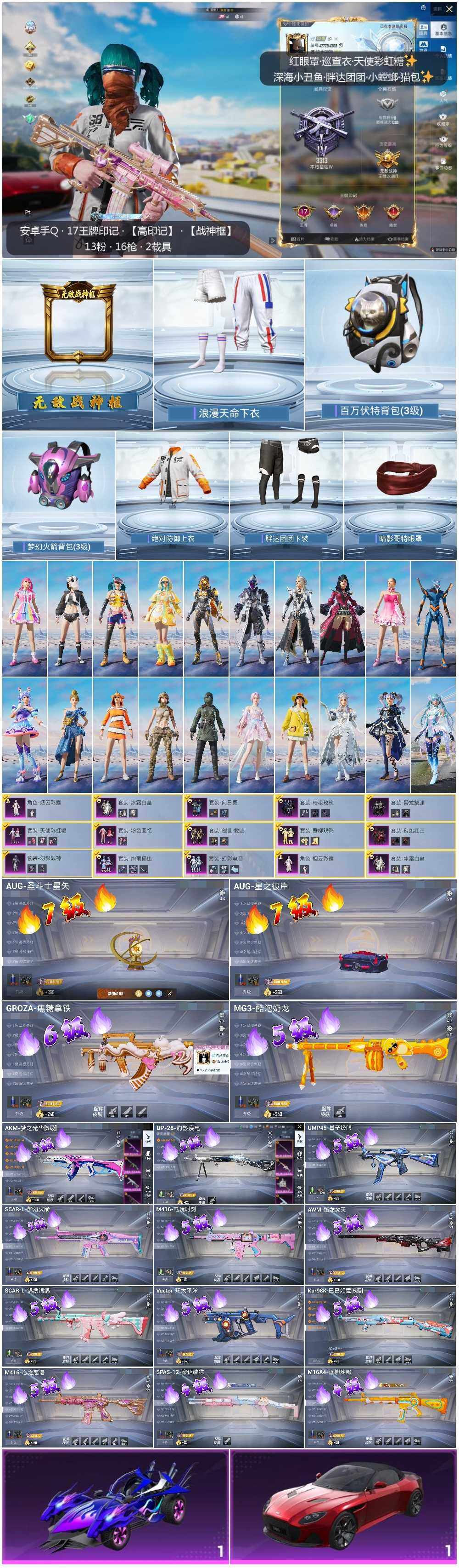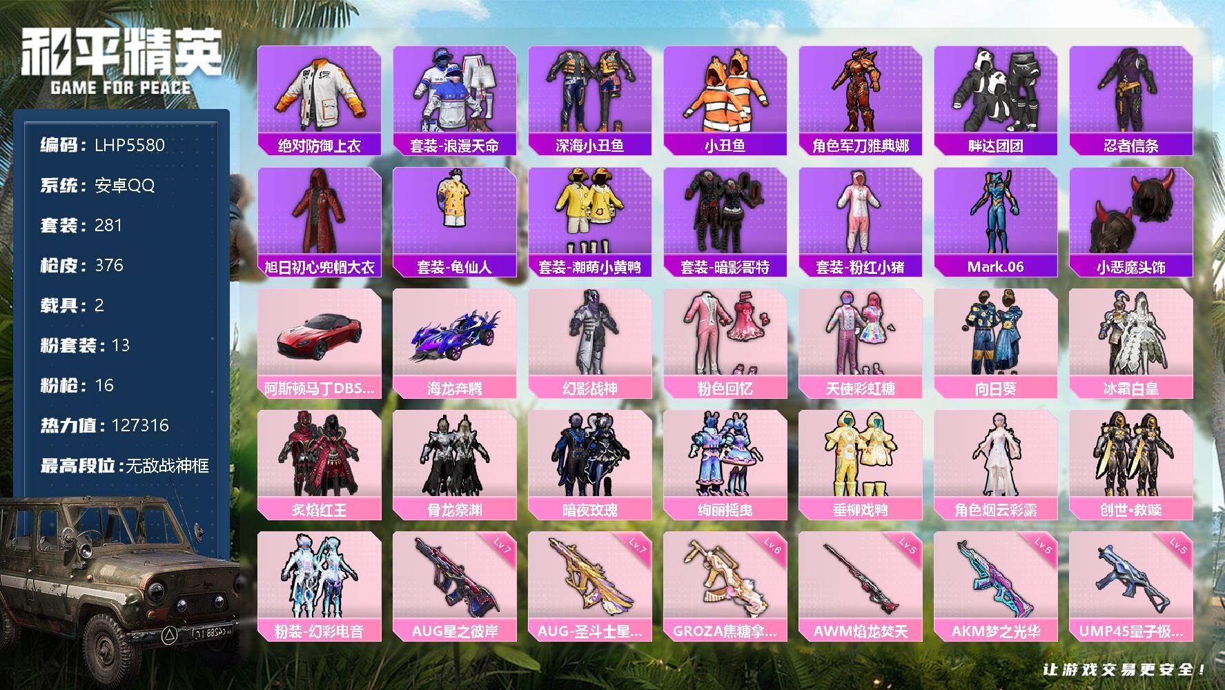 [12803360]素材身法号/无敌战神框1/绝世印记1/地铁满天赋 安卓 手Q-无敌战神框-13粉装-16特效枪-2载具-6粉色飞行器-12.7w热力值-17王牌印记-281套装-376枪皮【热门品类】:绝对防御上衣,套装-浪漫天命,套装-深海小丑鱼,套装-小丑鱼,角色-军刀雅典娜,套装-胖达团团,套装-忍者信条,旭日初心兜帽大衣,套装-龟仙人,套装-潮萌小黄鸭,套装-暗影哥特,套装-粉红小猪,角色-Mark.06,小恶魔头饰【粉色载具】:阿斯顿马丁DBS(红),海龙奔腾【粉色套装】:粉装-幻影战神,粉装-粉色回忆,粉装-天使彩虹糖,粉装-向日葵,粉装-冰霜白皇,粉装-炙焰红王,粉装-骨龙祭渊,粉装-暗夜玫瑰,粉装-绚丽摇曳,粉装-垂柳戏鸭,角色-烟云彩露,套装-创世·救赎,粉装-幻彩电音【粉色枪皮等级】:AKM-梦之光华(五级),M16A4-垂柳戏鸭(四级),SCAR-L-梦幻火箭(五级),SCAR-L-锦绣绵绵(五级),M416-心之恋语(五级),M416-电玩时刻(五级),GROZA-焦糖拿铁(六级),AUG-星之彼岸(七级),AUG-圣斗士星矢(七级),UMP45-量子极限(五级),Vector-环太平洋(五级),Kar98K-巳巳如意(五级),AWM-焰龙焚天(五级),SPAS-12-蜜语绒猫(四级),DP-28-豹影疾电(五级),MG3-酷泡奶龙(五级)【粉色飞行器】:梦幻火箭飞行器,机甲封神飞行器,齐天大圣飞行器,风花雪月飞行器,雀灵庇佑飞行器,终晖之翼飞行器