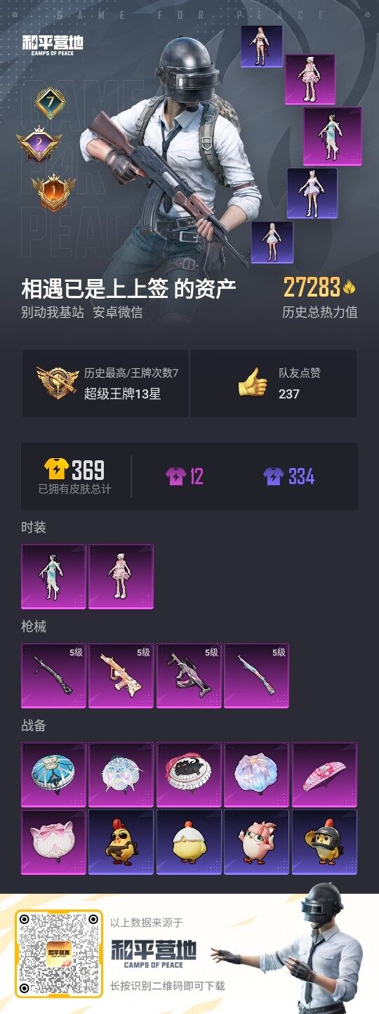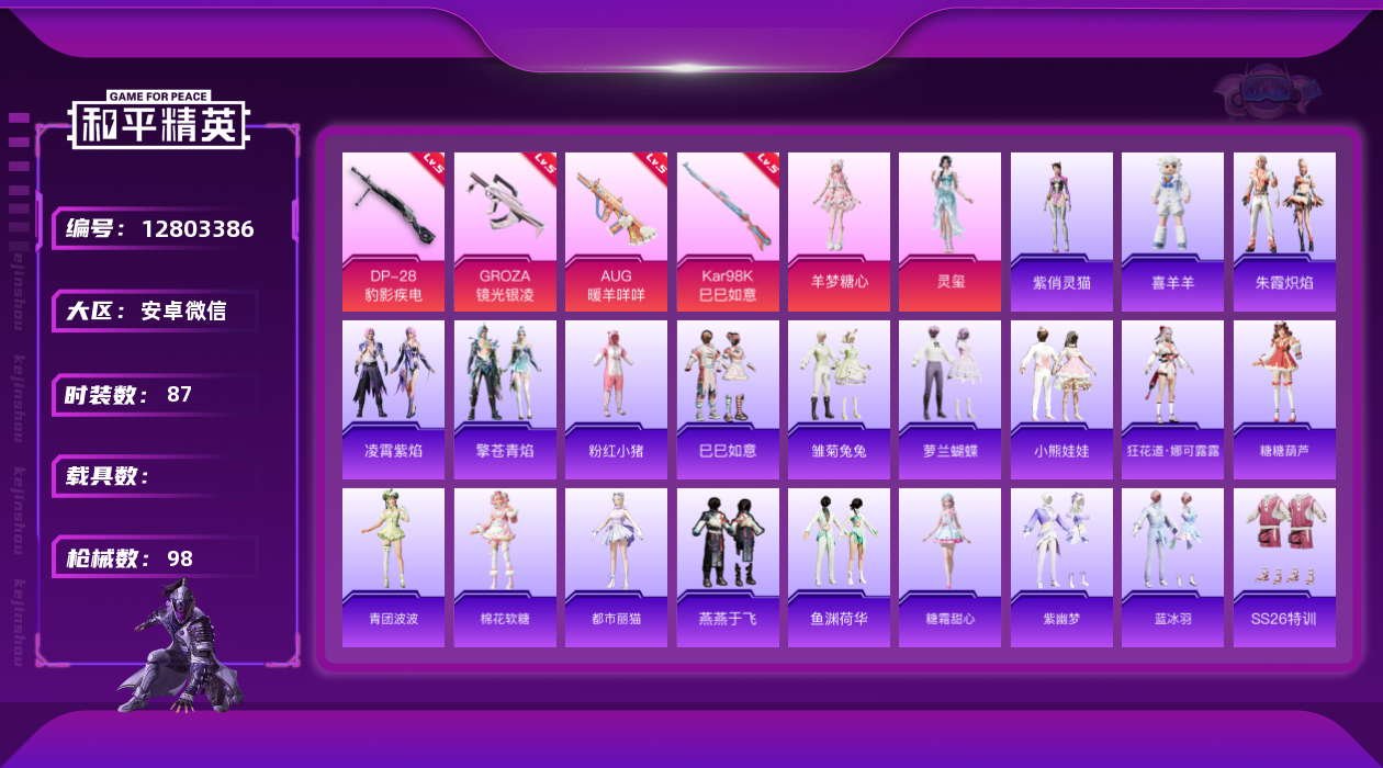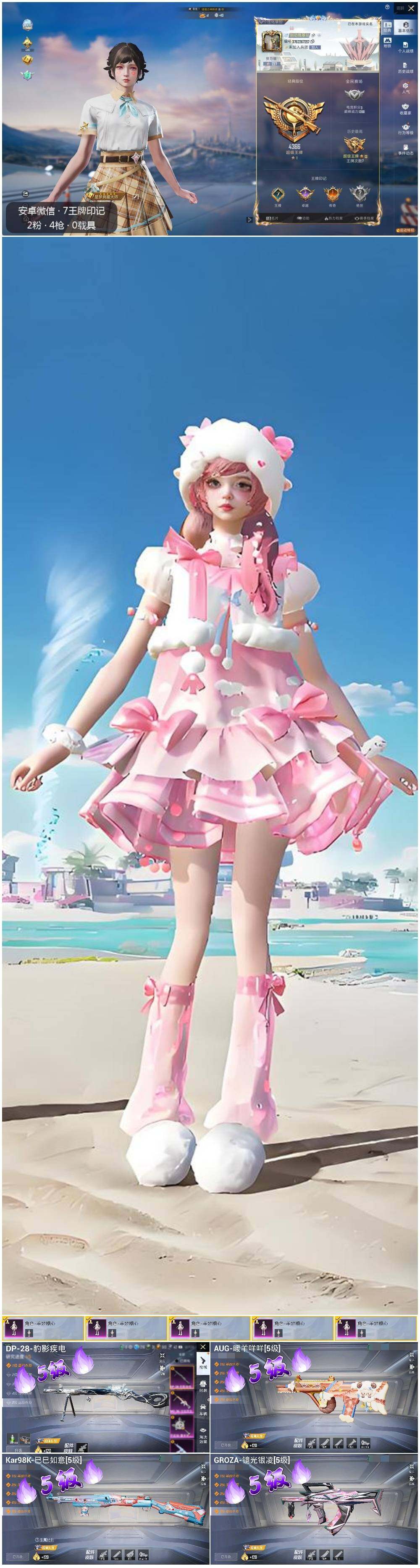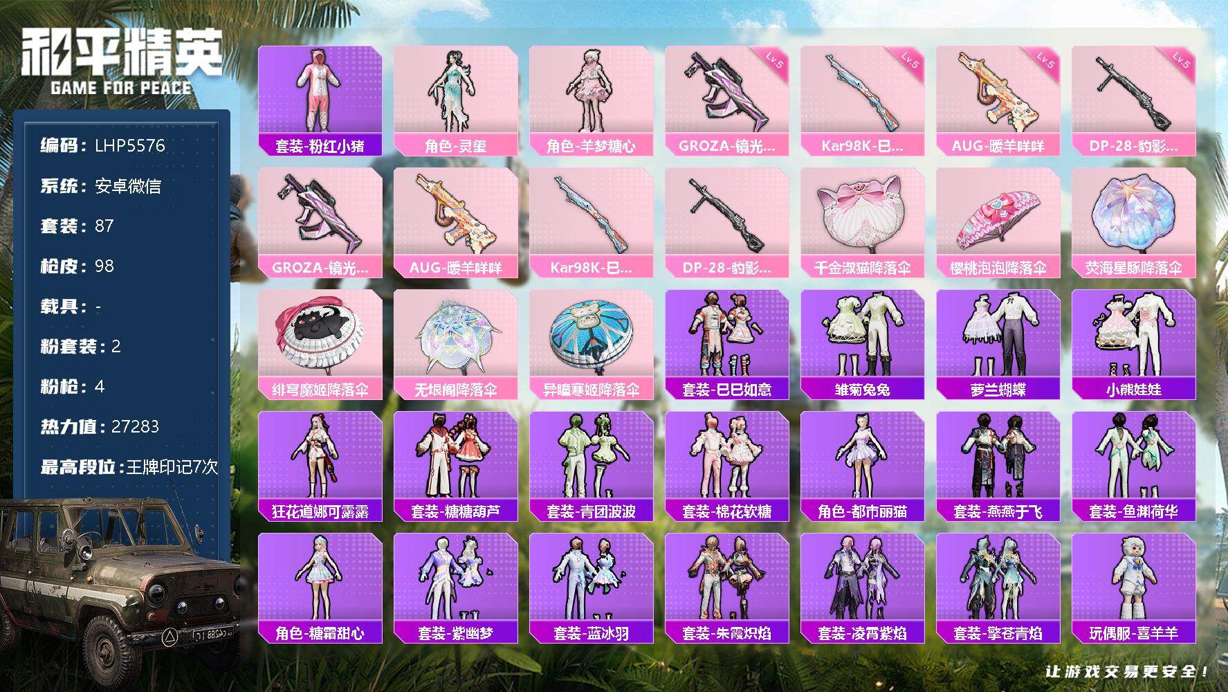[12803386]安卓 微信-2粉装-4特效枪-2.7w热力值-7王牌印记-87套装-98枪皮【热门品类】:套装-粉红小猪【粉色套装】:角色-灵玺,角色-羊梦糖心【粉色枪皮等级】:GROZA-镜光银凌(五级),AUG-暖羊咩咩(五级),Kar98K-巳巳如意(五级),DP-28-豹影疾电(五级)