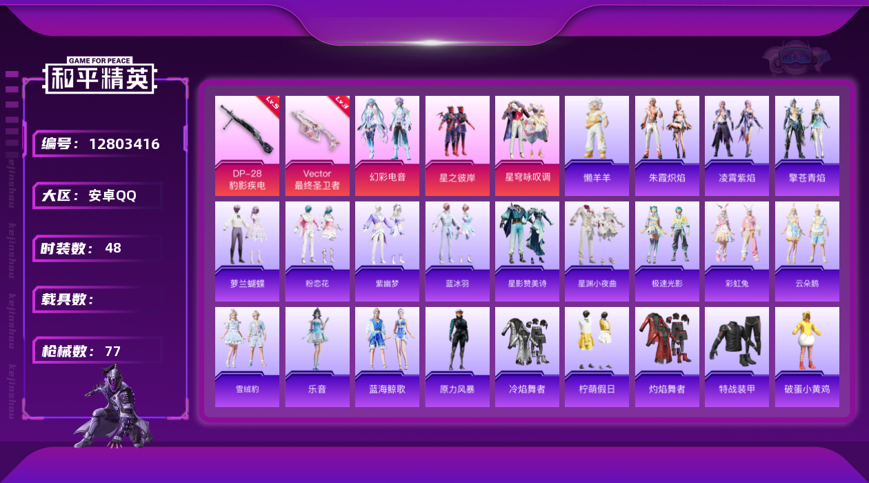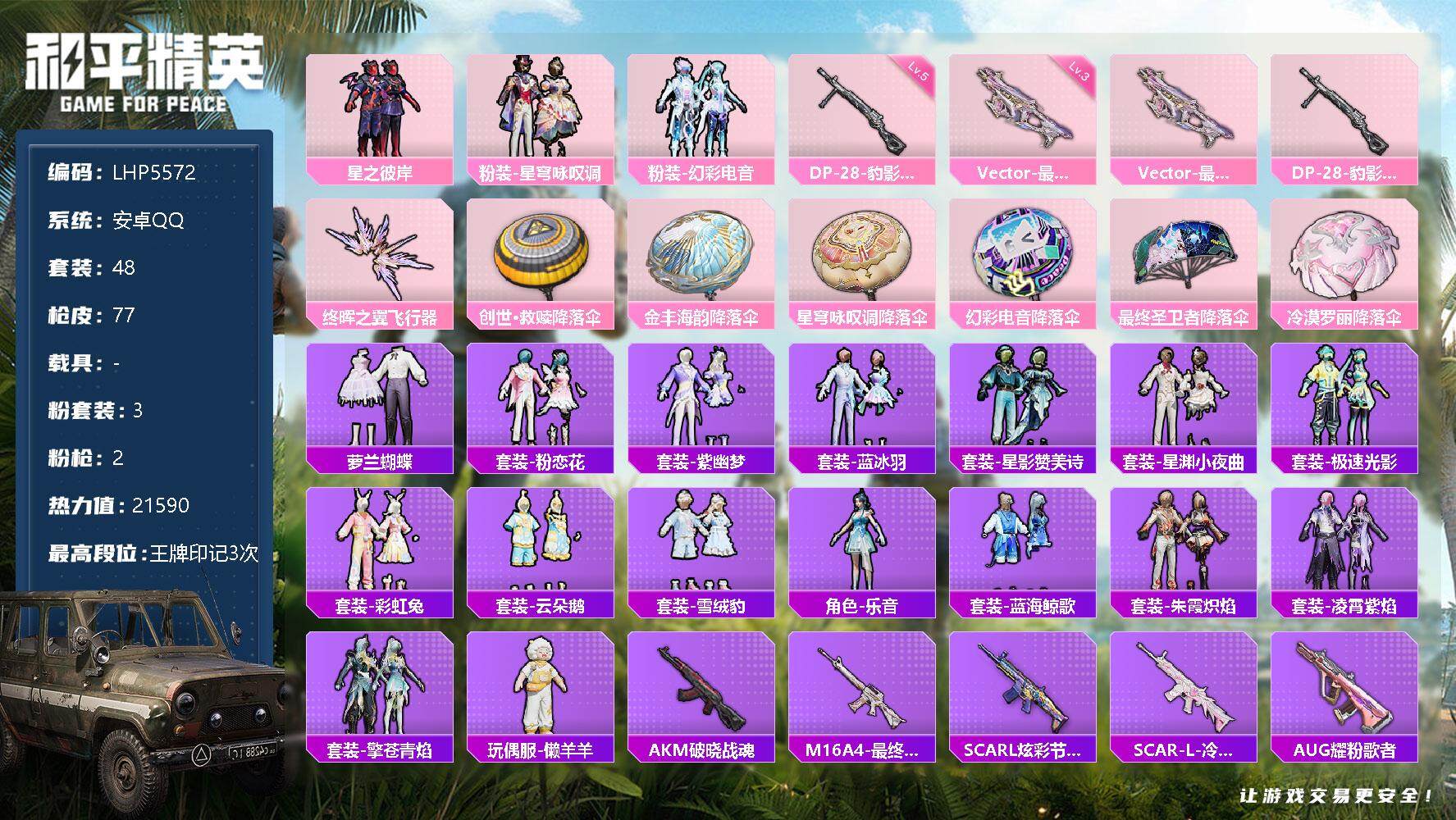 [12803416]安卓 手Q-3粉装-2特效枪-1粉色飞行器-2.1w热力值-3王牌印记-48套装-77枪皮【粉色套装】:粉装-星之彼岸,粉装-星穹咏叹调,粉装-幻彩电音【粉色枪皮等级】:Vector-最终圣卫者(三级),DP-28-豹影疾电(五级)【粉色飞行器】:终晖之翼飞行器