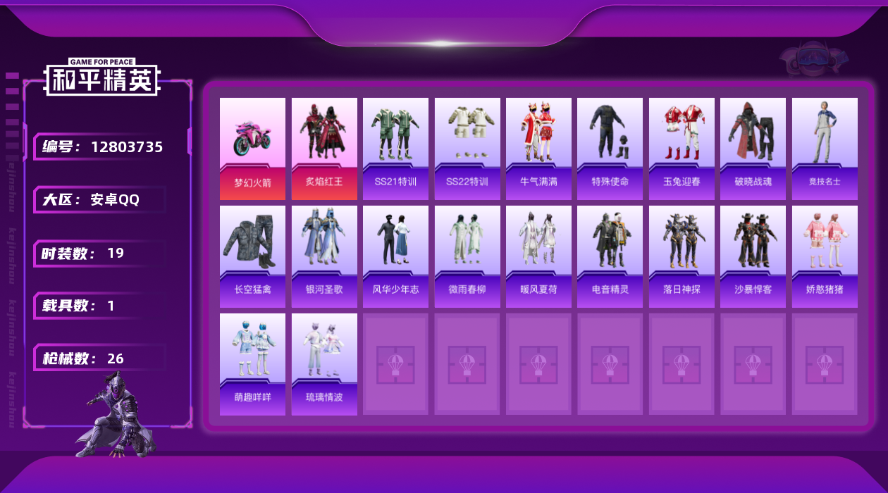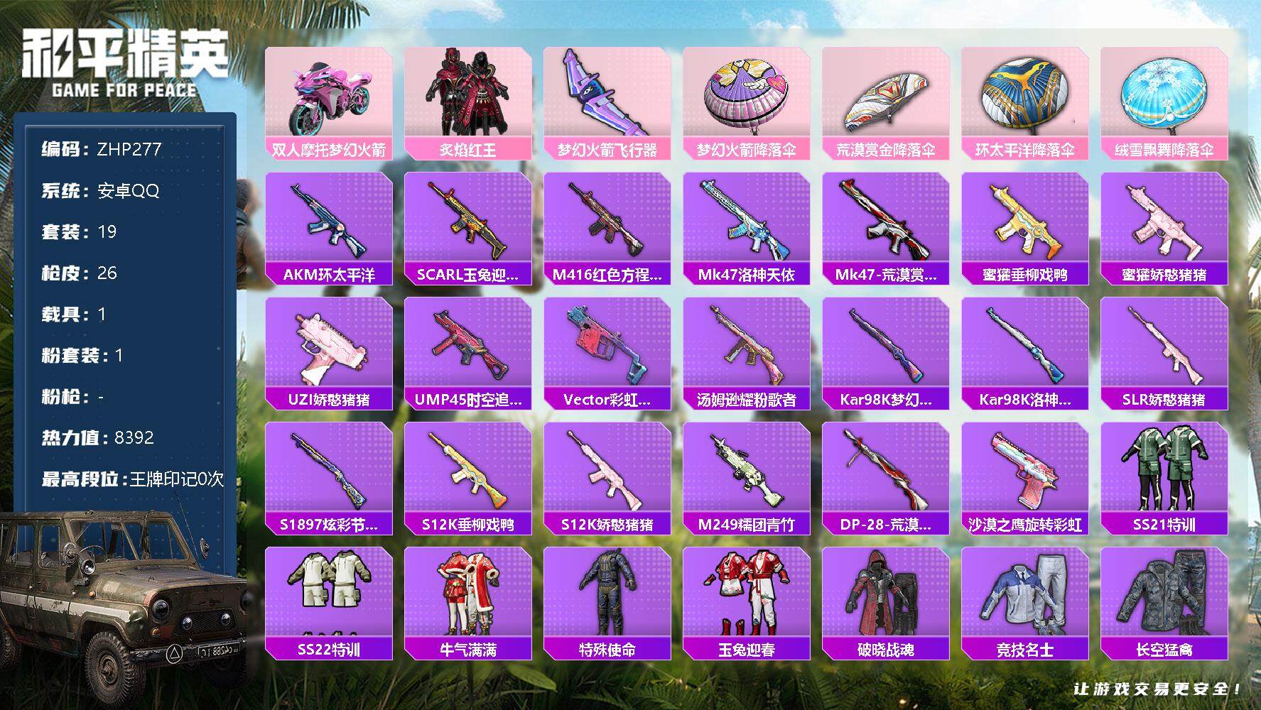 [12803735]安卓 手Q-1粉装-1载具-1粉色飞行器-8392热力值-1王牌印记-19套装-26枪皮【粉色载具】:双人摩托-梦幻火箭【粉色套装】:粉装-炙焰红王【粉色飞行器】:梦幻火箭飞行器