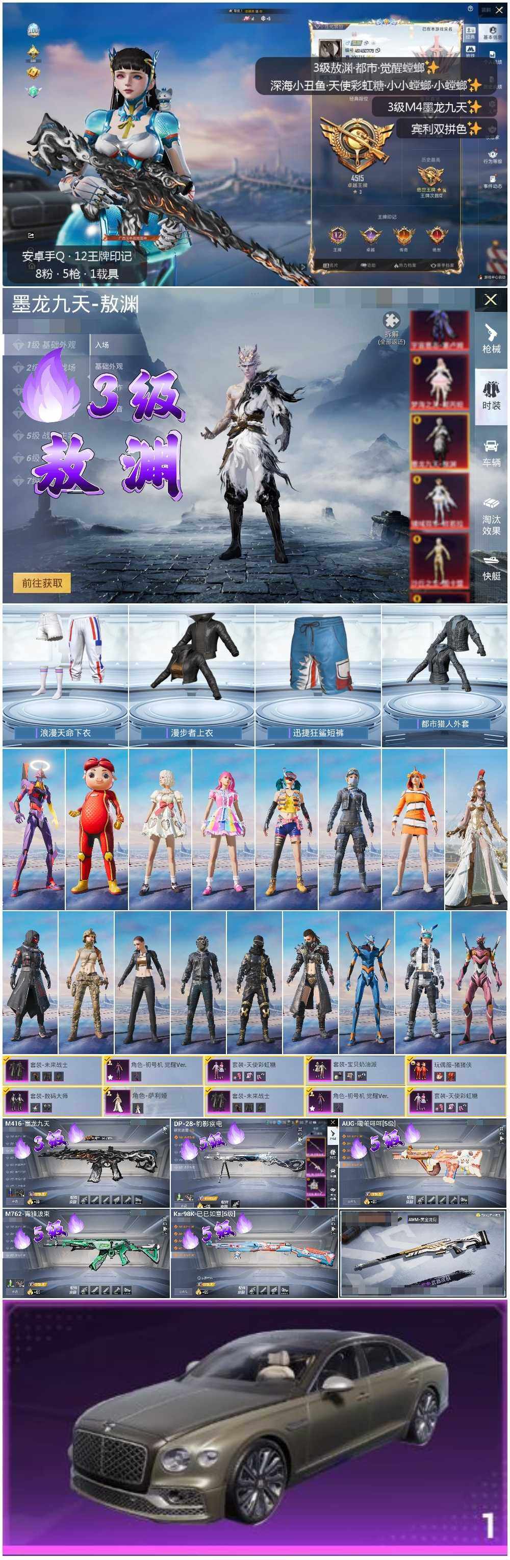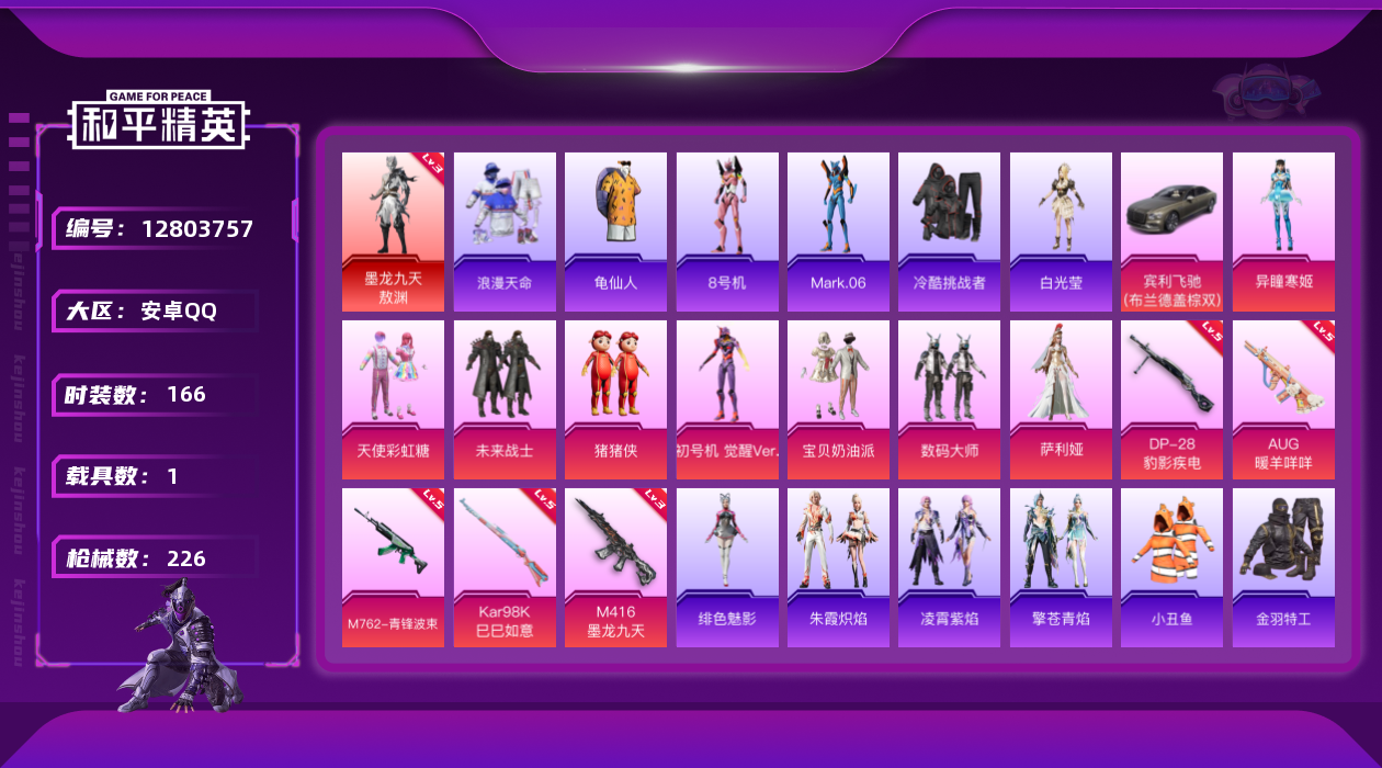 [12803757]素材身法号/绝世印记1 安卓 手Q-1神装-8粉装-5特效枪-1载具-2粉色飞行器-7.3w热力值-12王牌印记-166套装-226枪皮【红色神装等级】:墨龙九天-敖渊(三级)【热门品类】:套装-浪漫天命,套装-都市猎人,套装-深海小丑鱼,套装-小丑鱼,套装-奇异狩猎者,套装-金羽特工,套装-龟仙人,角色-8号机,角色-Mark.06【粉色载具】:宾利飞驰(布罗德盖棕双色)【粉色套装】:粉装-数码大师,粉装-未来战士,粉装-宝贝奶油派,粉装-天使彩虹糖,玩偶服-猪猪侠,角色-初号机 觉醒Ver.,角色-萨利娅,角色-异瞳寒姬【粉色枪皮等级】:M416-墨龙九天(三级),AUG-暖羊咩咩(五级),M762-青锋波束(五级),Kar98K-巳巳如意(五级),DP-28-豹影疾电(五级)【粉色飞行器】:龙翔九天飞行器,深渊漩涡飞行器