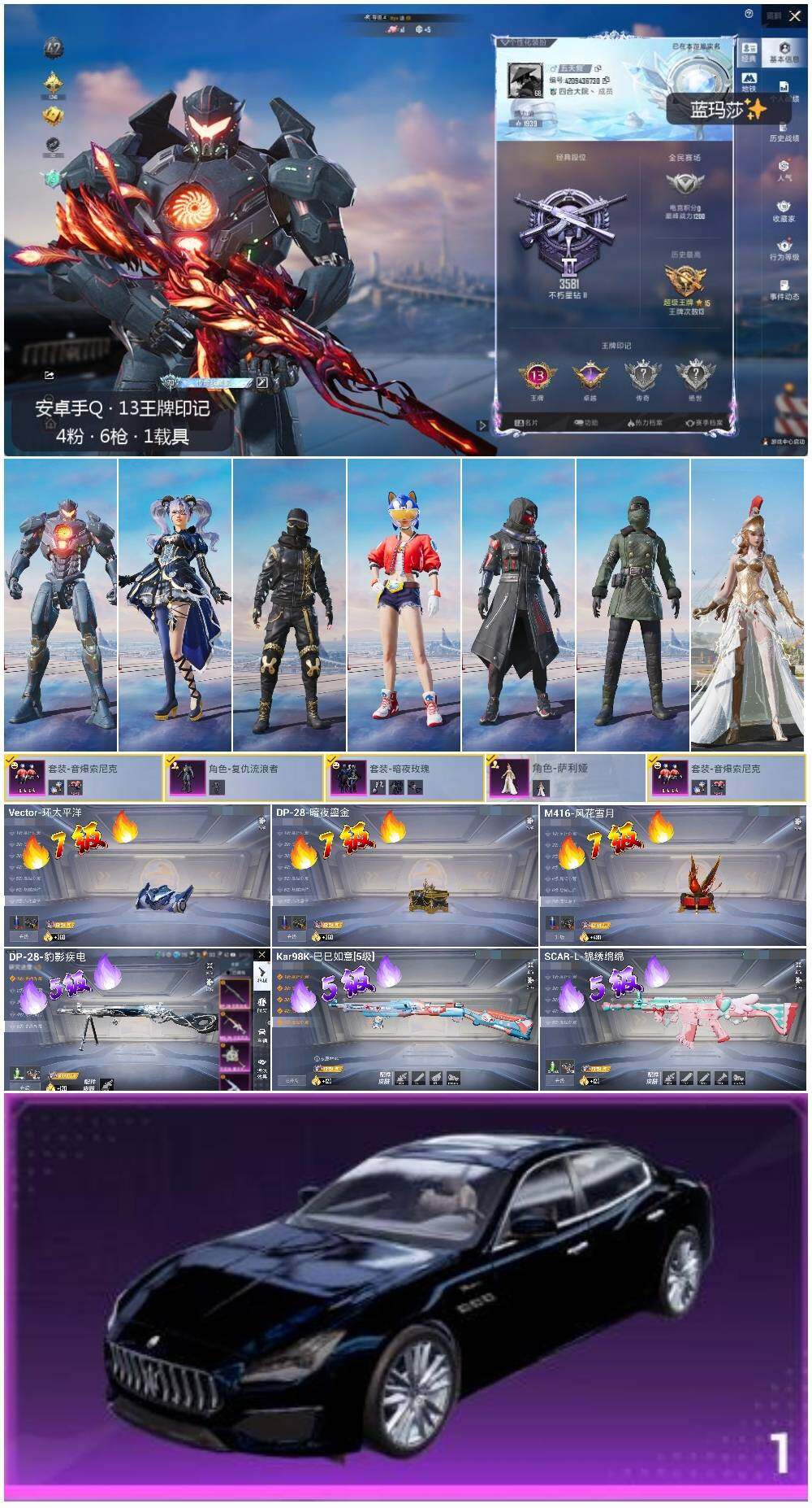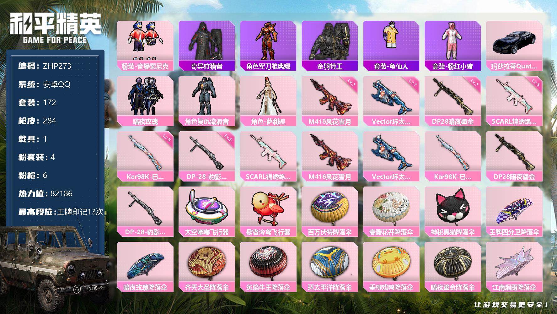 [12803799]素材身法号/地铁满天赋 安卓 手Q-4粉装-6特效枪-1载具-2粉色飞行器-8.2w热力值-13王牌印记-172套装-284枪皮【热门品类】:粉装-音爆索尼克,套装-奇异狩猎者,角色-军刀雅典娜,套装-金羽特工,套装-龟仙人,套装-粉红小猪【粉色载具】:玛莎拉蒂Quattroporte(夜幕蓝)【粉色套装】:粉装-暗夜玫瑰,角色-复仇流浪者,粉装-音爆索尼克,角色-萨利娅【粉色枪皮等级】:SCAR-L-锦绣绵绵(五级),M416-风花雪月(七级),Vector-环太平洋(七级),Kar98K-巳巳如意(五级),DP-28-暗夜鎏金(七级),DP-28-豹影疾电(五级)【粉色飞行器】:太空嘟嘟飞行器,歌者泠鸢飞行器