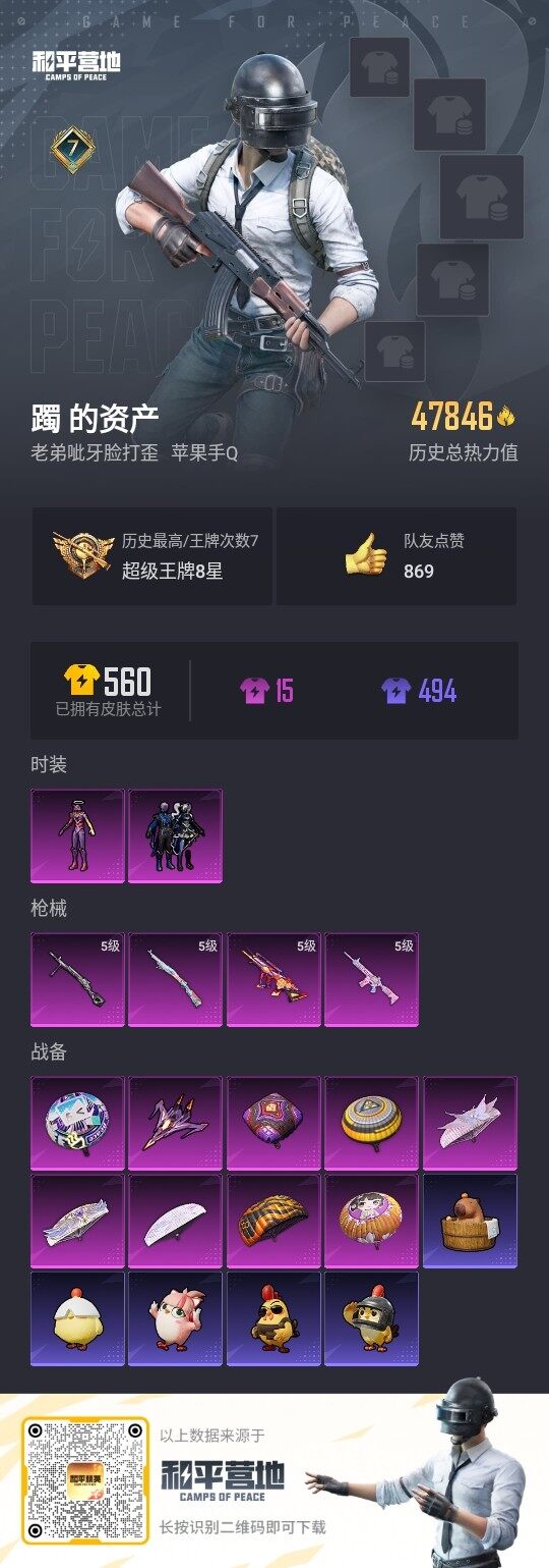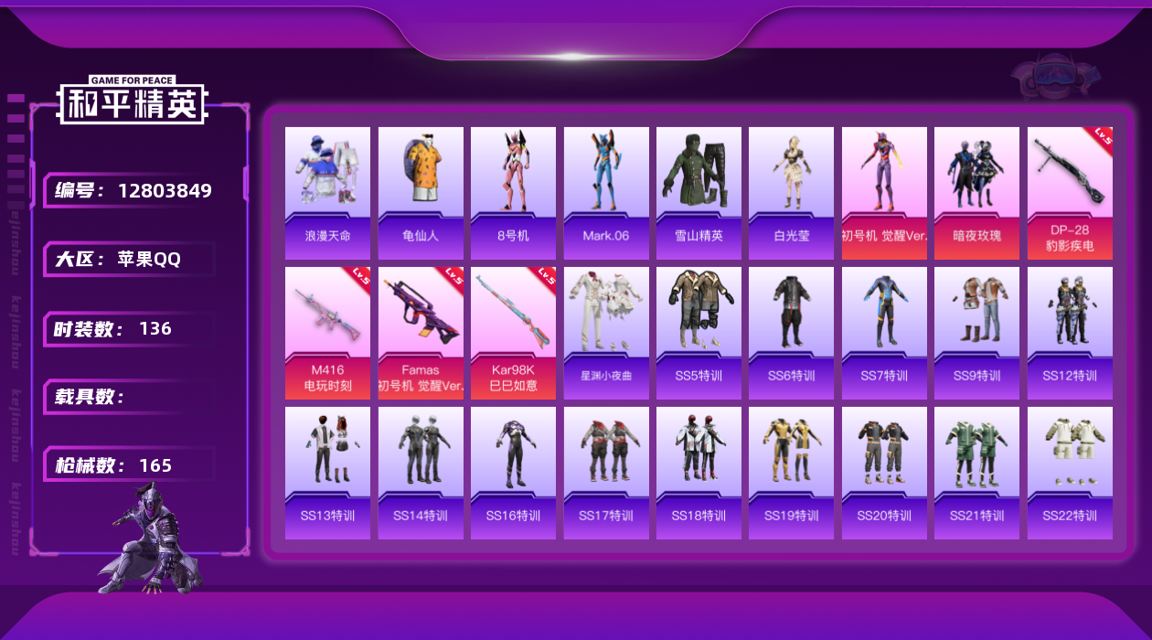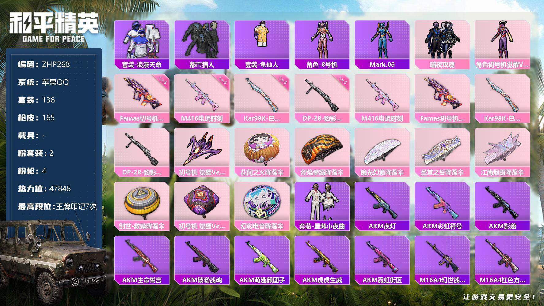 [12803849]苹果 手Q-2粉装-4特效枪-1粉色飞行器-4.7w热力值-7王牌印记-136套装-165枪皮【热门品类】:套装-浪漫天命,套装-都市猎人,套装-龟仙人,角色-8号机,角色-Mark.06【粉色套装】:粉装-暗夜玫瑰,角色-初号机 觉醒Ver.【粉色枪皮等级】:M416-电玩时刻(五级),Famas-初号机 觉醒Ver.(五级),Kar98K-巳巳如意(五级),DP-28-豹影疾电(五级)【粉色飞行器】:初号机 觉醒Ver.飞行器