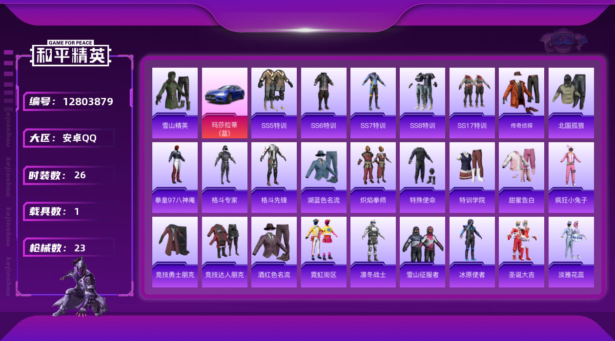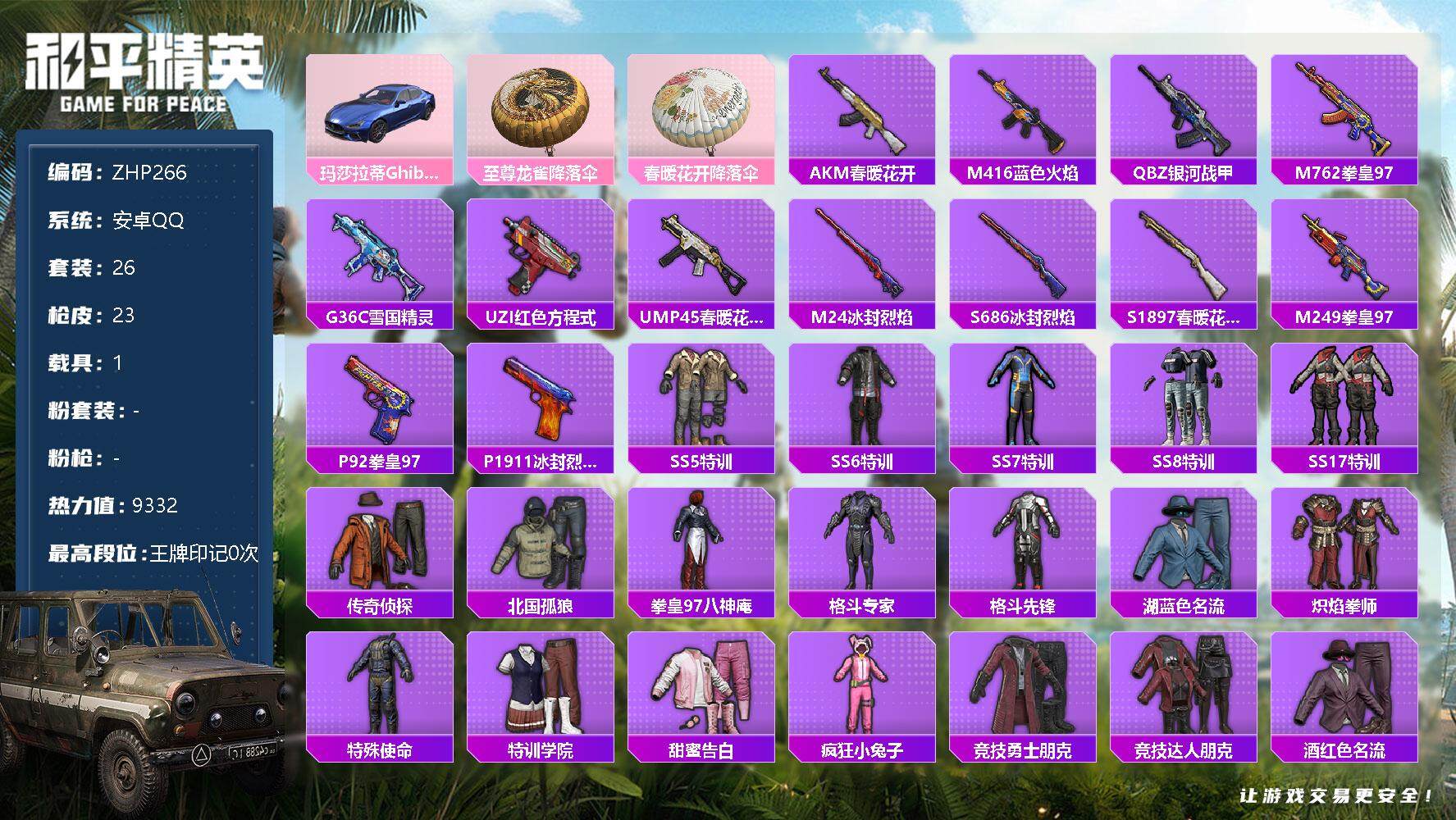 - [8895801]实名: 可修改 时装数: 738 载具数: 2 枪械数: 213 战备数: 168 热门装扮: 梦幻火箭(新101),红伞翩翩,呆萌铁蟹,深渊皇后,浪漫波比,迅捷狂鲨,黄伞悠悠,极致幻想,冰霜白皇,山涧鹿灵,炙焰赤龙,恐龙拽拽,星夜魔法师,寒光使者,潮萌小黄鸭,奶芙汪汪,第五大道,暗夜魅影,初号机 觉醒Ver. 载具: 玛莎拉蒂Ghibli(粉),阿斯顿·马丁DBS(红) 稀有枪皮: M416五爪金龙,SCAR-L童趣迷兔,UMP45-宇宙意志,Kar98K-巳巳如意 亮点: 13粉装-4特效-2载具-热力值76329-总套装738-总枪皮213-王牌印记15-历史最高超级王牌18星-粉套-深渊皇后,粉套-极致幻想,粉套-冰霜白皇,粉套-山涧鹿灵,粉套-星夜魔法师,粉套-炙焰赤龙,粉套-红伞翩翩,粉套-黄伞悠悠,粉套-恐龙拽拽,粉套-寒光使者,粉套-第五大道,角色-初号机 觉醒Ver.-SCAR-L-童趣迷兔(7级),M416-五爪金龙(7级),Kar98K-巳巳如意(4级),UMP45-宇宙意志(3级)-玛莎拉蒂Ghibli(粉),阿斯顿·马丁DBS(红)-套装-青年教官,套装-黄色运动,套装-黄色伏地魔,套装-白色伏地魔,套装-黑色伏地魔,套装-冰川格斗者,套装-竞技名士,套装-深蓝色名流,套装-酒红色名流,套装-湖蓝色名流,套装-黄色名流,套装-猛禽,套装-长空猛禽,套装-竞技勇士朋克,套装-黎明保卫者,套装-冷焰舞者,套装-灼焰舞者,套装-特战装甲,套装-贵族骑装,套装-战地督导,套装-青春校园,套装-灰色格斗者,套装-甜蜜告白,套装-春日漫步,套装-燃烧卡路里,套装-滨海假日,套装-完美偶像,套装-人气偶像,套装-幻影武者,套装-酷萌兔限定,套装-千禧之恋,套装-怒火燎原,套装-决胜时刻,套装-魅力单车,套装-绮丽涂鸦,套装-耀眼新星,套装-雪山征服者,套装-坚韧舞者,套装-破晓战魂,套装-热血青春,套装-沙漠兵团,套装-丛林猎人,套装-酷潮明星,套装-传奇侦探,套装-极地朋克,套装-幻世战舞者,套装-弄潮海豚,套装-迅捷狂鲨,套装-呆萌铁蟹,套装-甜蜜熊情侣