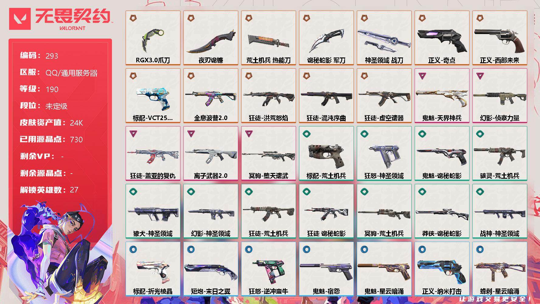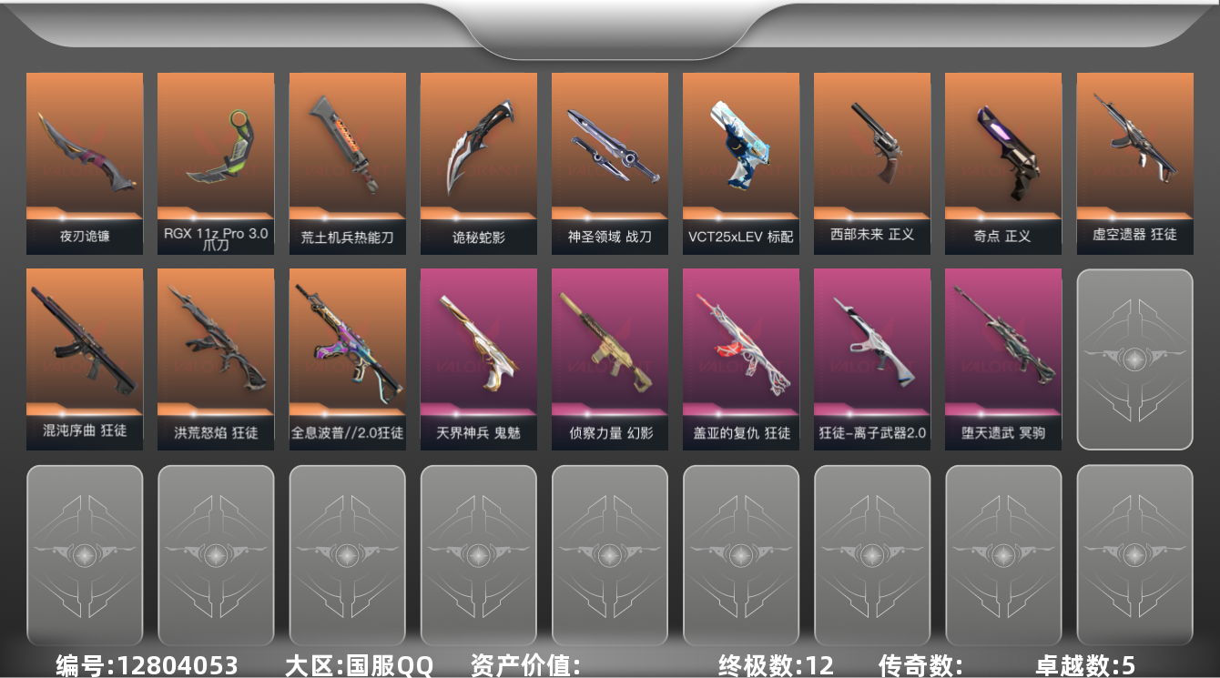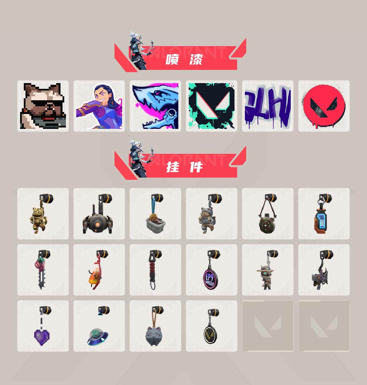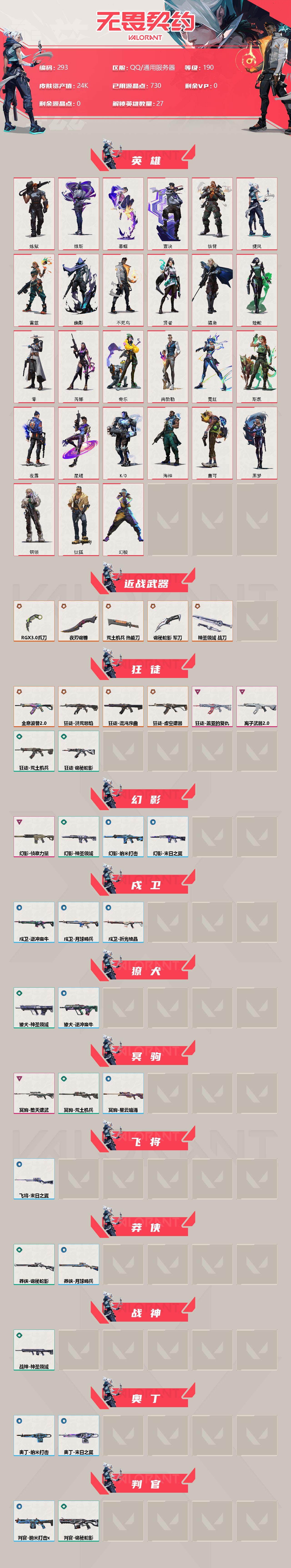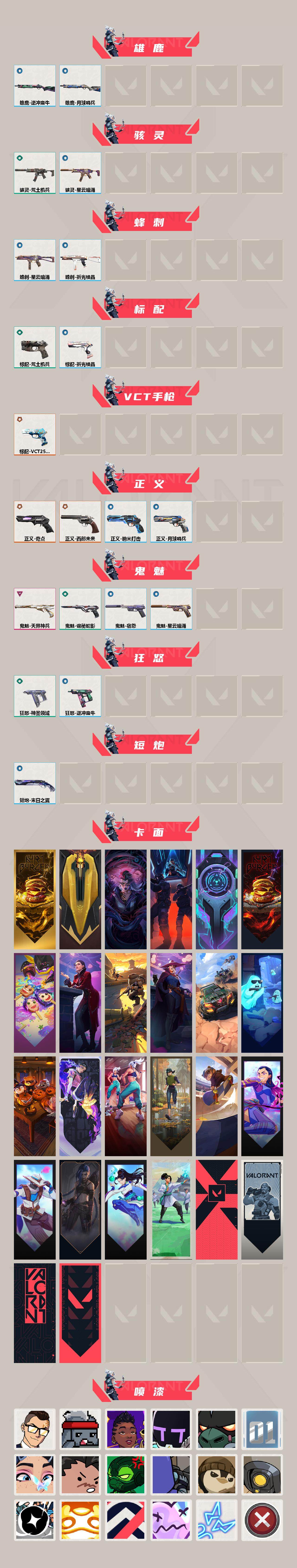 [12804053]【英雄】:幻棱,炼狱,维斯,暮蝶,钛狐,壹决,铁臂,捷风,雷兹,幽影,不死鸟,贤者,猎枭,蝰蛇,零,芮娜,奇乐,尚勃勒,霓虹,斯凯,夜露,星礈,K/O,海神,盖可,黑梦,钢锁 【近战 武器】:近战武器-RGX 11z Pro//3.0 爪刀,近战武器-荒土机兵 热能刀,近战武器-夜刃诡镰,近战武器-诡秘蛇影 军刀,近战武器-神圣领域 战刀 【狂徒】:狂徒-洪荒怒焰,狂徒-混沌序曲,狂徒-全息波普//2.0,狂徒-虚空遗器,狂徒-盖亚的复仇,狂徒-离子武器//2.0,狂徒-荒土机兵,狂徒-诡秘蛇影 【幻影】:幻影-侦察力量,幻影-神圣领域,幻影-纳米打击,幻影-末日之翼 【戍卫】:戍卫-逆冲蛮牛,戍卫-月球哨兵,戍卫-折光棱晶 【獠犬】:獠犬-神圣领域,獠犬-逆冲蛮牛 【冥驹】:冥驹-堕天遗武,冥驹-荒土机兵,冥驹-星云暗涌 【飞将】:飞将-末日之翼 【莽侠】:莽侠-诡秘蛇影,莽侠-月球哨兵 【战神】:战神-神圣领域 【奥丁】:奥丁-纳米打击,奥丁-末日之翼 【判官】:判官-诡秘蛇影,判官-纳米打击x 【雄鹿】:雄鹿-逆冲蛮牛,雄鹿-月球哨兵 【骇灵】:骇灵-荒土机兵,骇灵-星云暗涌 【蜂刺】:蜂刺-星云暗涌,蜂刺-折光棱晶 【标配】:标配-荒土机兵,标配-折光棱晶 【VCT手枪】:标配-VCT25 x LEV 【正义】:正义-奇点,正义-西部未来,正义-纳米打击,正义-月球哨兵 【鬼魅】:鬼魅-天界神兵,鬼魅-诡秘蛇影,鬼魅-宿怨,鬼魅-星云暗涌 【狂怒】:狂怒-神圣领域,狂怒-逆冲蛮牛 【短炮】:短炮-末日之翼 【卡面】:终章:激斗汉堡 卡面,进入射程 卡面,分崩离析 卡面,纳米打击 卡面,抑制技术 卡面,激斗汉堡 卡面,瓦娃脸雪糕 P2 卡面,从黄昏到黎明 卡面,荒土机兵 卡面,银弹猎手 卡面,逆冲蛮牛 卡面,精灵大战 卡面,南瓜盛典 卡面,无畏契约:暮蝶 卡面,热舞环节 卡面,归乡 // 蝰蛇 卡面,Clutch 卡面,无畏契约GO!第一卷:芮娜 卡面,无畏契约GO!第一卷:零 卡面,《双城之战》金克丝 卡面,无畏契约GO!第一卷:贤者 卡面,夯实根基 卡面,代号红色 卡面,新兵报到 卡面,V契约 卡面,无畏契约 卡面 【喷漆】:小小心意 喷漆,战“素”兔 喷漆,宇宙的指引 喷漆,请求重启 喷漆,逆冲蛮牛 喷漆,纳米打击 喷漆,鼻尖上的蝴蝶 喷漆,简笔画黯兽