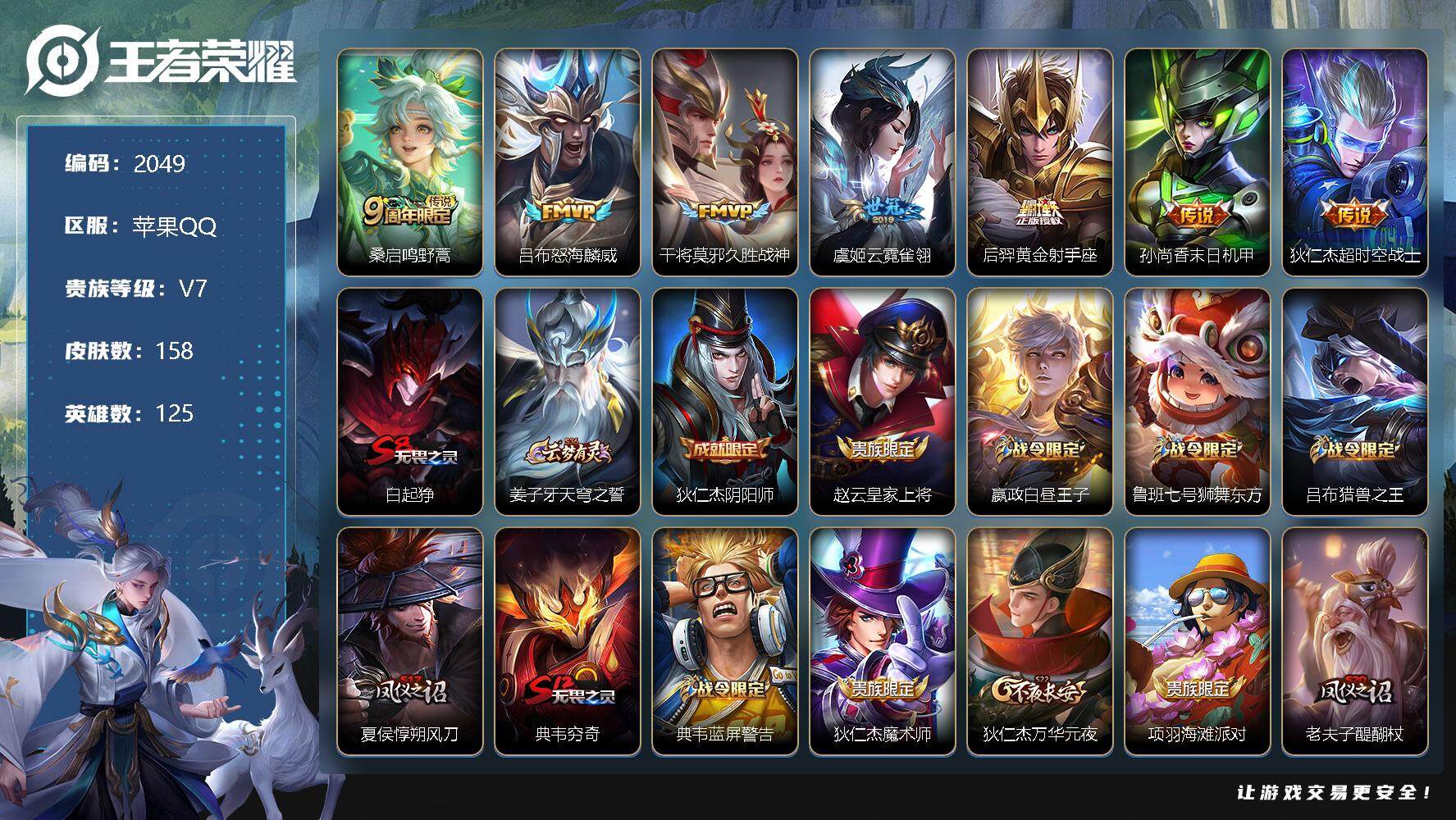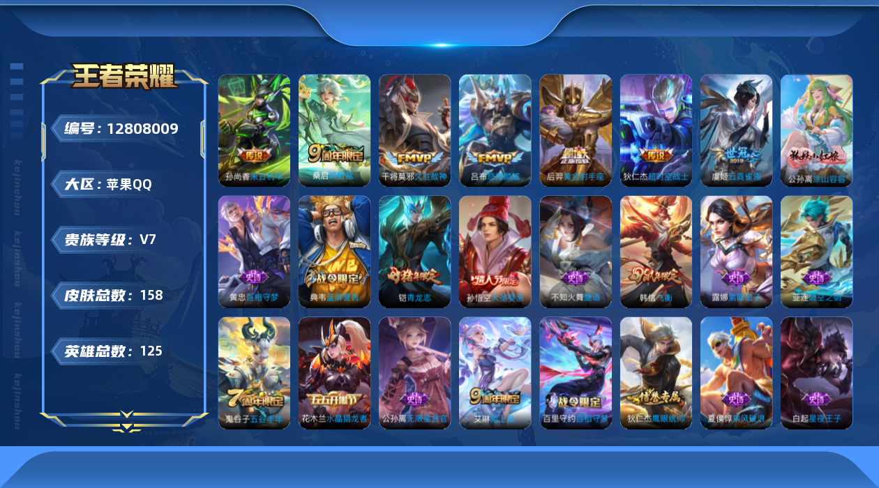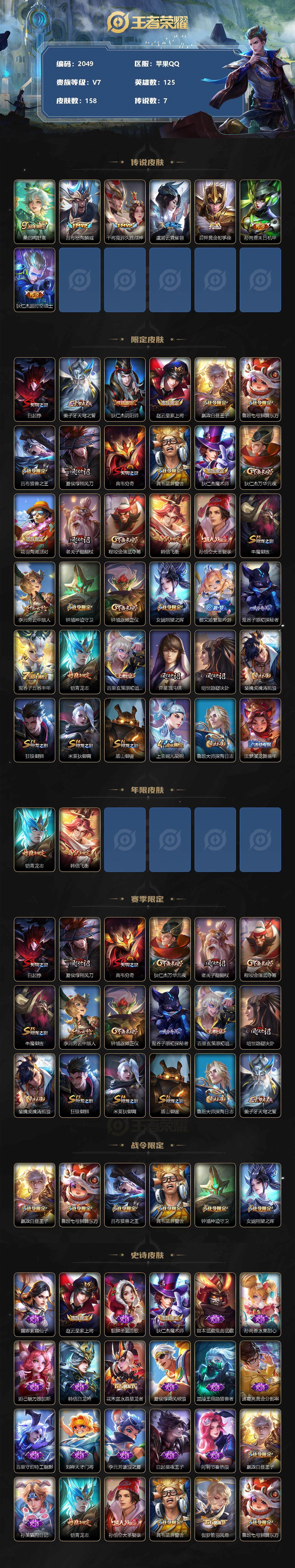 [12808009]苹果Q-V7-至尊星耀V段位-125英雄-158皮肤-0典藏-0珍品无双-0无双-0珍品传说-7传说-39史诗