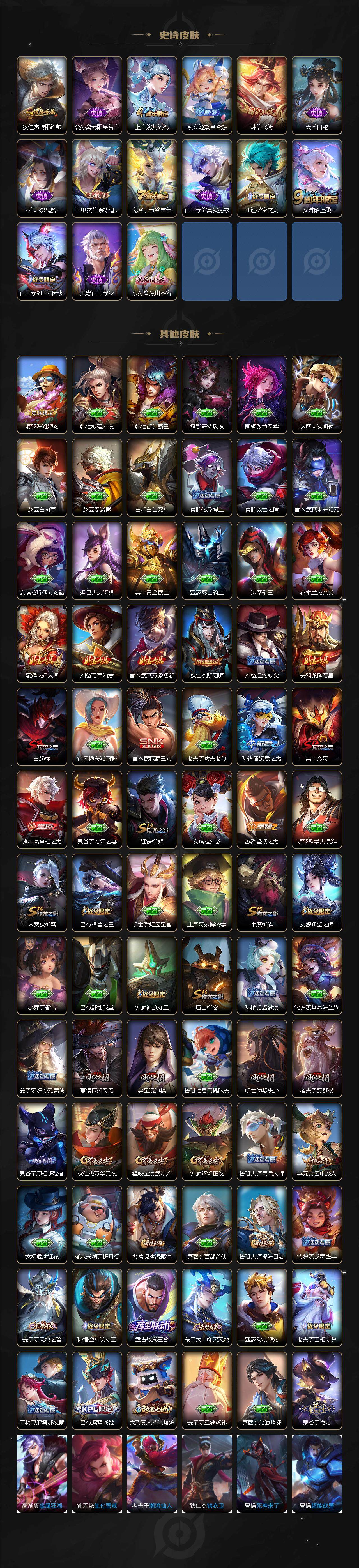【史诗皮肤】:露娜紫霞仙子,赵云皇家上将,貂蝉圣诞恋歌,狄仁杰魔术师,宫本武藏鬼剑武藏,孙尚香水果甜心,妲己魅力维加斯,韩信白龙吟,花木兰水晶猎龙者,夏侯惇乘风破浪,兰陵王暗隐猎兽者,诸葛亮黄金分割率,百里守约特工魅影,刘禅天才门将,李元芳逐浪之夏,白起星夜王子,阿轲节奏热浪,嬴政白昼王子,孙策猫狗日记,铠青龙志,孙悟空大圣娶亲,典韦蓝屏警告,伽罗箭羽风息,鲁班七号狮舞东方,狄仁杰鹰眼统帅,公孙离无限星赏官,上官婉儿梁祝,蔡文姬繁星吟游,韩信飞衡,大乔白蛇,不知火舞魅语,百里玄策原初追逐者,鬼谷子五谷丰年,百里守约真我赫兹,亚连破空之剑,艾琳陌上桑,百里守约百相守梦,黄忠百相守梦,公孙离涂山容容