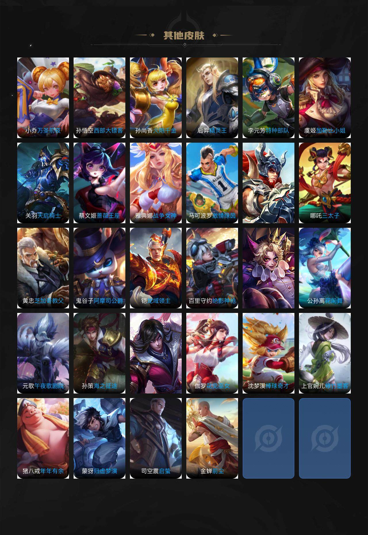 【其他皮肤】:项羽海滩派对,韩信教廷特使,韩信街头霸王,露娜哥特玫瑰,阿轲致命风华,达摩大发明家,赵云白执事,赵云忍炎影,白起白色死神,扁鹊化身博士,扁鹊救世之瞳,宫本武藏未来纪元,安琪拉玩偶对对碰,妲己少女阿狸,典韦黄金武士