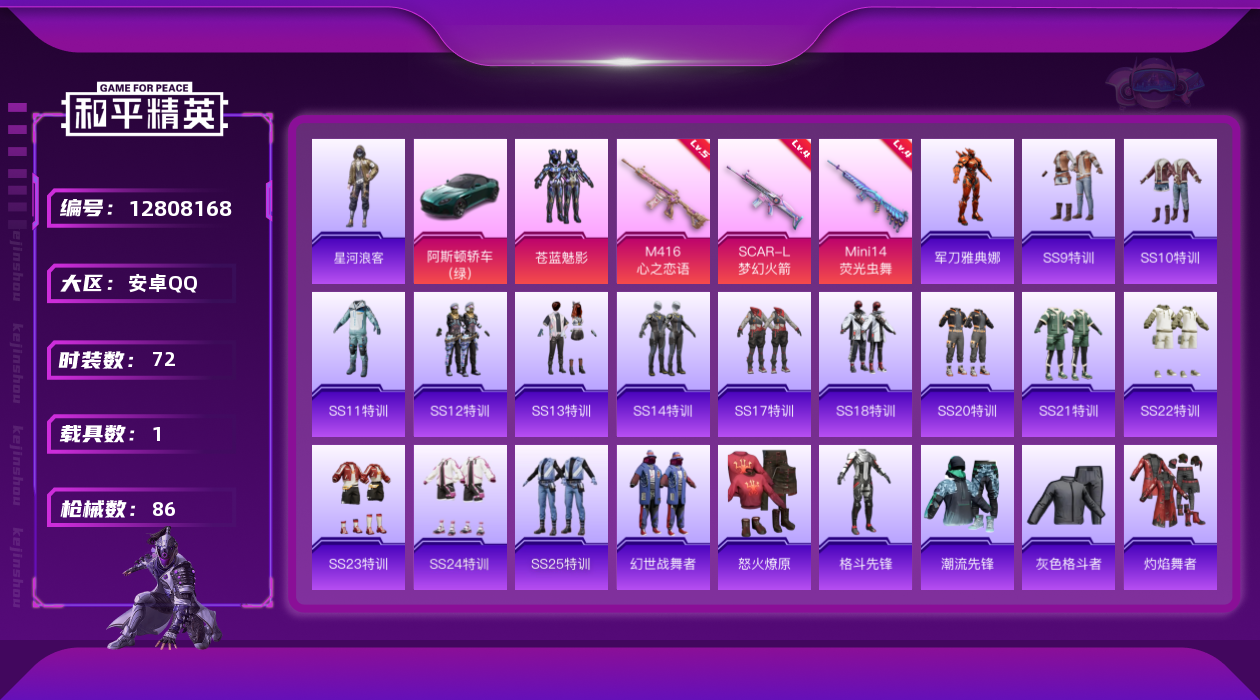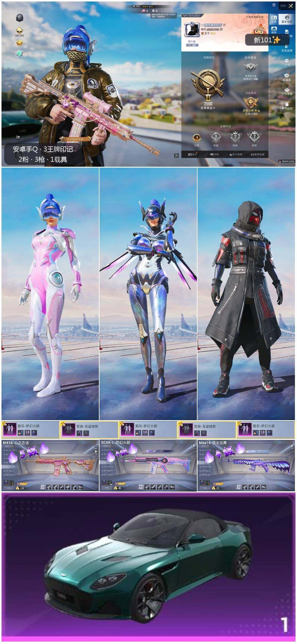 [12808168]安卓 手Q-2粉装-3特效枪-1载具-1粉色飞行器-3.2w热力值-3王牌印记-72套装-86枪皮【热门品类】:粉装-梦幻火箭,套装-奇异狩猎者,角色-军刀雅典娜,套装-星河浪客【粉色载具】:阿斯顿马丁DBS(绿)【粉色套装】:粉装-梦幻火箭,粉装-苍蓝魅影【粉色枪皮等级】:SCAR-L-梦幻火箭(四级),M416-心之恋语(五级),Mini14-荧光虫舞(四级)【粉色飞行器】:梦幻火箭飞行器
