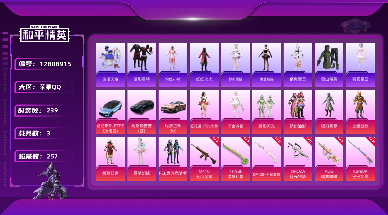 [12808915]苹果 手Q-9粉装-6特效枪-3载具-2粉色飞行器-97315热力值-18王牌印记-239套装-257枪皮