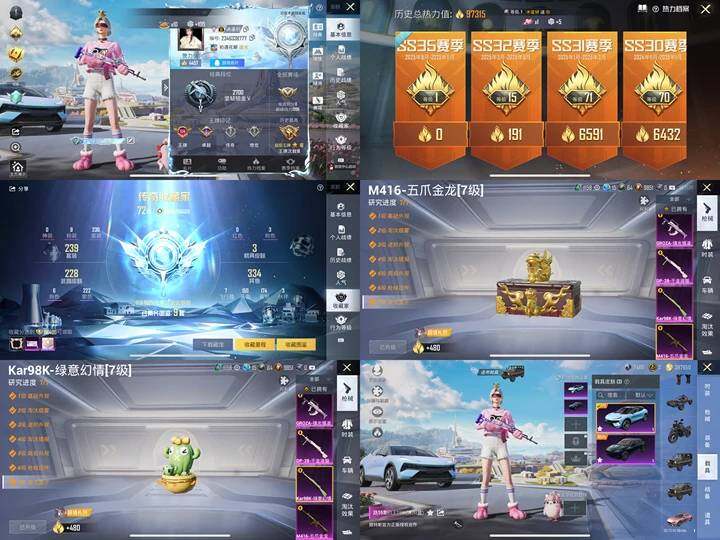 【粉色枪皮等级】:M416-五爪金龙(七级),GROZA-镜光银凌(五级),AUG-暖羊咩咩(五级),Kar98K-绿意幻情(七级),Kar98K-巳巳如意(五级),DP-28-千金淑猫(六级)