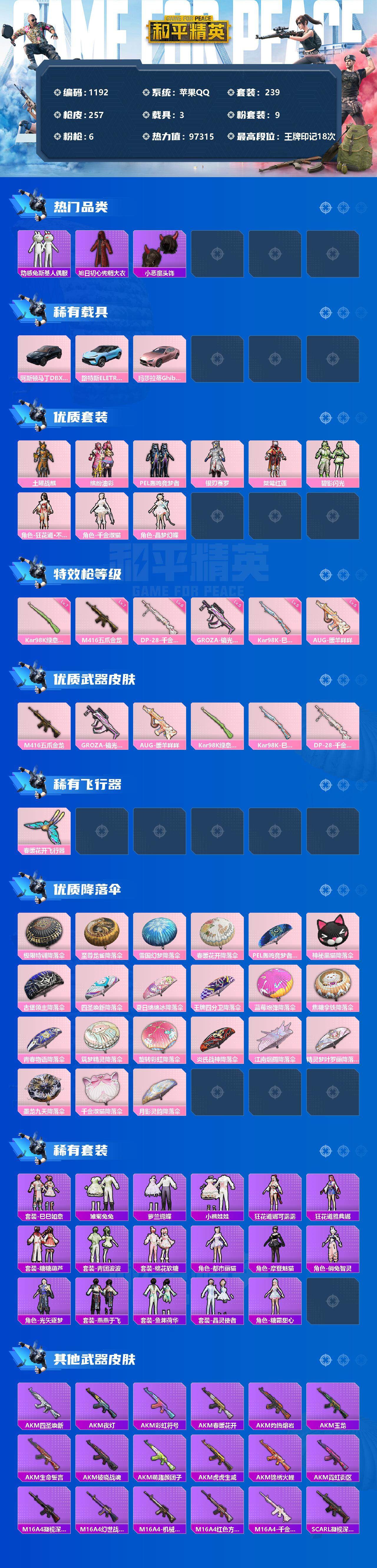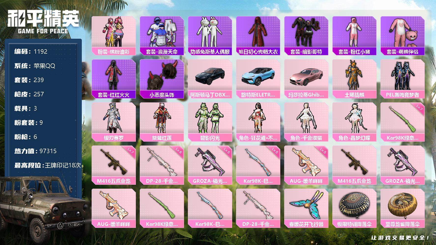 [12808915]苹果 手Q-9粉装-6特效枪-3载具-2粉色飞行器-97315热力值-18王牌印记-239套装-257枪皮 【热门品类】:粉装-缤纷油彩,套装-浪漫天命,套装-动感兔斯基人偶服,旭日初心兜帽大衣,套装-暗影哥特,套装-粉红小猪,套装-萌熊伴侣,套装-红红火火,小恶魔头饰 【粉色载具】:阿斯顿马丁DBX(蓝),路特斯ELETRE(冰川蓝),玛莎拉蒂Ghibli(粉) 【粉色套装】:粉装-土曜战麒,粉装-缤纷油彩,粉装-PEL轰鸣竞梦者,粉装-银刃赛罗,粉装-桀骜红莲,粉装-碧影闪光,角色-狂花道·不知火舞,角色-千金淑猫,角色-晶梦幻蝶 【粉色枪皮等级】:M416-五爪金龙(七级),GROZA-镜光银凌(五级),AUG-暖羊咩咩(五级),Kar98K-绿意幻情(七级),Kar98K-巳巳如意(五级),DP-28-千金淑猫(六级) 【粉色枪皮】:M416-五爪金龙,GROZA-镜光银凌,AUG-暖羊咩咩,Kar98K-绿意幻情,Kar98K-巳巳如意,DP-28-千金淑猫 【粉色飞行器】:春暖花开飞行器 【粉色降落伞】:极限特训降落伞,至尊龙雀降落伞,雪国幻梦降落伞,春暖花开降落伞,PEL轰鸣竞梦者降落伞,神秘黑猫降落伞,古堡领主降落伞,四圣焕新降落伞,夏日绵绵冰降落伞,王牌四分卫降落伞,蓝莓炮弹降落伞,焦糖拿铁降落伞,青春物语降落伞,筑梦精灵降落伞,旋转彩虹降落伞,炎氏战神降落伞,江南烟雨降落伞,精灵梦叶罗丽降落伞,墨龙九天降落伞,千金淑猫降落伞,月影灵韵降落伞 【稀有套装】:套装-巳巳如意,套装-雏菊兔兔,套装-萝兰蝴蝶,套装-小熊娃娃,角色-狂花道·娜可露露,角色-狂花道·雅典娜,套装-糖糖葫芦,套装-青团波波,套装-棉花软糖,角色-都市丽猫,角色-摩登魅猫,角色-俏兔智灵,角色-光矢逐梦,套装-燕燕于飞,套装-鱼渊荷华,套装-晶灵使者,角色-糖霜甜心 【稀有枪皮】:AKM-四圣焕新,AKM-夜灯,AKM-彩虹符号,AKM-春暖花开,AKM-灼热熔岩,AKM-玉龙,AKM-生命誓言,AKM-破晓战魂,AKM-萌趣颜团子,AKM-虎虎生威,AKM-锦绣火鲤,AKM-霓虹街区,M16A4-凝视深渊,M16A4-幻世战舞者,M16A4-机械英豪,M16A4-红色方程式,M16A4-千金淑猫,SCAR-L-凝视深渊,SCAR-L-流星咚咚,SCAR-L-炫彩节奏,SCA