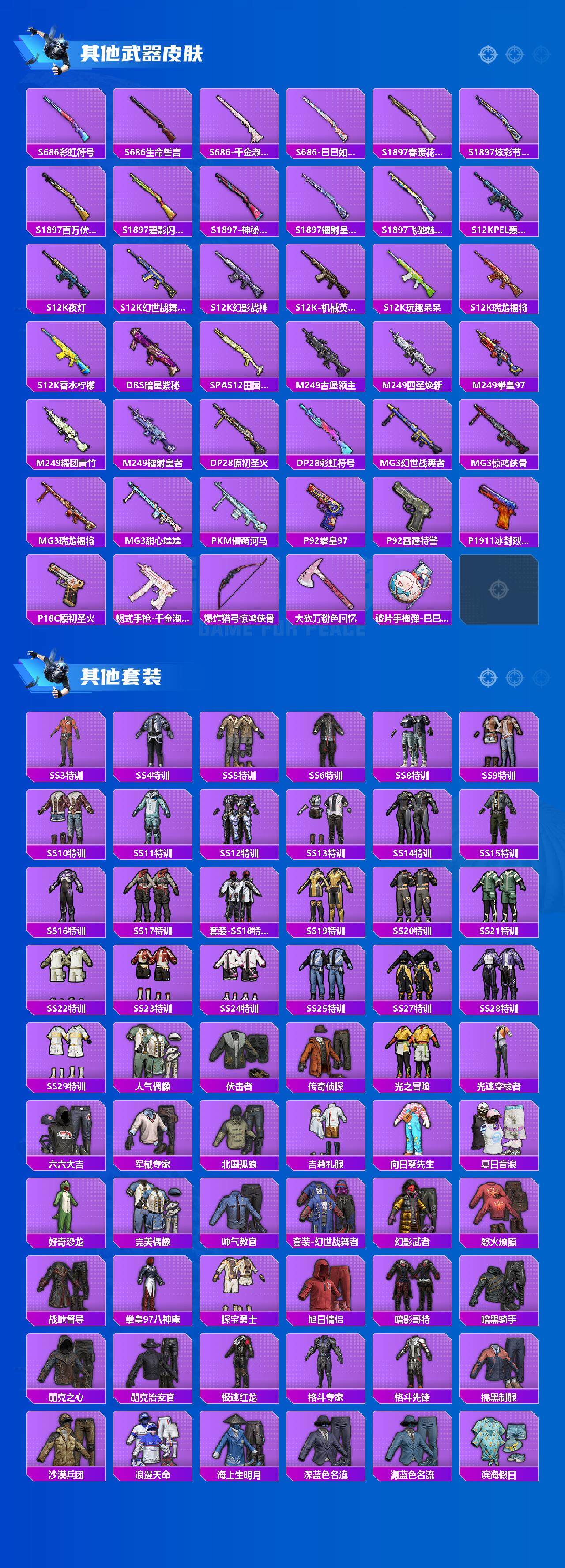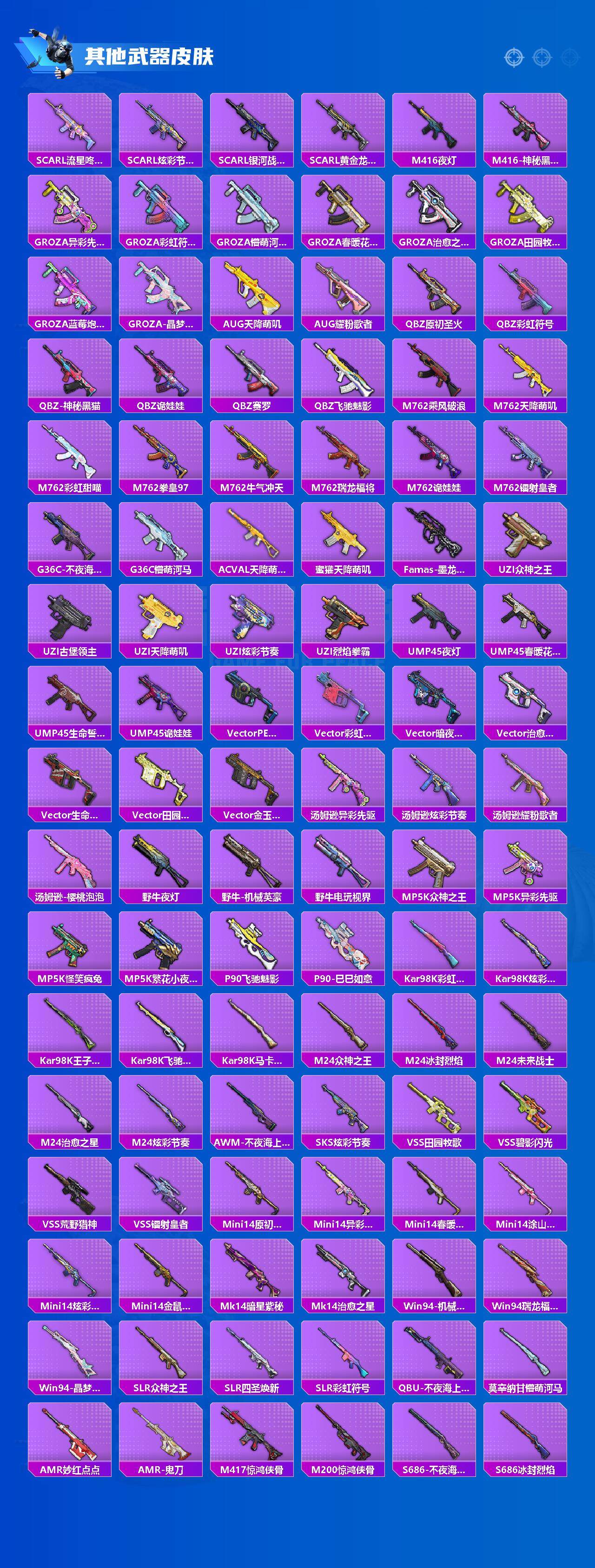 【稀有枪皮】:AKM-四圣焕新,AKM-夜灯,AKM-彩虹符号,AKM-春暖花开,AKM-灼热熔岩,AKM-玉龙,AKM-生命誓言,AKM-破晓战魂,AKM-萌趣颜团子,AKM-虎虎生威,AKM-锦绣火鲤,AKM-霓虹街区,M16A4-凝视深渊,M16A4-幻世战舞者,M16A4-机械英豪,M16A4-红色方程式,M16A4-千金淑猫,SCAR-L-凝视深渊,SCAR-L-流星咚咚,SCAR-L-炫彩节奏,SCA