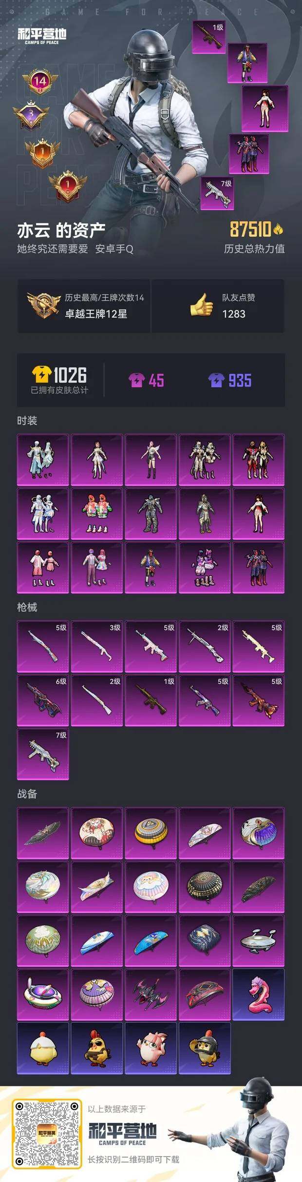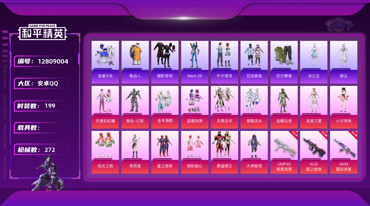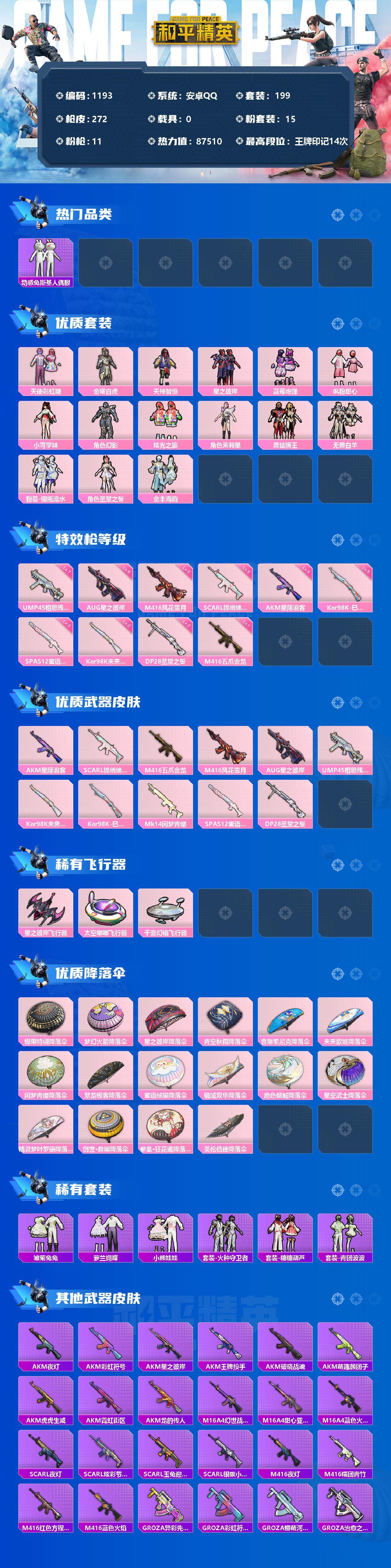 [12809004]安卓 手Q-15粉装-11特效枪-0载具-3粉色飞行器-87510热力值-14王牌印记-199套装-272枪皮 【热门品类】:套装-浪漫天命,套装-动感兔斯基人偶服,套装-龟仙人,套装-暗影哥特,角色-Mark.06 【粉色套装】:粉装-天使彩虹糖,粉装-金曜白虎,粉装-天禅智恒,粉装-星之彼岸,粉装-蓝莓炮弹,粉装-飒粉甜心,角色-小可学妹,角色-幻影,粉装-炫光之旅,角色-茉莉星,粉装-勇猛狮王,粉装-无畏白羊,粉装-银瓶流水,角色-圣堂之誓,粉装-金丰海韵 【粉色枪皮等级】:AKM-星际浪客(五级),SCAR-L-锦绣绵绵(五级),M416-五爪金龙(一级),M416-风花雪月(五级),AUG-星之彼岸(六级),UMP45-相思残雪(七级),Kar98K-未来歌姬(二级),Kar98K-巳巳如意(五级),SPAS-12-蜜语绒猫(三级),DP-28-圣堂之誓(二级) 【粉色枪皮】:AKM-星际浪客,SCAR-L-锦绣绵绵,M416-五爪金龙,M416-风花雪月,AUG-星之彼岸,UMP45-相思残雪,Kar98K-未来歌姬,Kar98K-巳巳如意,Mk14-闲梦青缨,SPAS-12-蜜语绒猫,DP-28-圣堂之誓 【粉色飞行器】:星之彼岸飞行器,太空嘟嘟飞行器,千面幻镜飞行器 【粉色降落伞】:极限特训降落伞,梦幻火箭降落伞,星之彼岸降落伞,青空秋雨降落伞,音爆索尼克降落伞,未来歌姬降落伞,闲梦青缨降落伞,繁龙极客降落伞,蜜语绒猫降落伞,镜域双华降落伞,绝色倾城降落伞,星空武士降落伞,精灵梦叶罗丽降落伞,创世·救赎降落伞,拳皇·狂花道降落伞,英伦信使降落伞 【稀有套装】:套装-龟仙人,套装-雏菊兔兔,套装-萝兰蝴蝶,套装-小熊娃娃,套装-火种守卫者,套装-糖糖葫芦,套装-青团波波 【稀有枪皮】:AKM-夜灯,AKM-彩虹符号,AKM-星之彼岸,AKM-王牌投手,AKM-破晓战魂,AKM-萌趣颜团子,AKM-虎虎生威,AKM-霓虹街区,AKM-龙的传人,M16A4-幻世战舞者,M16A4-甜心亚梦,M16A4-蓝色火焰,SCAR-L-夜灯,SCAR-L-炫彩节奏,SCAR-L-玉兔迎春,SCAR-L-银碳小老虎,M416-夜灯,M416-糯团青竹,M416-红色方程式,M416-蓝色火焰,GROZA-异彩先驱,GROZA-彩虹符号,GROZA-懵萌河马,GROZ