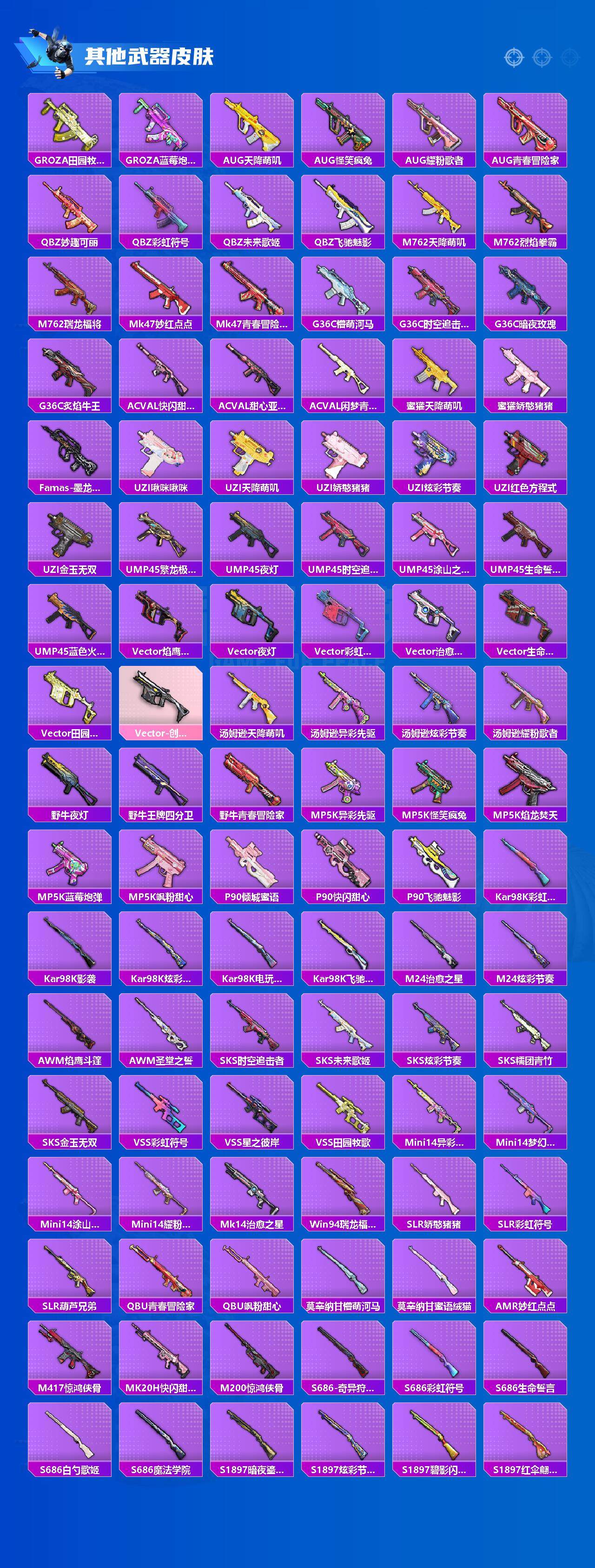 【粉色枪皮】:AKM-星际浪客,SCAR-L-锦绣绵绵,M416-五爪金龙,M416-风花雪月,AUG-星之彼岸,UMP45-相思残雪,Kar98K-未来歌姬,Kar98K-巳巳如意,Mk14-闲梦青缨,SPAS-12-蜜语绒猫,DP-28-圣堂之誓