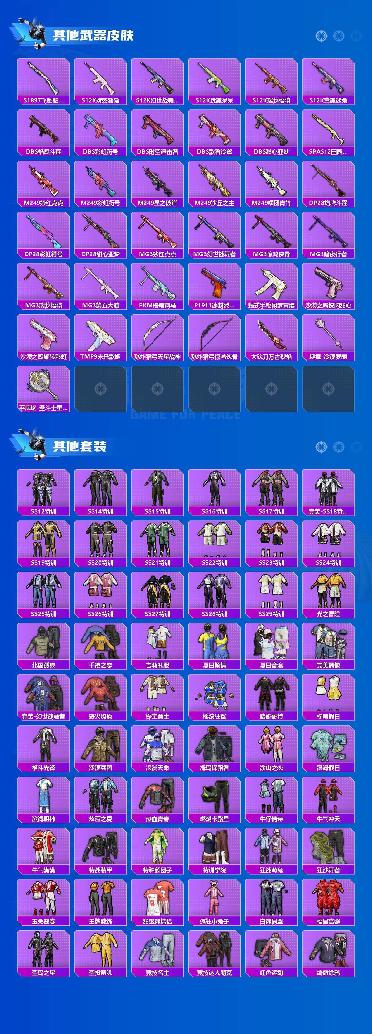 AKM-星际浪客,M416-五爪金龙,M416-风花雪月,AUG-星之彼岸,UMP45-相思残雪,Kar98K-未来歌姬,Kar98K-巳巳如意,Mk14-闲梦青缨,SPAS-12-蜜语绒猫,DP-28-圣堂之誓