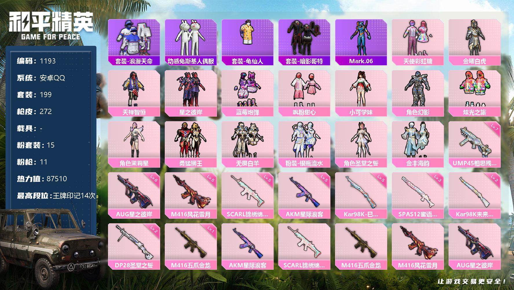 [12809004]安卓 手Q-15粉装-11特效枪-0载具-3粉色飞行器-87510热力值-14王牌印记-199套装-272枪皮
