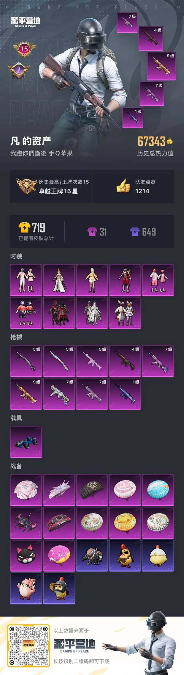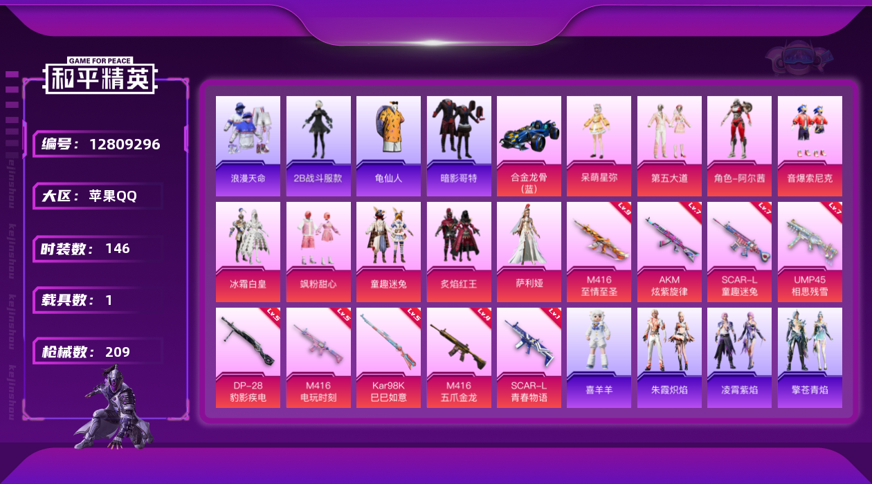 [12809296]苹果 手Q-9粉装-9特效枪-1载具-1粉色飞行器-67343热力值-15王牌印记-146套装-209枪皮