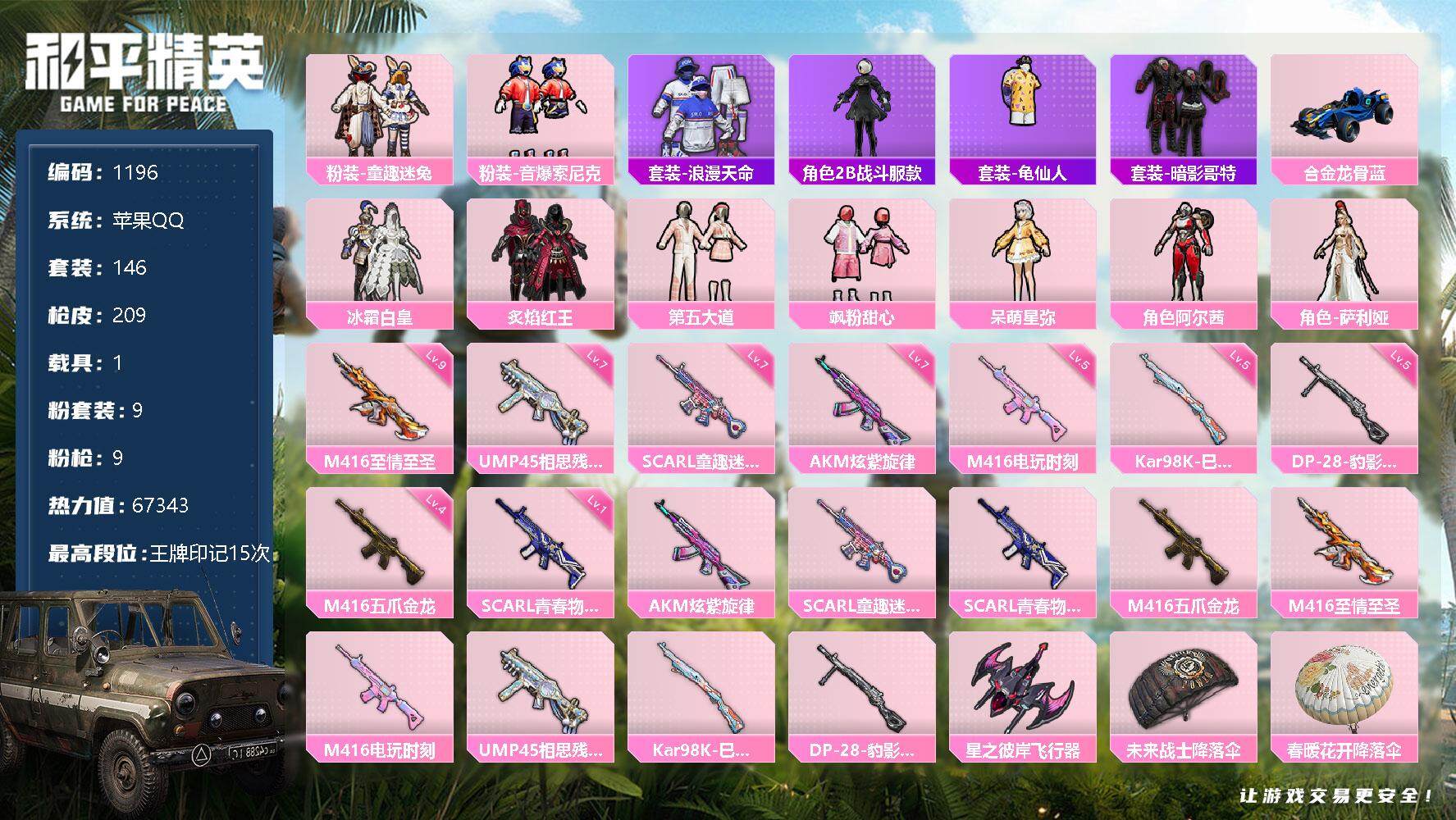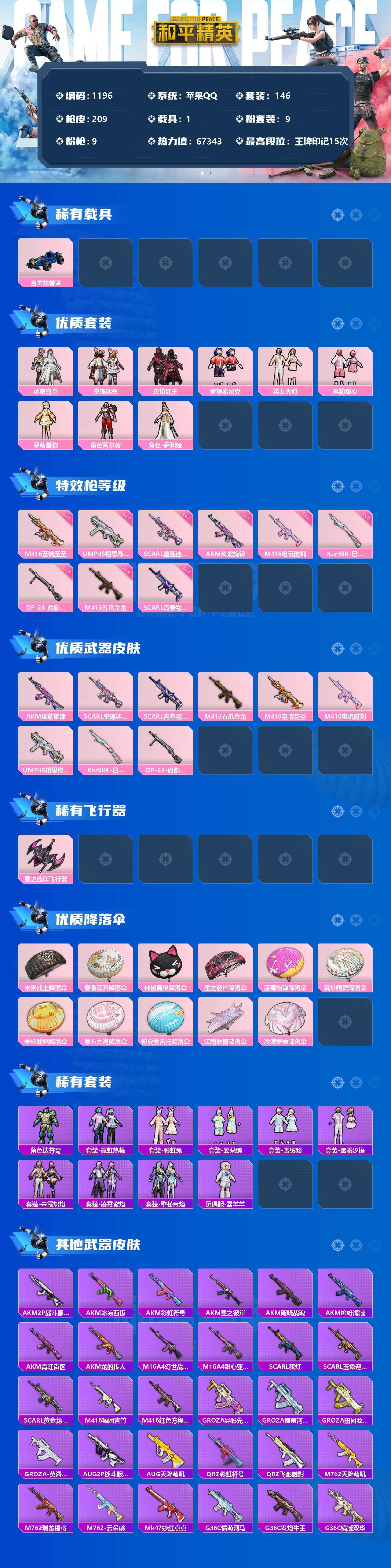 [12809296]苹果 手Q-9粉装-9特效枪-1载具-1粉色飞行器-67343热力值-15王牌印记-146套装-209枪皮 【热门品类】:粉装-童趣迷兔,粉装-音爆索尼克,套装-浪漫天命,角色-2B战斗服款,套装-龟仙人,套装-暗影哥特 【粉色载具】:合金龙骨(蓝) 【粉色套装】:粉装-冰霜白皇,粉装-童趣迷兔,粉装-炙焰红王,粉装-音爆索尼克,粉装-第五大道,粉装-飒粉甜心,角色-呆萌星弥,角色-阿尔茜,角色-萨利娅 【粉色枪皮等级】:AKM-炫紫旋律(七级),SCAR-L-童趣迷兔(七级),SCAR-L-青春物语(一级),M416-五爪金龙(四级),M416-至情至圣(九级),M416-电玩时刻(五级),UMP45-相思残雪(七级),Kar98K-巳巳如意(五级),DP-28-豹影疾电(五级) 【粉色枪皮】:AKM-炫紫旋律,SCAR-L-童趣迷兔,SCAR-L-青春物语,M416-五爪金龙,M416-至情至圣,M416-电玩时刻,UMP45-相思残雪,Kar98K-巳巳如意,DP-28-豹影疾电 【粉色飞行器】:星之彼岸飞行器 【粉色降落伞】:未来战士降落伞,春暖花开降落伞,神秘黑猫降落伞,星之彼岸降落伞,蓝莓炮弹降落伞,筑梦精灵降落伞,垂柳戏鸭降落伞,第五大道降落伞,仲夏莫吉托降落伞,江南烟雨降落伞,冷漠罗丽降落伞 【稀有套装】:套装-龟仙人,角色-达芬奇,套装-霓虹热舞,套装-彩虹兔,套装-云朵鹅,套装-雪绒豹,套装-蜜露汐语,套装-朱霞炽焰,套装-凌霄紫焰,套装-擎苍青焰,玩偶服-喜羊羊 【稀有枪皮】:AKM-2P战斗服款,AKM-冰凉西瓜,AKM-彩虹符号,AKM-星之彼岸,AKM-破晓战魂,AKM-缤纷海域,AKM-霓虹街区,AKM-龙的传人,M16A4-幻世战舞者,M16A4-甜心亚梦,SCAR-L-夜灯,SCAR-L-玉兔迎春,SCAR-L-黄金龙骨,M416-糯团青竹,M416-红色方程式,GROZA-异彩先驱,GROZA-懵萌河马,GROZA-田园牧歌,GROZA-荧海星豚,AUG-2P战斗服款,AUG-天降萌叽,QBZ-彩虹符号,QBZ-飞驰魅影,M762-天降萌叽,M762-瑞龙福将,M762-云朵鹅,Mk47-妙红点点,G36C-镜域双华,G36C-懵萌河马,G36C-炙焰牛王,G36C-星穹咏叹调,AC-VAL-天降萌叽,AC-VAL-快闪甜心,A