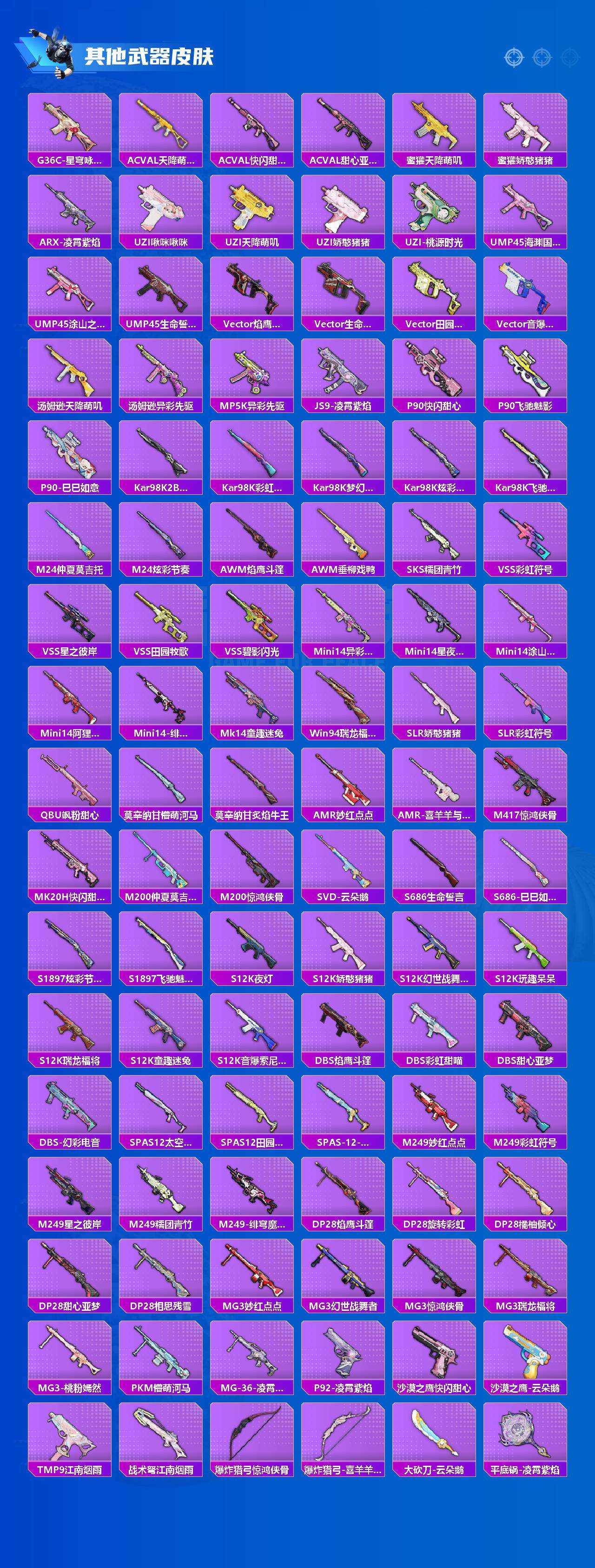 【粉色枪皮】:AKM-炫紫旋律,SCAR-L-童趣迷兔,SCAR-L-青春物语,M416-五爪金龙,M416-至情至圣,M416-电玩时刻,UMP45-相思残雪,Kar98K-巳巳如意,DP-28-豹影疾电