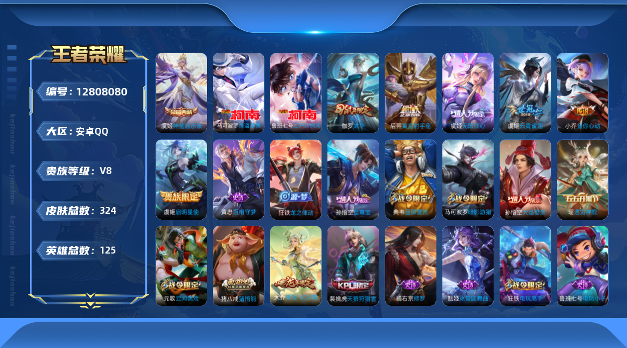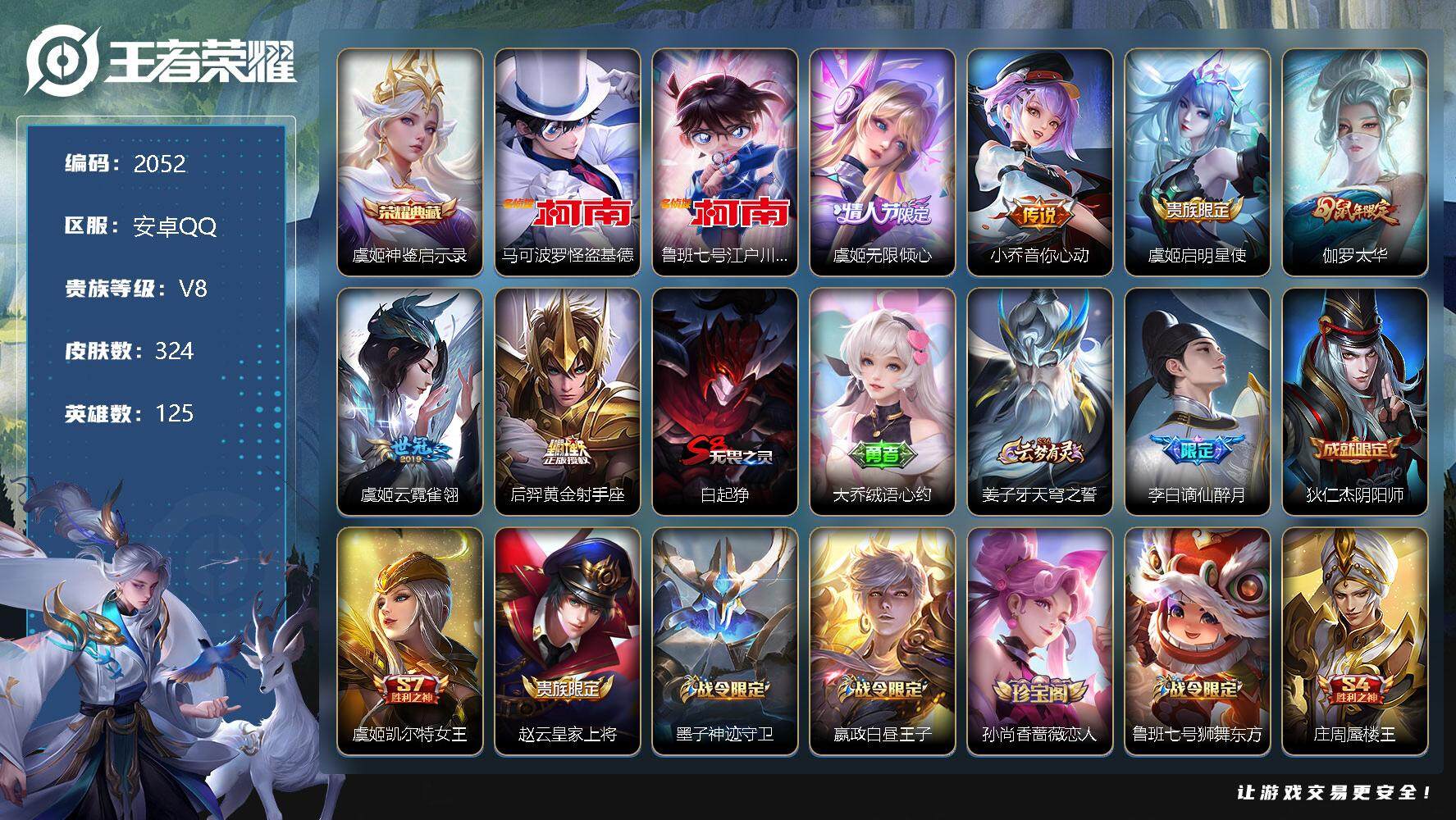 - [12279874]V8 2典藏 1珍品传说 28传说 124英雄 294皮肤 可修改实名 连体和平 优质装备:鸣剑·曳影,九霄神辉(木兰典藏),器灵·落星盏,黄金狮子座,黄金射手座,云鹰飞将(小将军),黄金白羊座,久胜战神,炽阳神光,一念神魔,末日机甲-孙尚香(绿蚂蚱),仲夏夜之梦(大飞蛾),地狱之眼,时之恋人-刘备(电焊工),无双飞将,记忆之芯(机甲兔),霜月吟,澜逐花归海,琥珀纪元马超,涂山容容 传说皮:祥瑞亨通,幻光神枪 珍宝阁皮:妄想食味,胡桃夹子 限定皮:愿照·九州拓(澜年限),愿照·岁时盈(虞姬年限),愿照·山河定(司空震年限),愿照·众生和(妲己年限),愿照·千秋盛(女娲年限),逐霄战戟,鸣野蒿,至尊宝,白晶晶,高山流水,诗剑行,齐天大圣,五谷丰年,冰锋战神,梁祝,岱宗(典韦年限),李小龙,孙行者,大圣娶亲,启示之音 史诗皮:鸭鸭历险记-刘禅,器灵·浮梦炉,化蝶舞,星界战将,龙之律动,雪豹·霜爪,藏狐·褐绒,石田雨龙,百相守梦-周瑜,茶境仙,怒海争锋,炽弈燎原,破空之剑,蔬乡物语(鲁班七号),百相守梦-百里守约,星界特工,织梦人,紫霞仙子,电玩小子(小书包),白龙吟,特工魅影,千年之狐,永昼,江河有灵,浮梦罗烟,魅语,百解令(蒙犽),高渐离燃音魔法,蒙恬荣光圣徽,冰冠公主,青蛇,晚萤,末日机甲-吕布,猫狗日记-孙策,猫狗日记-大乔,时之恋人-孙尚香,节奏热浪,修罗,女仆咖啡,摇滚巨星,水果甜心,天才门将,星夜王子,心灵骇客,功夫厨神,德古拉伯爵,暗隐猎兽者,幽灵船长,鬼剑武藏,暗渊魔法,心灵战警,天秀·启明,舞动绿茵,地狱岩魂,纤云弄巧,拒霜思,缤纷独角兽,乘风破浪,逐浪之夏,水晶猎龙者,曙光守护者,热力回旋,箭羽风息,金属风暴,原初追逐者,圣诞狂欢,圣诞恋歌,鹰眼统帅,魅力维加斯,无心