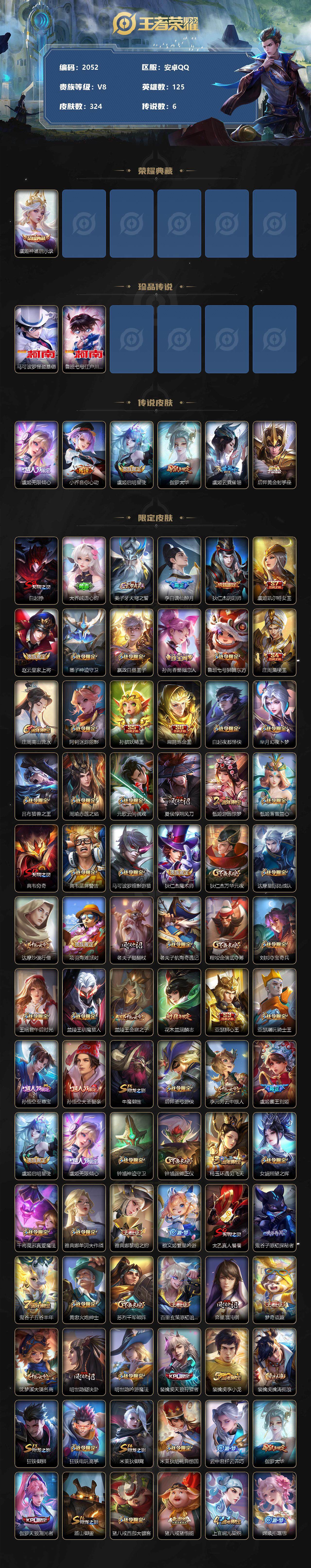 [12808080]安卓Q-V6-永恒钻石III段位-125英雄-324皮肤-1典藏-0珍品无双-0无双-2珍品传说-6传说-99史诗