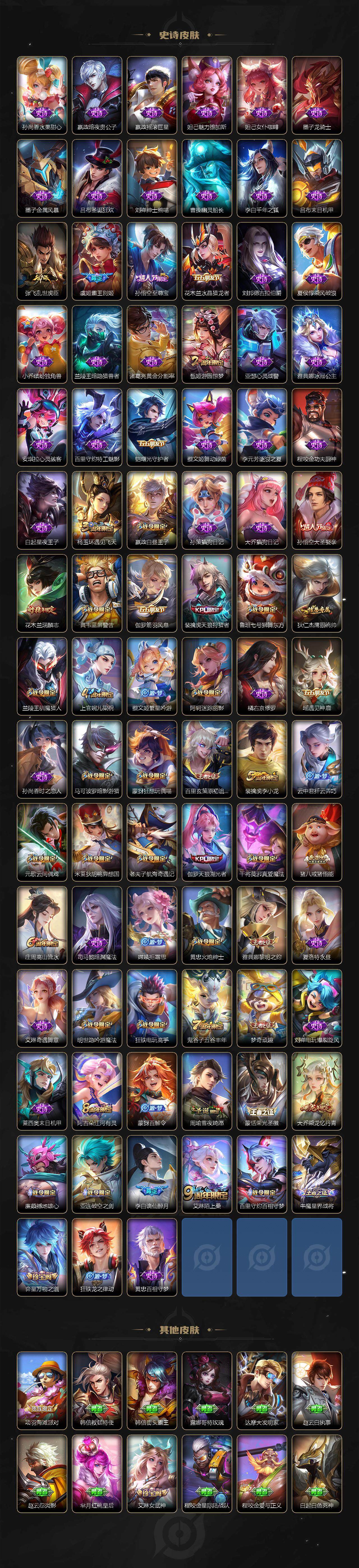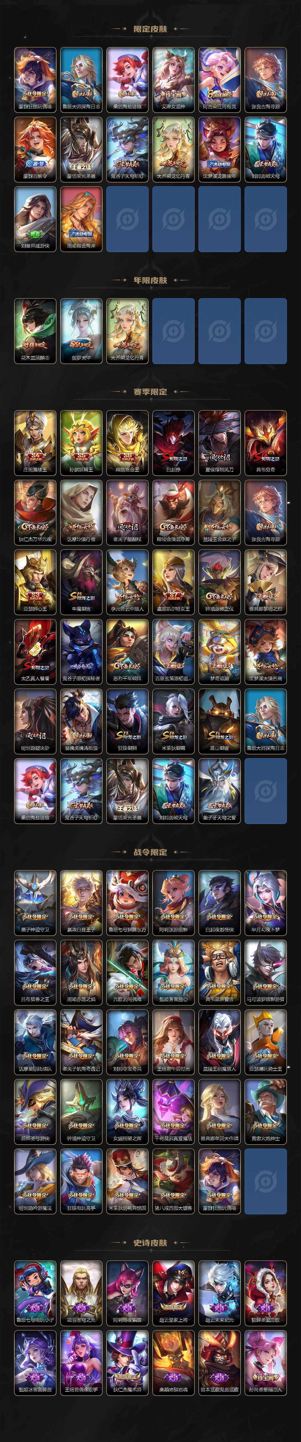 【限定皮肤】:白起狰,大乔绒语心约,姜子牙天穹之誓,李白谪仙醉月,狄仁杰阴阳师,虞姬凯尔特女王,赵云皇家上将,墨子神迹守卫,嬴政白昼王子,孙尚香蔷薇恋人,鲁班七号狮舞东方,庄周蜃楼王,庄周高山流水,阿轲迷踪丽影,孙膑妖精王,扁鹊炼金王,白起夜都怪侠,芈月幻夜卜梦,吕布猎兽之王,周瑜赤莲之焰,元歌云间偶戏,夏侯惇朔风刀,甄姬游园惊梦,甄姬落雪兰心,典韦穷奇,典韦蓝屏警告,马可波罗暗影游猎,狄仁杰魔术师,狄仁杰万华元夜,达摩星际陆战队,达摩沙漠行僧,项羽海滩派对,老夫子醍醐杖,老夫子航海奇遇记,程咬金演武夺筹,刘邦夺宝奇兵,王昭君午后时光,兰陵王驯魔猎人,兰陵王金庭之子,花木兰瑞麟志,亚瑟狮心王,亚瑟潮玩骑士王,孙悟空至尊宝,孙悟空大圣娶亲,牛魔御旌,后羿圣弓游侠,李元芳云中旅人,虞姬霸王别姬,虞姬启明星使,虞姬无限倾心,钟馗神迹守卫,钟馗驱傩正仪,杨玉环遇见飞天,女娲朔望之晖,干将莫邪真爱魔法,雅典娜单词大作战,雅典娜黎明之约,蔡文姬繁星吟游,太乙真人饕餮,鬼谷子原初探秘者,鬼谷子五谷丰年,黄忠火炮绅士,苏烈千军破阵,百里玄策原初追逐者,弈星混沌棋,梦奇顽趣,沈梦溪大漠名商,明世隐疑决卦,明世隐吟游魔法,裴擒虎天狼狩猎者,裴擒虎李小龙,裴擒虎擒涛扼浪,狂铁御狮,狂铁电玩高手,米莱狄御霄,米莱狄胡桃异想国,云中君纤云弄巧,伽罗太华,伽罗天狼溯光者,盾山御銮,猪八戒西部大镖客,猪八戒猪悟能,上官婉儿梁祝,嫦娥拒霜思,蒙犽狂想玩偶喵,鲁班大师探海日志,桑启海盐诗旅,艾琳女武神,阿古朵江河有灵,张良古海寻踪,蒙犽百解令,蒙恬荣光圣徽,鬼谷子天穹祈灯,大乔乘龙忆丹青,沈梦溪龙舞盛年,刘邦剑破天穹,刘备异域游侠,周瑜熔金海岸