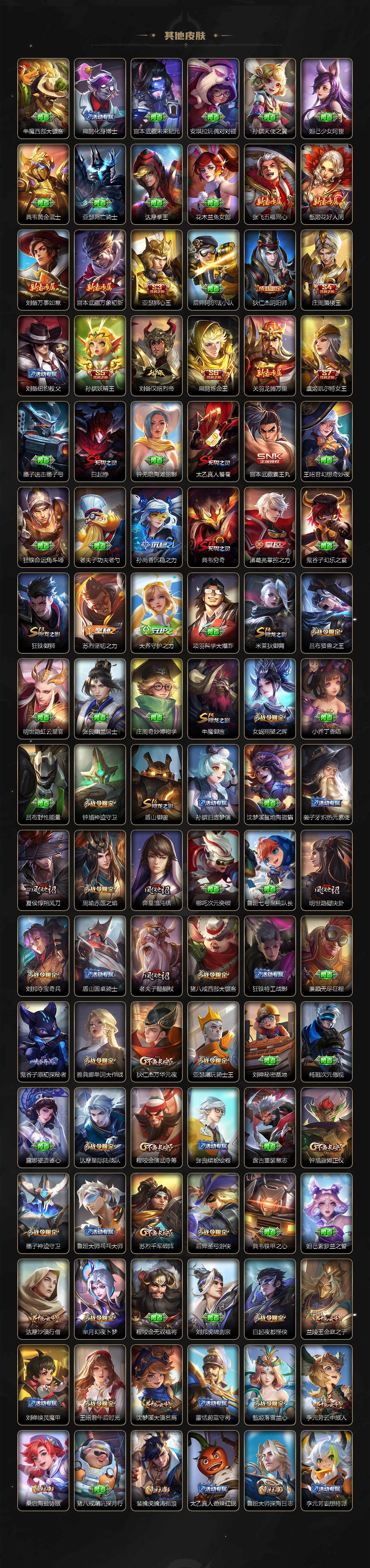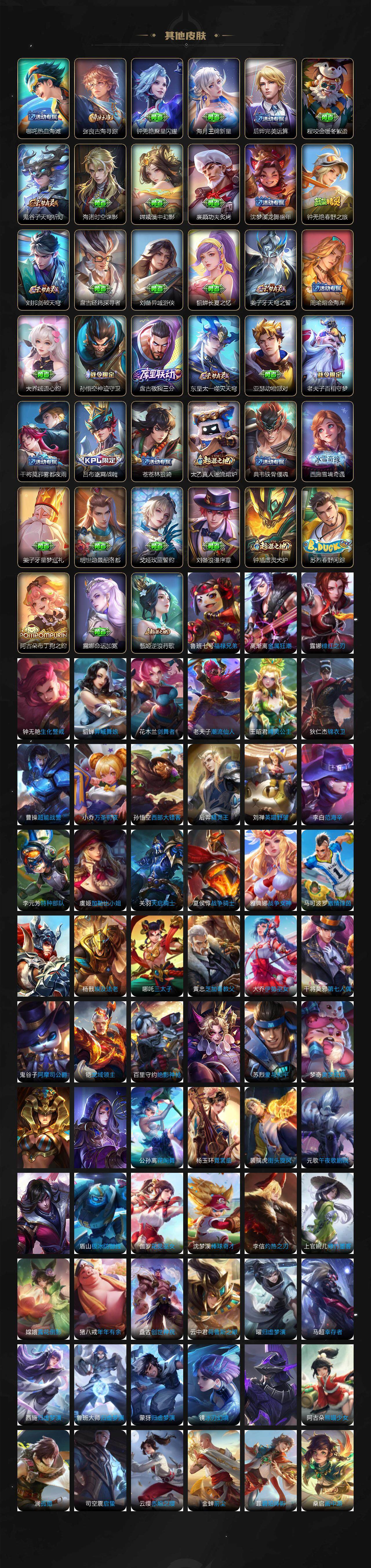 瑶遇见神鹿,伽罗箭羽风息,李元芳逐浪之夏,大乔猫狗日记,孙策猫狗日记,诸葛亮黄金分割率,王昭君偶像歌手,项羽苍穹之光,孙尚香时之恋人,阿轲暗夜猫娘,雅典娜冰冠公主,吕布末日机甲,鲁班七号电玩小子,橘右京修罗,墨子龙骑士,嬴政摇滚巨星,刘禅绅士熊喵,白起星夜王子,安琪拉心灵骇客,程咬金功夫厨神,刘邦德古拉伯爵,兰陵王暗隐猎兽者,曹操幽灵船长,宫本武藏鬼剑武藏,司马懿暗渊魔法,亚瑟心灵战警,蔡文姬舞动绿茵,廉颇地狱岩魂,小乔缤纷独角兽,夏侯惇乘风破浪,花木兰水晶猎龙者,铠曙光守护者,墨子金属风暴,百里玄策原初追逐者,吕布圣诞狂欢,貂蝉圣诞恋歌,百里守约特工魅影,嬴政暗夜贵公子,嫦娥拒霜思,雅典娜黎明之约,李白千年之狐,夏洛特永昼,艾琳奇遇舞章,刘禅电玩·爆裂旋风,莱西奥末日机甲,蒙犽百解令,周瑜雪夜绮愿,大乔乘龙·忆丹青,李白谪仙醉月