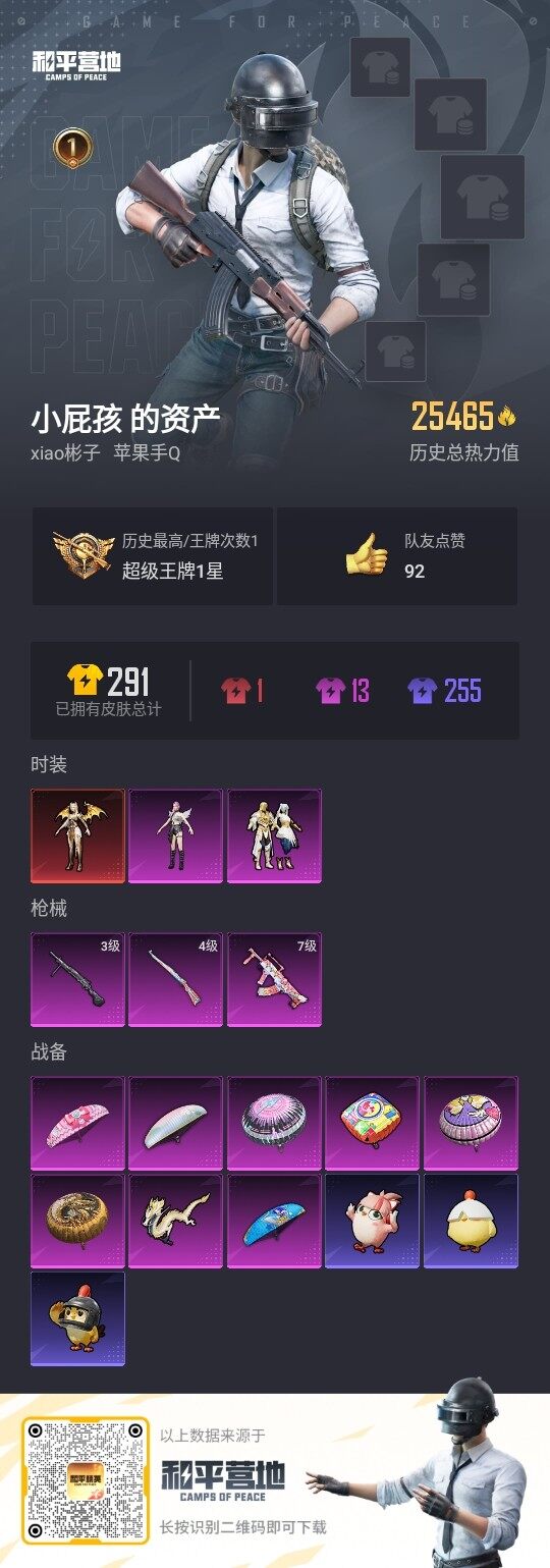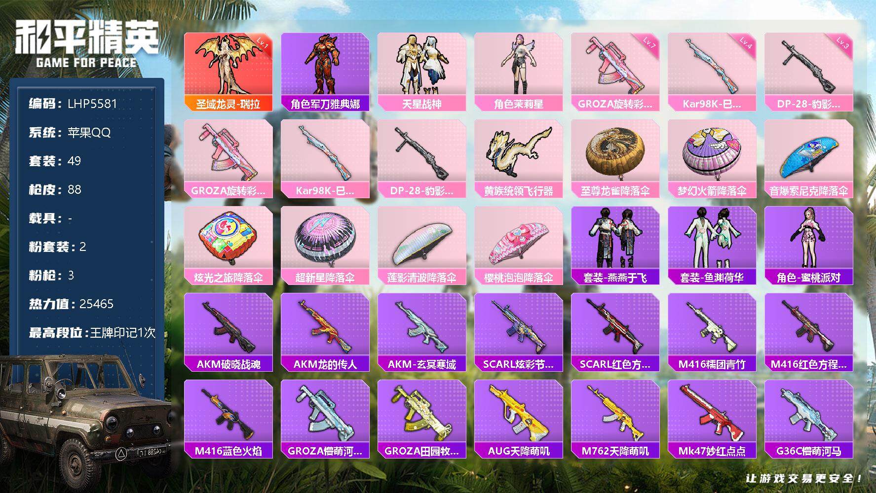 [12808151]素材身法号 苹果 手Q-1神装-2粉装-3特效枪-1粉色飞行器-2.5w热力值-1王牌印记-49套装-88枪皮【红色神装等级】:圣域龙灵-瑞拉(一级)【热门品类】:角色-军刀雅典娜【粉色套装】:粉装-天星战神,角色-茉莉星【粉色枪皮等级】:GROZA-旋转彩虹(七级),Kar98K-巳巳如意(四级),DP-28-豹影疾电(三级)【粉色飞行器】:黄族统领飞行器