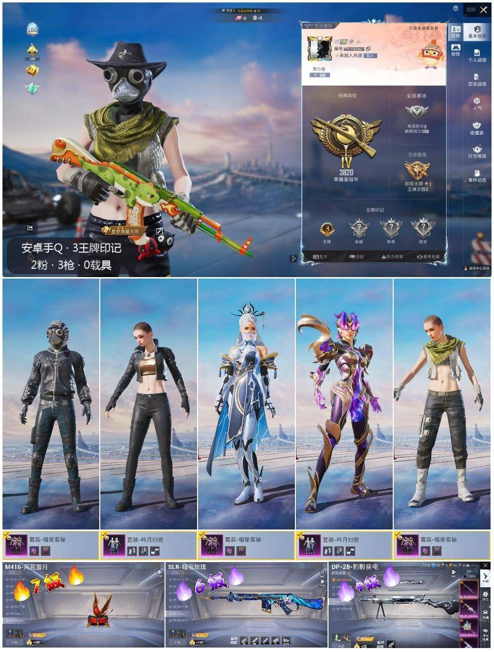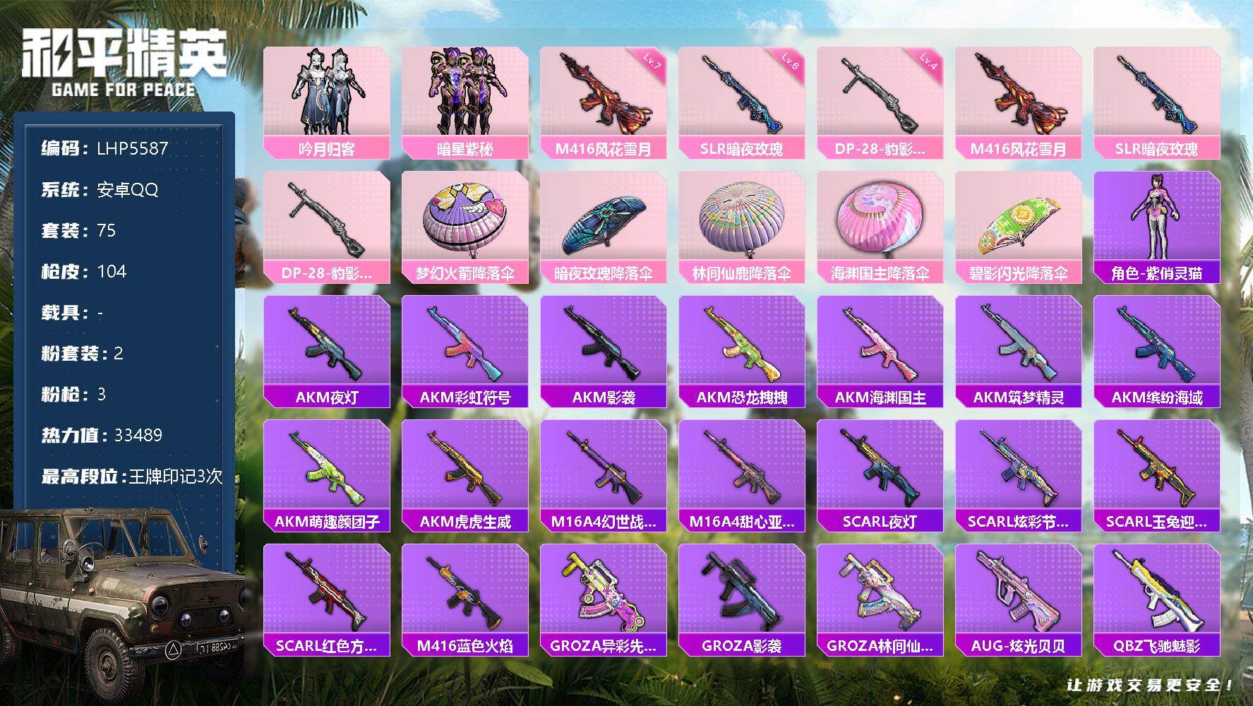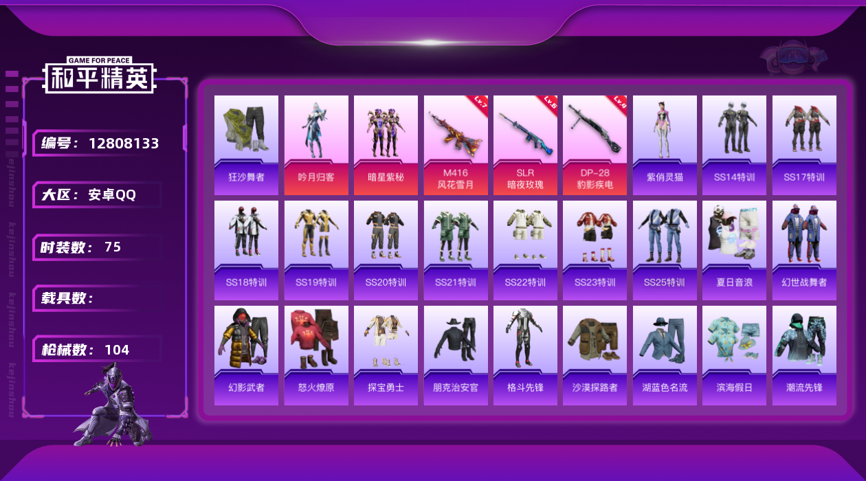 [12808133]安卓 手Q-2粉装-3特效枪-3.3w热力值-3王牌印记-75套装-104枪皮【粉色套装】:粉装-吟月归客,粉装-暗星紫秘【粉色枪皮等级】:M416-风花雪月(七级),SLR-暗夜玫瑰(六级),DP-28-豹影疾电(四级)