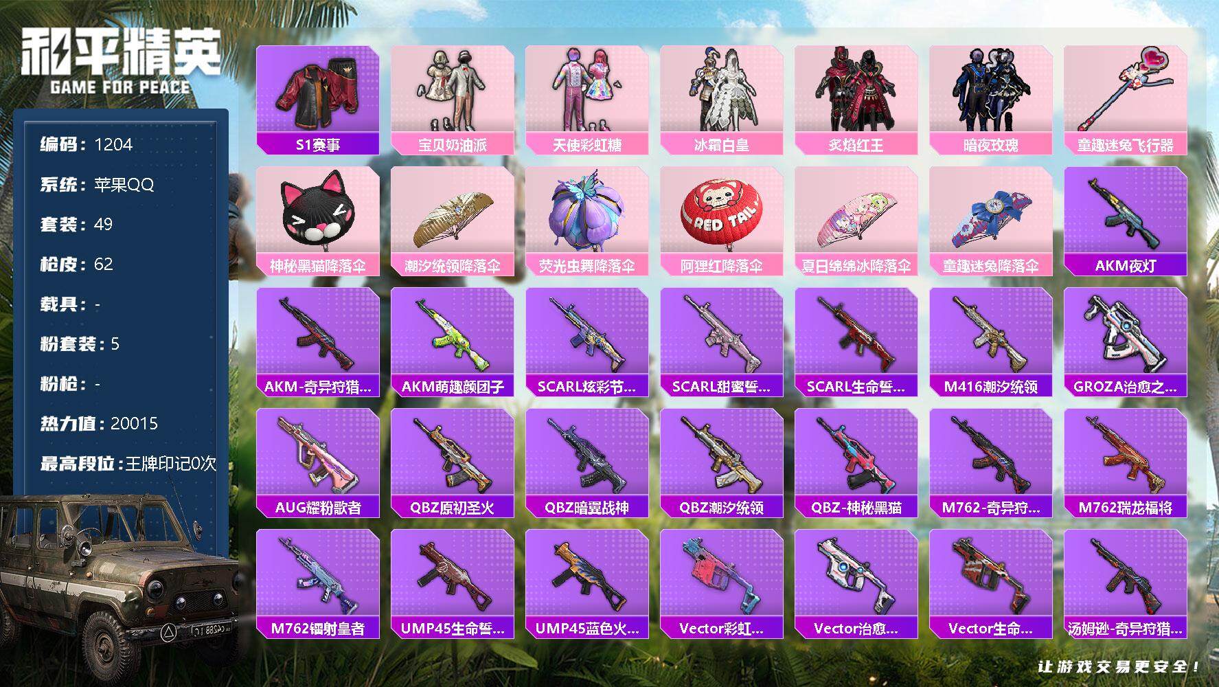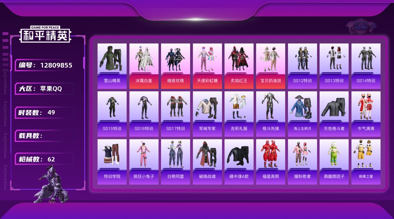 [12809855]苹果 手Q-5粉装-0特效枪-0载具-1粉色飞行器-20015热力值-1王牌印记-49套装-62枪皮