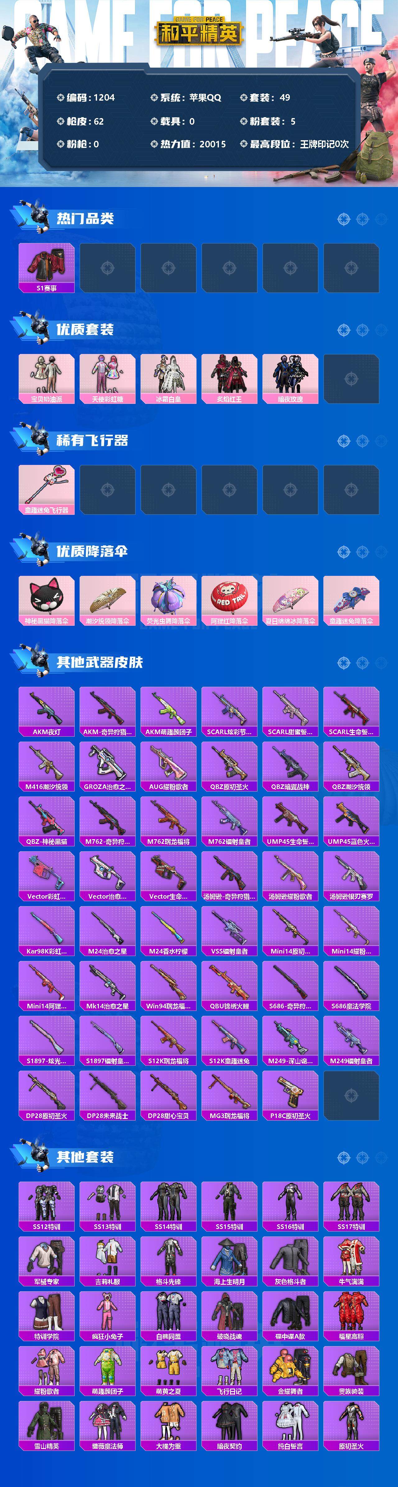 [12809855]苹果 手Q-5粉装-0特效枪-0载具-1粉色飞行器-20015热力值-1王牌印记-49套装-62枪皮 【热门品类】:套装-S1赛事 【粉色套装】:粉装-宝贝奶油派,粉装-天使彩虹糖,粉装-冰霜白皇,粉装-炙焰红王,粉装-暗夜玫瑰 【粉色飞行器】:童趣迷兔飞行器 【粉色降落伞】:神秘黑猫降落伞,潮汐统领降落伞,荧光虫舞降落伞,阿狸红降落伞,夏日绵绵冰降落伞,童趣迷兔降落伞 【稀有枪皮】:AKM-夜灯,AKM-奇异狩猎者,AKM-萌趣颜团子,SCAR-L-炫彩节奏,SCAR-L-甜蜜誓约,SCAR-L-生命誓言,M416-潮汐统领,GROZA-治愈之星,AUG-耀粉歌者,QBZ-原初圣火,QBZ-暗翼战神,QBZ-潮汐统领,QBZ-神秘黑猫,M762-奇异狩猎者,M762-瑞龙福将,M762-镭射皇者,UMP45-生命誓言,UMP45-蓝色火焰,Vector-彩虹符号,Vector-治愈之星,Vector-生命誓言,汤姆逊-奇异狩猎者,汤姆逊-耀粉歌者,汤姆逊-银刃赛罗,Kar98K-彩虹符号,M24-治愈之星,M24-香水柠檬,VSS-镭射皇者,Mini14-原初圣火,Mini14-耀粉歌者,Mini14-阿狸红,Mk14-治愈之星,Win94-瑞龙福将,QBU-锦绣火鲤,S686-奇异狩猎者,S686-魔法学院,S1897-炫光贝贝,S1897-镭射皇者,S12K-瑞龙福将,S12K-童趣迷兔,M249-深山诡影,M249-镭射皇者,DP-28-原初圣火,DP-28-未来战士,DP-28-甜心宝贝,MG3-瑞龙福将,P18C-原初圣火 【其他套装】:套装-SS12特训,套装-SS13特训,套装-SS14特训,套装-SS15特训,套装-SS16特训,套装-SS17特训,套装-军械专家,套装-吉莉礼服,套装-格斗先锋,套装-海上生明月,套装-灰色格斗者,套装-牛气满满,套装-特训学院,套装-疯狂小兔子,套装-白熊同盟,套装-破晓战魂,套装-碟中谍A款,套装-福星高照,套装-耀粉歌者,套装-萌趣颜团子,套装-萌黄之夏,套装-飞行日记,套装-金耀舞者,套装-贵族骑装,套装-雪山精英,套装-蔷薇魔法师,套装-大橘为重,套装-暗夜契约,套装-纯白誓言,套装-原初圣火,套装-逆风勇士,套装-辉星之火,套装-镭射皇者,套装-银白舞王,套装-闪金天王,套装-娴静芝兰,套装-深山诡影