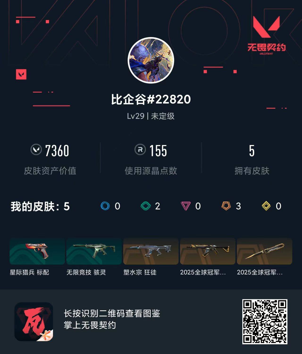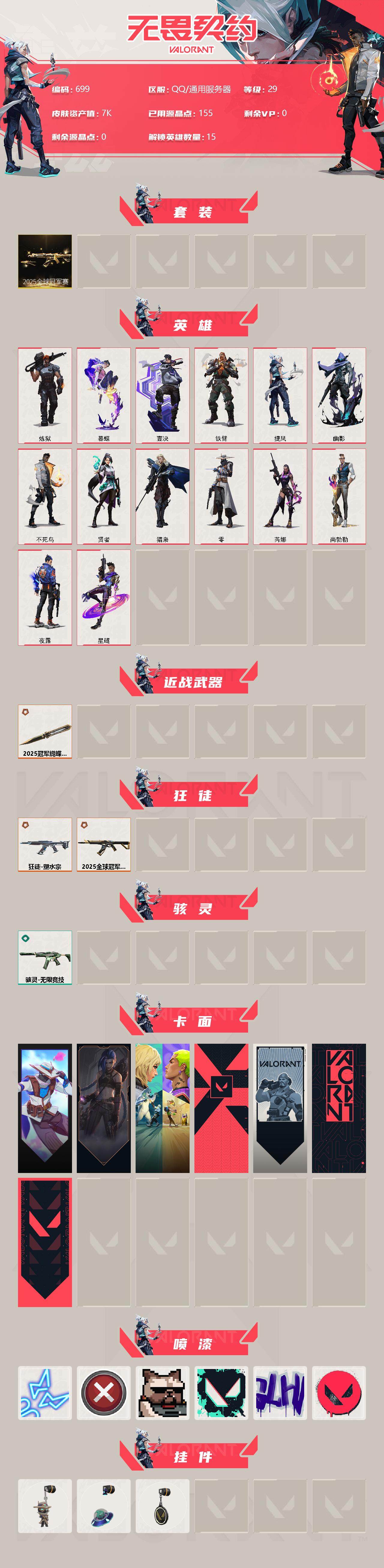 [12810095]【套装】:2025全球冠军赛套装 【英雄】:炼狱,暮蝶,壹决,铁臂,捷风,幽影,不死鸟,贤者,猎枭,零,芮娜,尚勃勒,夜露,星礈 【近战 武器】:近战武器-2025全球冠军赛 蝴蝶刀 【狂徒】:狂徒-2025全球冠军赛,狂徒-塑水宗 【骇灵】:骇灵-无限竞技 【卡面】:无畏契约GO!第一卷:零 卡面,《双城之战》金克丝 卡面,钢锁vs盖可 卡面,代号红色 卡面,新兵报到 卡面,V契约 卡面,无畏契约 卡面 【喷漆】:霓光四射 喷漆,买装还是存钱 喷漆,关门放狗 喷漆,胜利属于无畏契约 喷漆,GLHF 喷漆,无畏契约 喷漆 【挂饰】:无畏契约GO!第一卷 零 挂饰,天外飞客 挂饰,无畏契约 纪念币 挂饰