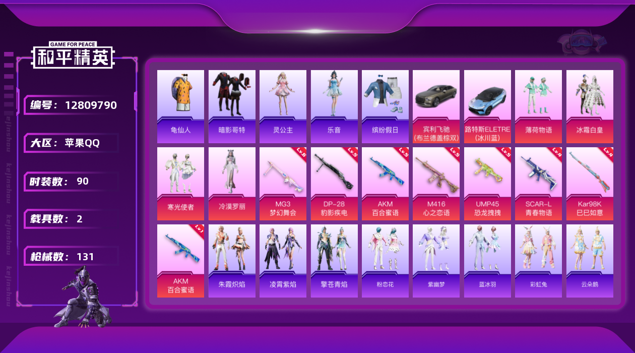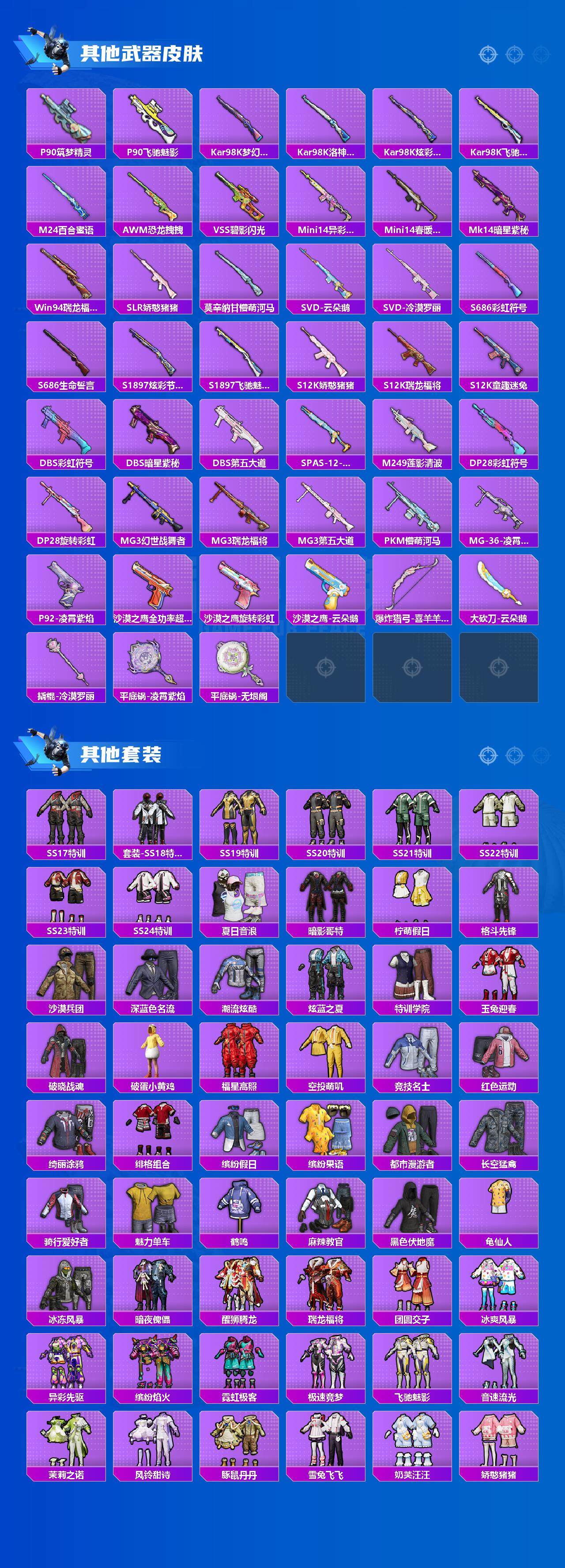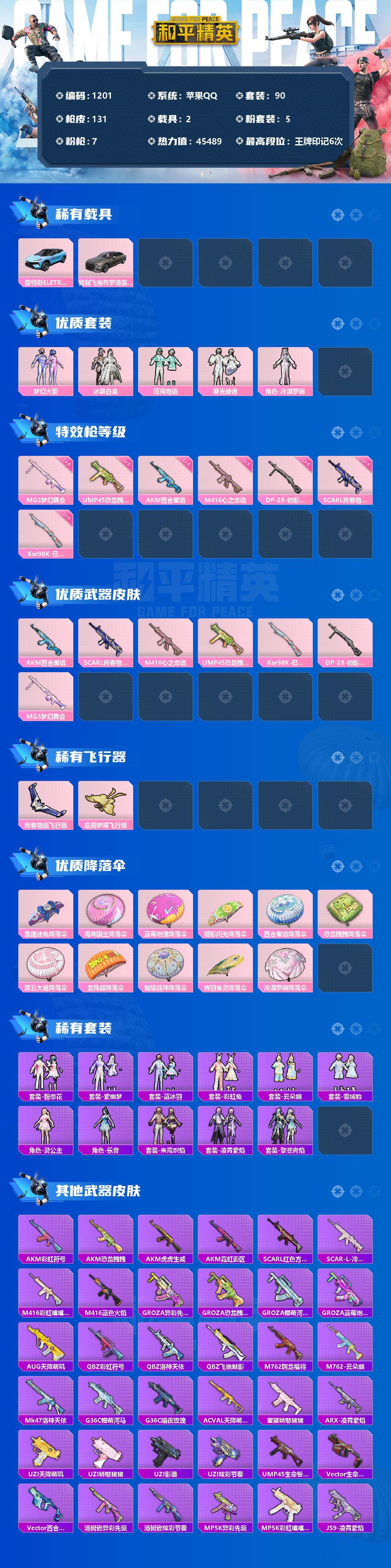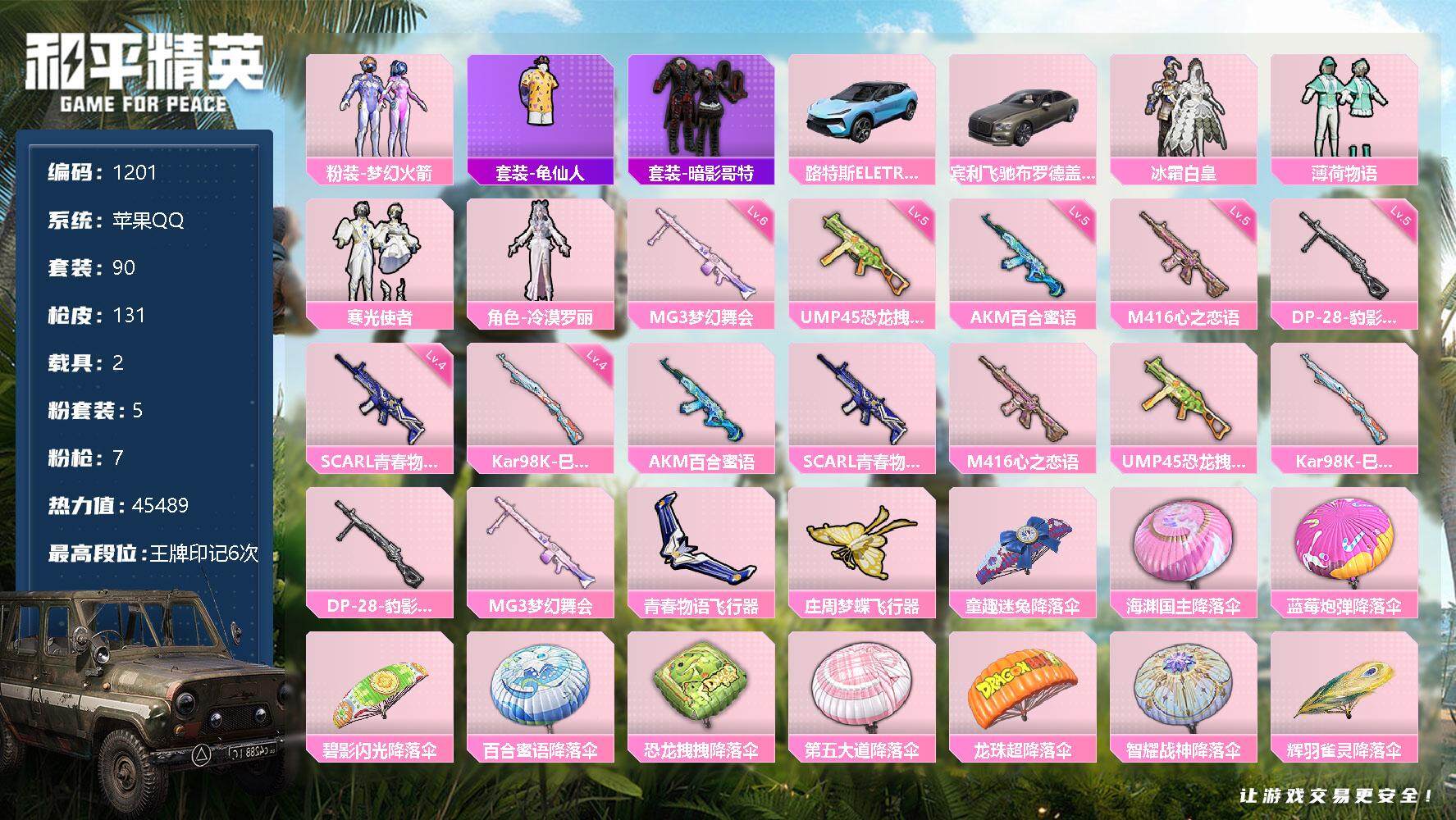 [12809790]苹果 手Q-5粉装-7特效枪-2载具-3粉色飞行器-45489热力值-6王牌印记-90套装-131枪皮 【热门品类】:粉装-梦幻火箭,套装-龟仙人,套装-暗影哥特 【粉色载具】:路特斯ELETRE(冰川蓝),宾利飞驰(布罗德盖棕双色) 【粉色套装】:粉装-梦幻火箭,粉装-冰霜白皇,粉装-薄荷物语,粉装-寒光使者,角色-冷漠罗丽 【粉色枪皮等级】:AKM-百合蜜语(五级),SCAR-L-青春物语(四级),M416-心之恋语(五级),UMP45-恐龙拽拽(五级),Kar98K-巳巳如意(四级),DP-28-豹影疾电(五级),MG3-梦幻舞会(六级) 【粉色枪皮】:AKM-百合蜜语,SCAR-L-青春物语,M416-心之恋语,UMP45-恐龙拽拽,Kar98K-巳巳如意,DP-28-豹影疾电,MG3-梦幻舞会 【粉色飞行器】:青春物语飞行器,庄周梦蝶飞行器 【粉色降落伞】:童趣迷兔降落伞,海渊国主降落伞,蓝莓炮弹降落伞,碧影闪光降落伞,百合蜜语降落伞,恐龙拽拽降落伞,第五大道降落伞,龙珠超降落伞,智耀战神降落伞,辉羽雀灵降落伞,冷漠罗丽降落伞 【稀有套装】:套装-龟仙人,套装-粉恋花,套装-紫幽梦,套装-蓝冰羽,套装-彩虹兔,套装-云朵鹅,套装-雪绒豹,角色-灵公主,角色-乐音,套装-朱霞炽焰,套装-凌霄紫焰,套装-擎苍青焰 【稀有枪皮】:AKM-彩虹符号,AKM-恐龙拽拽,AKM-虎虎生威,AKM-霓虹街区,SCAR-L-红色方程式,SCAR-L-冷漠罗丽,M416-彩虹嘻嘻猴,M416-蓝色火焰,GROZA-异彩先驱,GROZA-恐龙拽拽,GROZA-懵萌河马,GROZA-蓝莓炮弹,AUG-天降萌叽,QBZ-彩虹符号,QBZ-洛神天依,QBZ-飞驰魅影,M762-瑞龙福将,M762-云朵鹅,Mk47-洛神天依,G36C-懵萌河马,G36C-暗夜玫瑰,AC-VAL-天降萌叽,蜜獾-娇憨猪猪,ARX-凌霄紫焰,UZI-天降萌叽,UZI-娇憨猪猪,UZI-影袭,UZI-炫彩节奏,UMP45-生命誓言,Vector-生命誓言,Vector-百合蜜语,汤姆逊-异彩先驱,汤姆逊-炫彩节奏,MP5K-异彩先驱,MP5K-彩虹嘻嘻猴,JS9-凌霄紫焰,P90-筑梦精灵,P90-飞驰魅影,Kar98K-梦幻火箭,Kar98K-洛神天依,Kar98K-炫彩节奏,Kar98K-飞驰魅影,