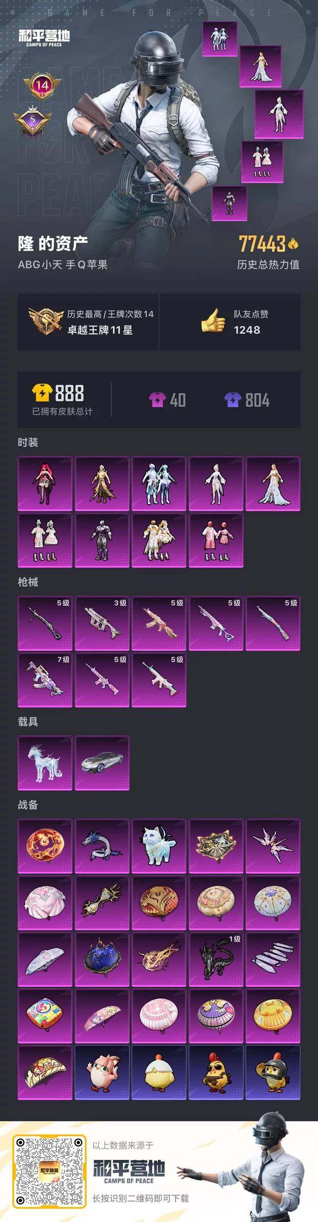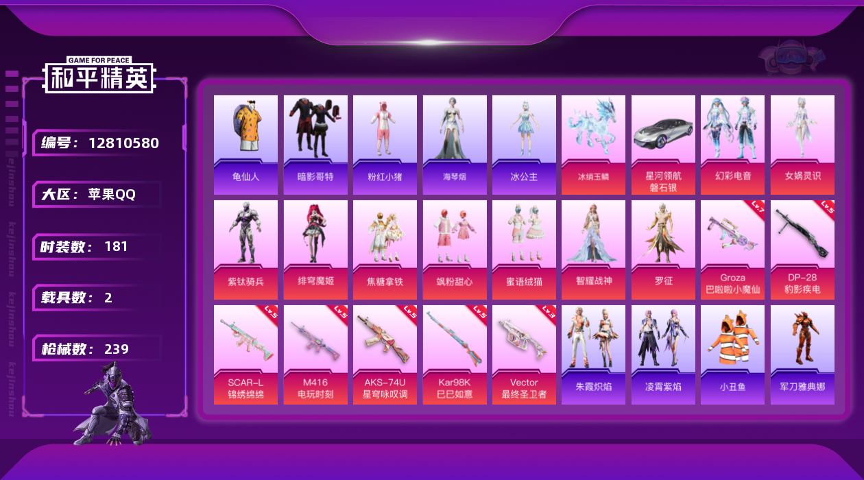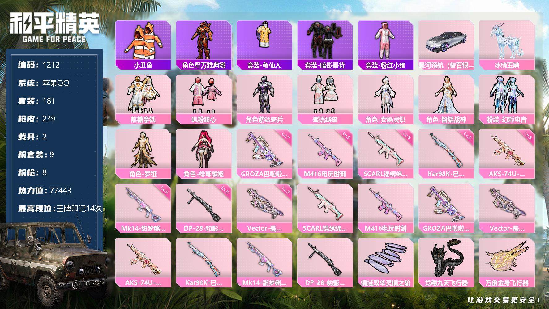 [12810580]苹果 手Q-9粉装-8特效枪-2载具-7粉色飞行器-77443热力值-14王牌印记-181套装-239枪皮