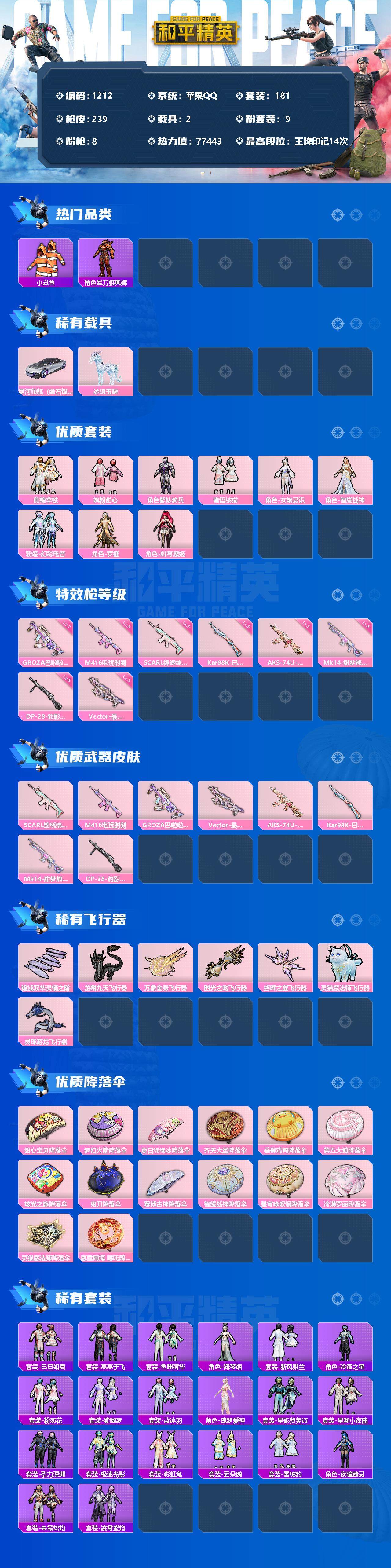 [12810580]苹果 手Q-9粉装-8特效枪-2载具-7粉色飞行器-77443热力值-14王牌印记-181套装-239枪皮 【热门品类】:套装-小丑鱼,角色-军刀雅典娜,套装-龟仙人,套装-暗影哥特,套装-粉红小猪 【粉色载具】:星河领航(磐石银),冰绡玉鳞 【粉色套装】:粉装-焦糖拿铁,粉装-飒粉甜心,角色-紫钛骑兵,粉装-蜜语绒猫,角色-女娲灵识,角色-智耀战神,粉装-幻彩电音,角色-罗征,角色-绯穹魔姬 【粉色枪皮等级】:SCAR-L-锦绣绵绵(五级),M416-电玩时刻(五级),GROZA-巴啦啦小魔仙(七级),Vector-最终圣卫者(三级),AKS-74U-星穹咏叹调(五级),Kar98K-巳巳如意(五级),Mk14-甜梦熊击(五级),DP-28-豹影疾电(五级) 【粉色枪皮】:SCAR-L-锦绣绵绵,M416-电玩时刻,GROZA-巴啦啦小魔仙,Vector-最终圣卫者,AKS-74U-星穹咏叹调,Kar98K-巳巳如意,Mk14-甜梦熊击,DP-28-豹影疾电 【粉色飞行器】:镜域双华-灵镜之阶,龙翔九天飞行器,万象金身飞行器,时光之吻飞行器,终晖之翼飞行器,灵猫魔法师飞行器,灵珠游龙飞行器 【粉色降落伞】:甜心宝贝降落伞,梦幻火箭降落伞,夏日绵绵冰降落伞,齐天大圣降落伞,垂柳戏鸭降落伞,第五大道降落伞,炫光之旅降落伞,鬼刀降落伞,赛博古神降落伞,智耀战神降落伞,星穹咏叹调降落伞,冷漠罗丽降落伞,灵猫魔法师降落伞,魔童闹海 哪吒降落伞 【稀有套装】:套装-龟仙人,套装-巳巳如意,套装-燕燕于飞,套装-鱼渊荷华,角色-海琴烟,套装-新风雅兰,角色-冷霜之星,套装-粉恋花,套装-紫幽梦,套装-蓝冰羽,角色-瑰梦爱神,套装-星影赞美诗,套装-星渊小夜曲,套装-引力深渊,套装-极速光影,套装-彩虹兔,套装-云朵鹅,套装-雪绒豹,角色-夜瞳黯灵,套装-朱霞炽焰,套装-凌霄紫焰 【稀有枪皮】:AKM-彩虹符号,AKM-灼热熔岩,AKM-环太平洋,AKM-破晓战魂,AKM-虎虎生威,AKM-龙的传人,AKM-灵猫魔法师,M16A4-幻世战舞者,M16A4-甜心亚梦,M16A4-蓝色火焰,SCAR-L-炫彩节奏,SCAR-L-玉兔迎春,SCAR-L-甜蜜誓约,SCAR-L-红色方程式,M416-糯团青竹,M416-红色方程式,M416-绯红前夜,M416-蓝色火焰,GROZA-异