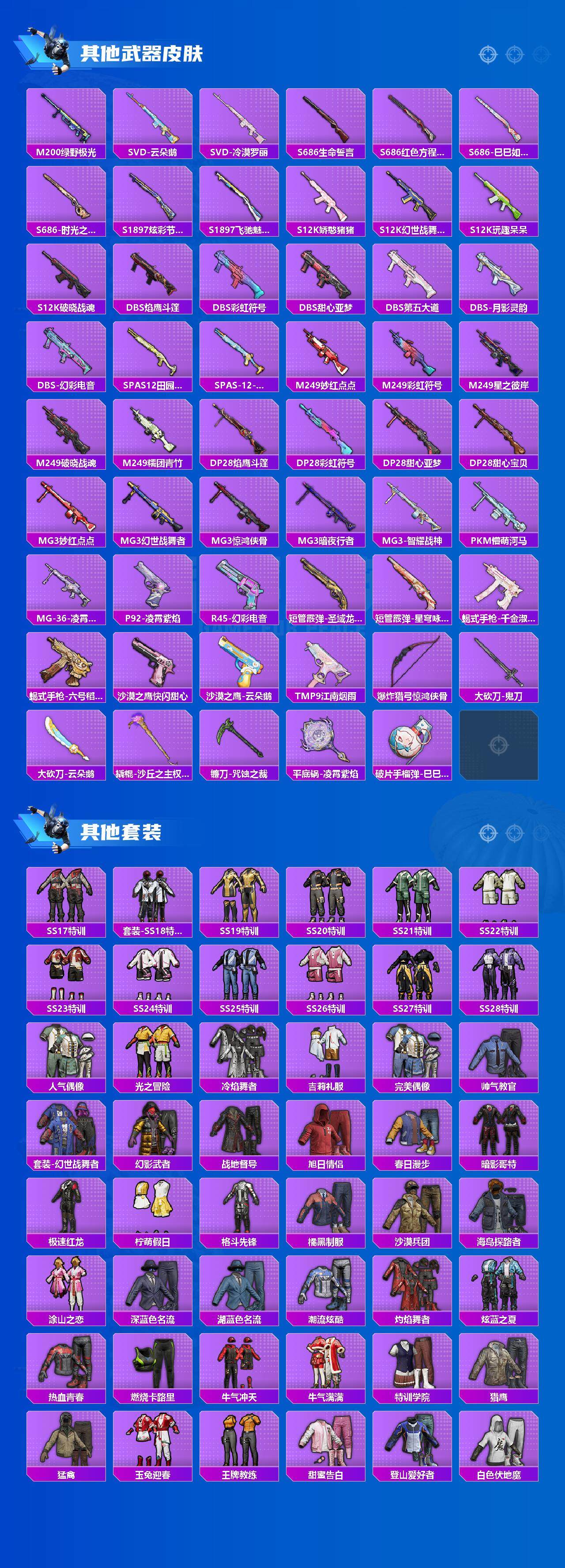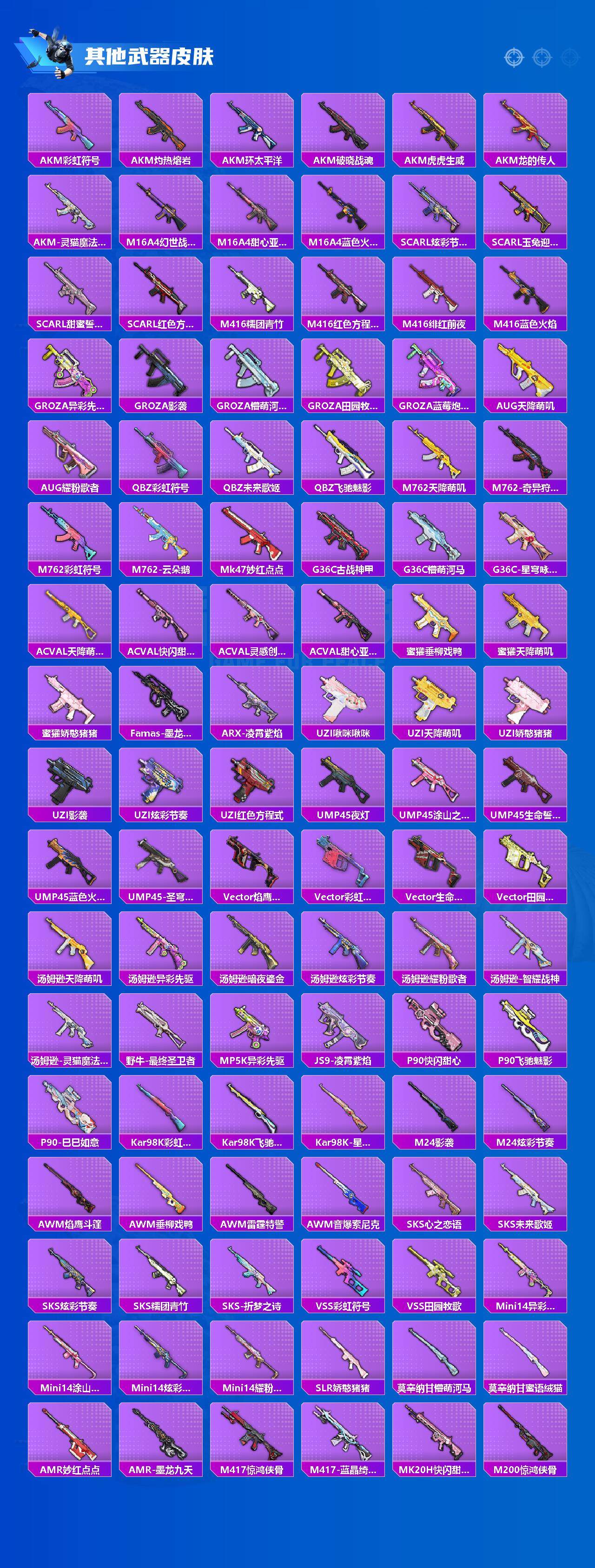 【稀有枪皮】:AKM-彩虹符号,AKM-灼热熔岩,AKM-环太平洋,AKM-破晓战魂,AKM-虎虎生威,AKM-龙的传人,AKM-灵猫魔法师,M16A4-幻世战舞者,M16A4-甜心亚梦,M16A4-蓝色火焰,SCAR-L-炫彩节奏,SCAR-L-玉兔迎春,SCAR-L-甜蜜誓约,SCAR-L-红色方程式,M416-糯团青竹,M416-红色方程式,M416-绯红前夜,M416-蓝色火焰,GROZA-异