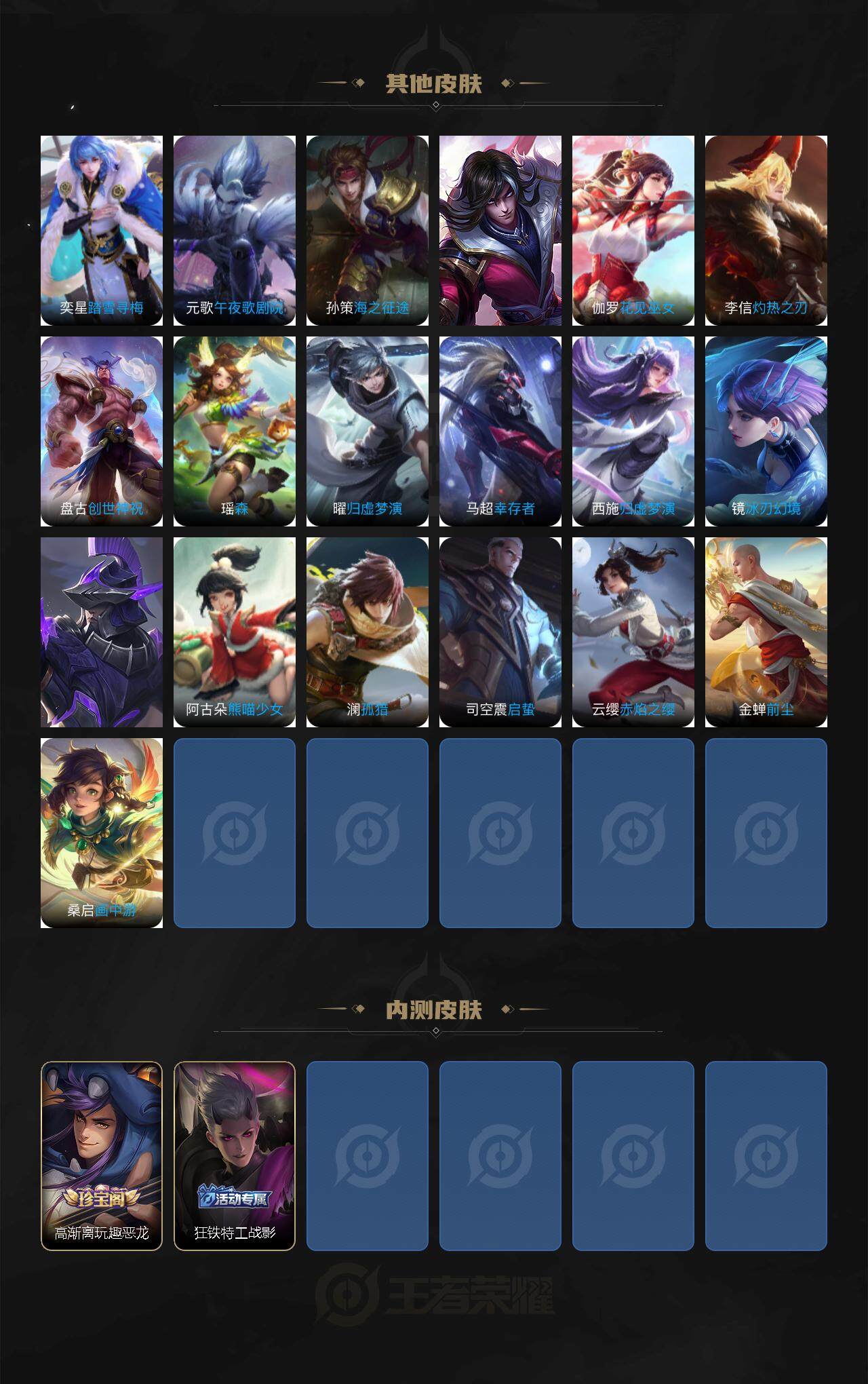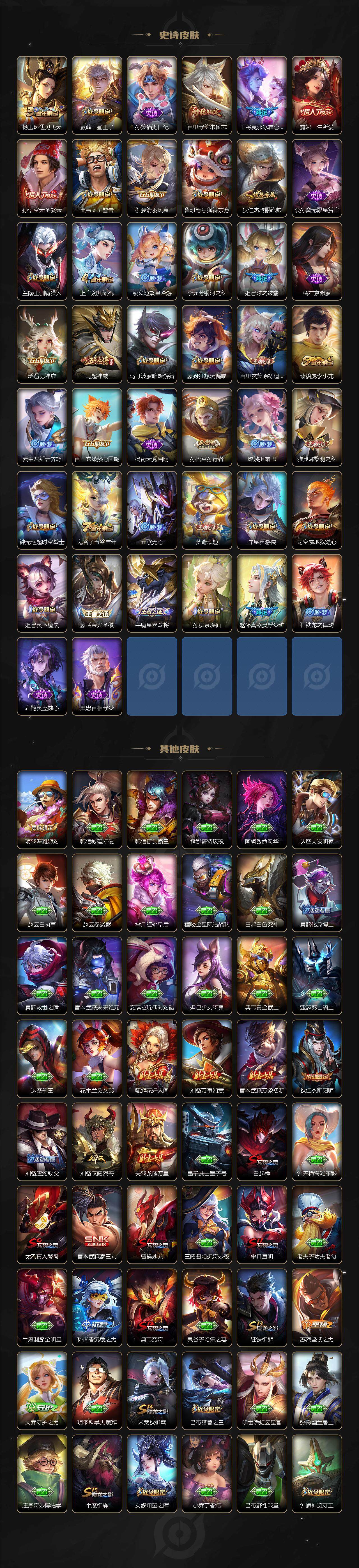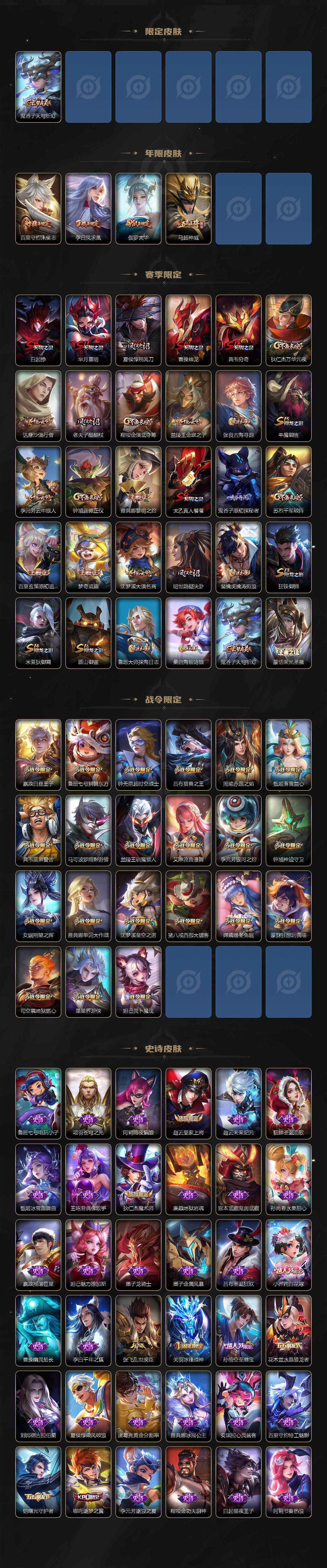【限定皮肤】:白起狰,狄仁杰阴阳师,小乔纯白花嫁,赵云皇家上将,妲己时之彼端,嬴政白昼王子,孙尚香异界灵契,鲁班七号狮舞东方,高渐离玩趣恶龙,钟无艳超时空战士,芈月重明,吕布猎兽之王,周瑜赤莲之焰,元歌无心,夏侯惇朔风刀,甄姬落雪兰心,曹操烛龙,典韦穷奇,典韦蓝屏警告,马可波罗暗影游猎,狄仁杰魔术师,狄仁杰万华元夜,达摩沙漠行僧,项羽海滩派对,老夫子醍醐杖,关羽冰锋战神,程咬金演武夺筹,露娜一生所爱,兰陵王驯魔猎人,兰陵王金庭之子,孙悟空至尊宝,孙悟空大圣娶亲,孙悟空孙行者,牛魔御旌,李元芳银河之约,李元芳云中旅人,虞姬启明星使,钟馗神迹守卫,钟馗驱傩正仪,杨玉环遇见飞天,女娲朔望之晖,哪吒逐梦之翼,干将莫邪冰霜恋舞曲,雅典娜单词大作战,雅典娜黎明之约,蔡文姬繁星吟游,太乙真人饕餮,鬼谷子原初探秘者,鬼谷子五谷丰年,苏烈千军破阵,百里玄策原初追逐者,百里守约朱雀志,弈星混沌棋,梦奇顽趣,沈梦溪星空之诺,沈梦溪大漠名商,明世隐疑决卦,裴擒虎李小龙,裴擒虎擒涛扼浪,狂铁御狮,米莱狄御霄,云中君纤云弄巧,伽罗太华,盾山御銮,猪八戒西部大镖客,上官婉儿梁祝,嫦娥拒霜思,嫦娥暖冬兔眠,蒙犽狂想玩偶喵,鲁班大师探海日志,桑启海盐诗旅,夏洛特浮生妄,暃星界游侠,艾琳流音漫舞,司空震地狱燃心,张良古海寻踪,蒙恬荣光圣徽,妲己灵卜魔法,鬼谷子天穹祈灯